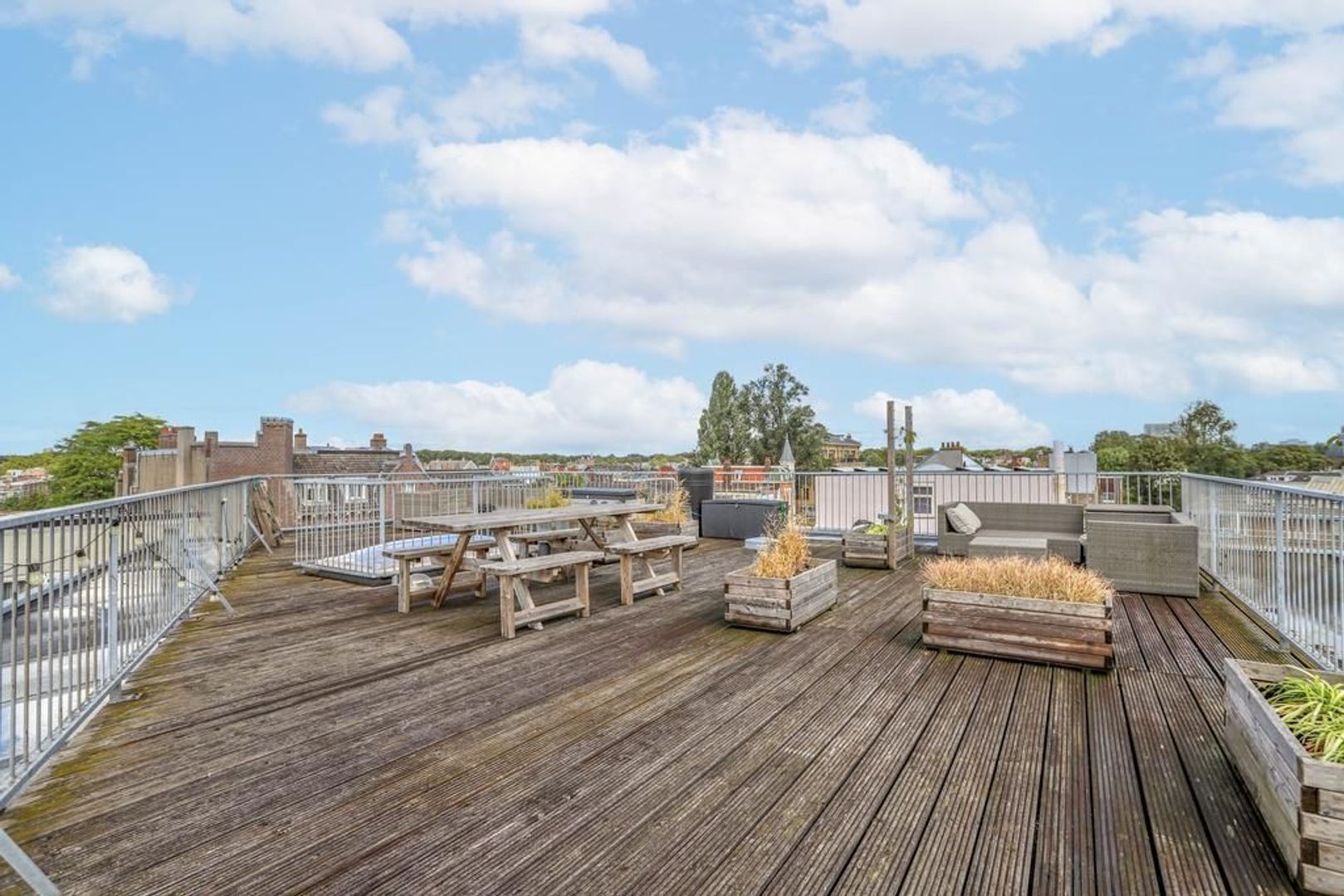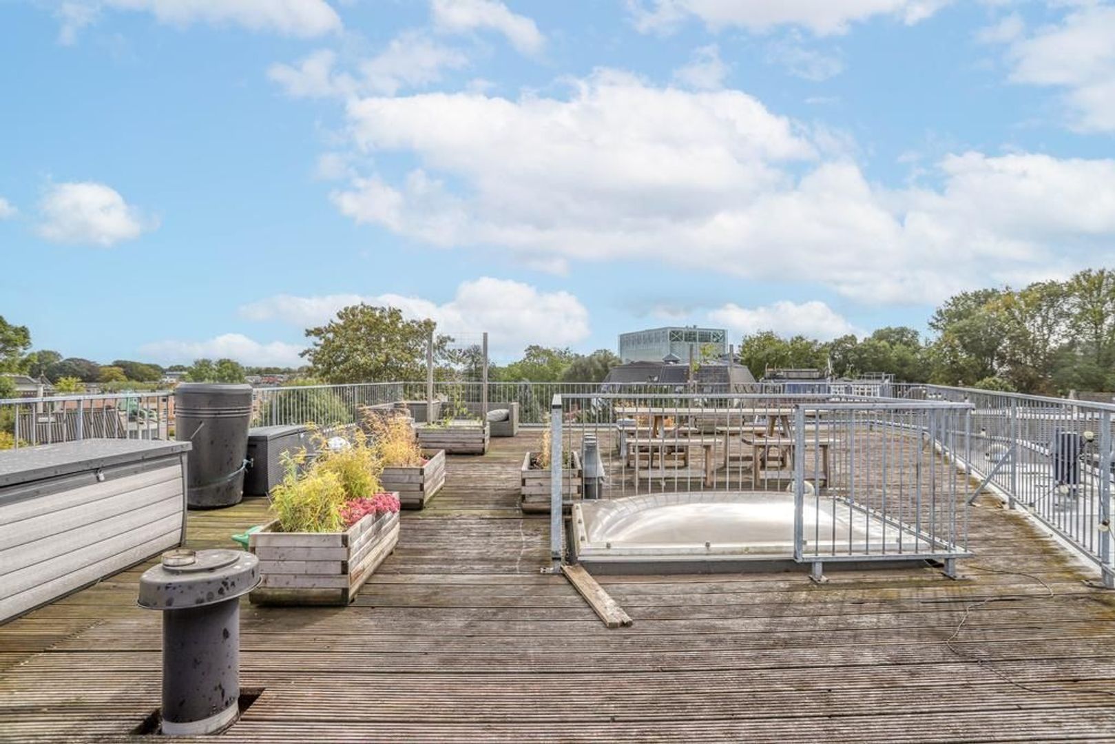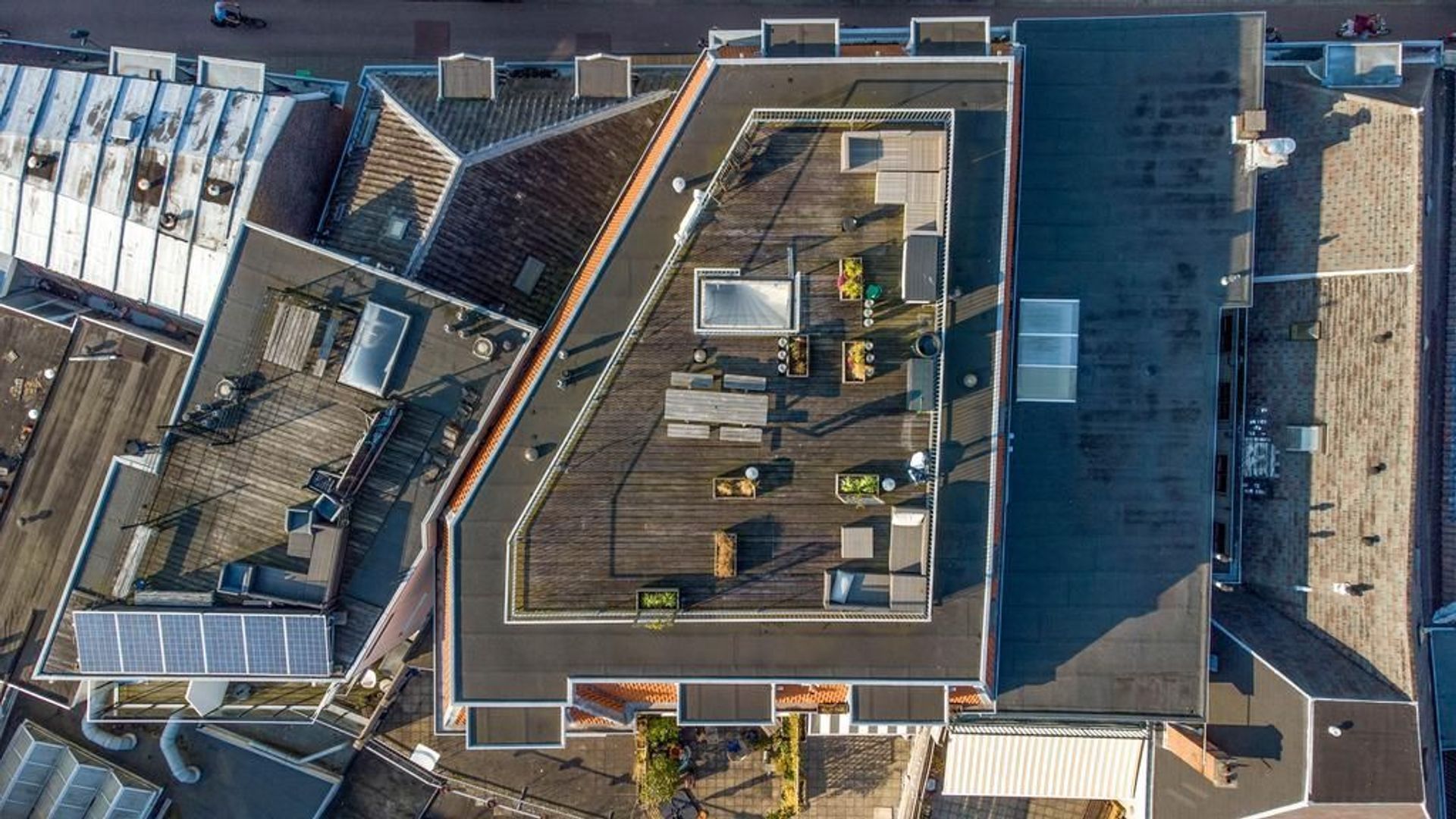 Boven op het pand waarin de woning zich bevindt, is een waanzinnig dakterras aanwezig. Het dakterras wordt gedeeld met andere bewoners van het complex en bereik je door slechts één trap omhoog te nemen. Deze buitenruimte is ingedeeld met loungeset, picknicktafels en plantenbakken en biedt de mogelijk om op deze heerlijke locatie te genieten van de zon en het uitzicht.