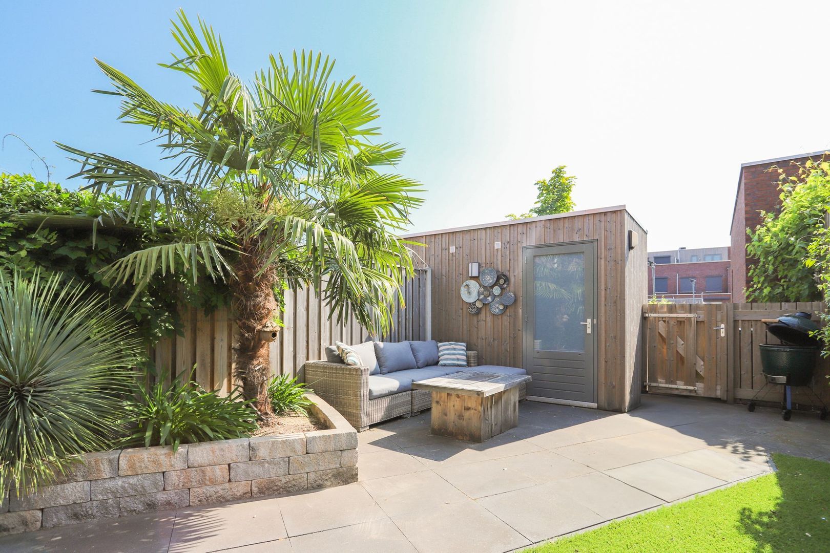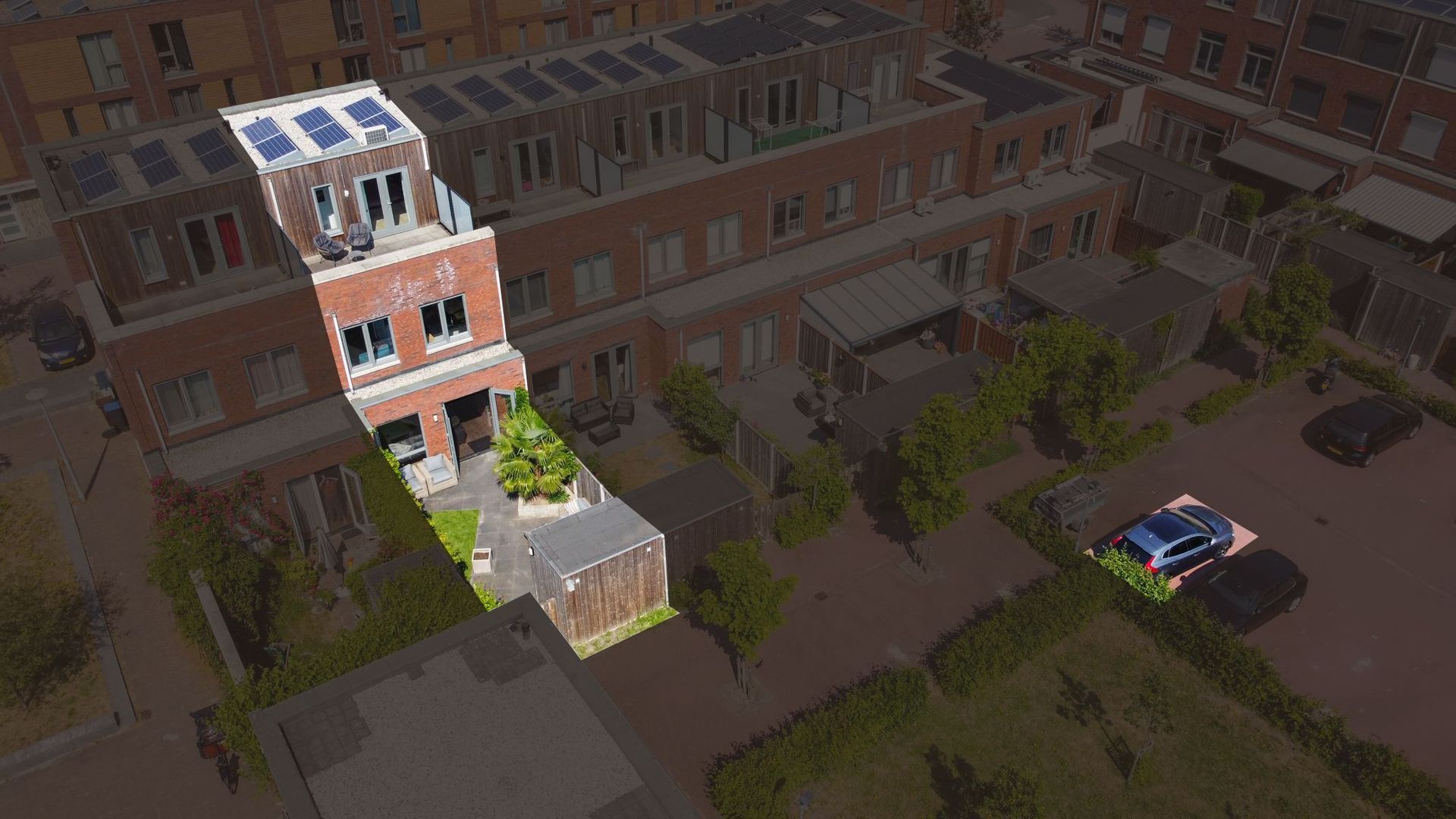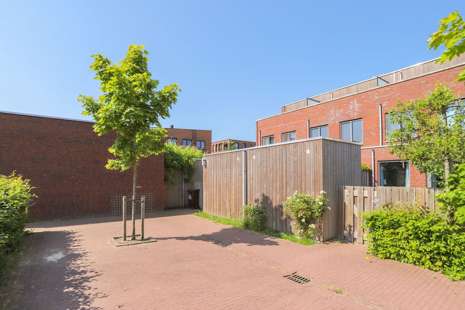 The garden can be entered through the patio doors in the living room and is located on the east. This is beautifully landscaped with a nice combination of terrace and greenery, making it a good place to stay. In the summer, the sun is present here from early in the morning until the end of the afternoon. In addition, the garden is equipped with a practical storage room and a back entrance. The back opens onto a shared courtyard with a private parking space. This courtyard is closed and you share it with the neighbours, for which a VvE has been established. Everything is well maintained, a few times a year even a gardener comes by. The periodic contribution for this is currently €30.50 per month.