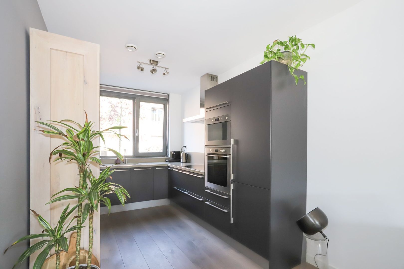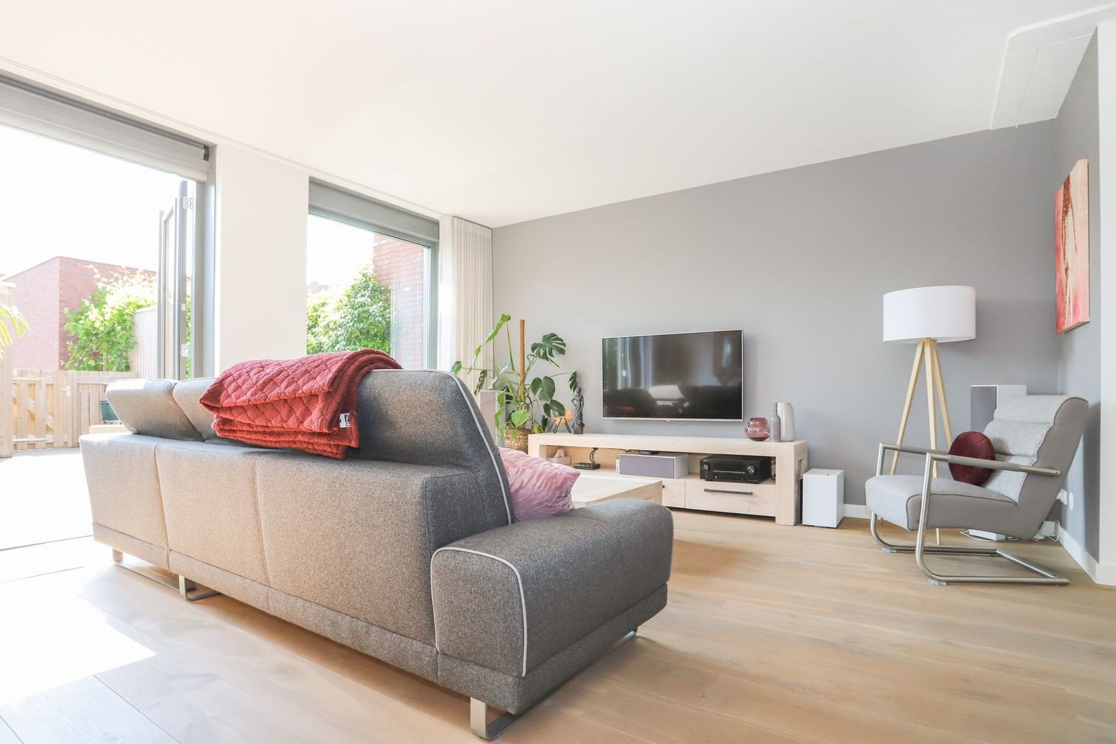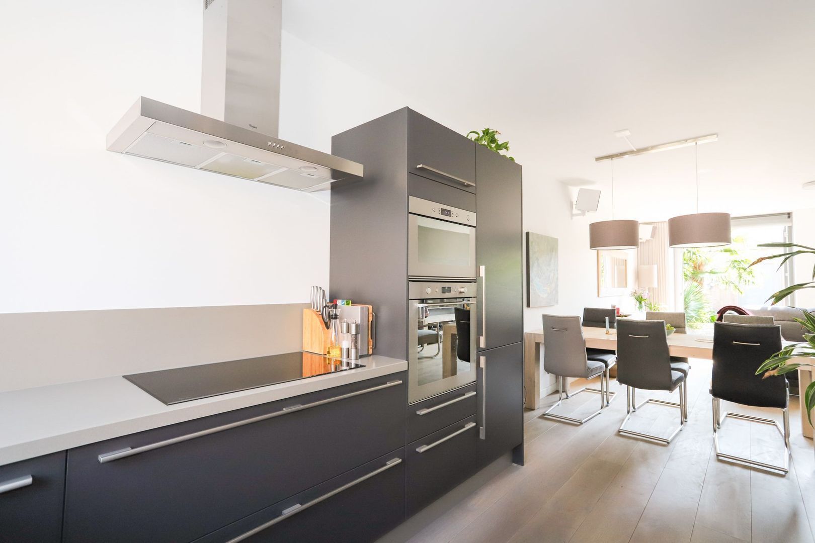 Ground floor: Hall with meter cupboard, stairs to the first floor, toilet and access to the living room. The living room is wonderfully light through the large windows and patio doors to the backyard. Due to the extension, the living room is also spacious, so there is enough space for a cozy sitting area and a pleasant dining area. The open kitchen is located at the front and is designed in a corner arrangement with matte, dark fronts and a slightly lighter top, which gives it a luxurious look. The kitchen is also equipped with modern appliances: 5-burner hob, stainless steel extractor hood, refrigerator, freezer, dishwasher, oven and microwave. In addition to the storage space in the kitchen itself, there is a stair cupboard which offers many possibilities.