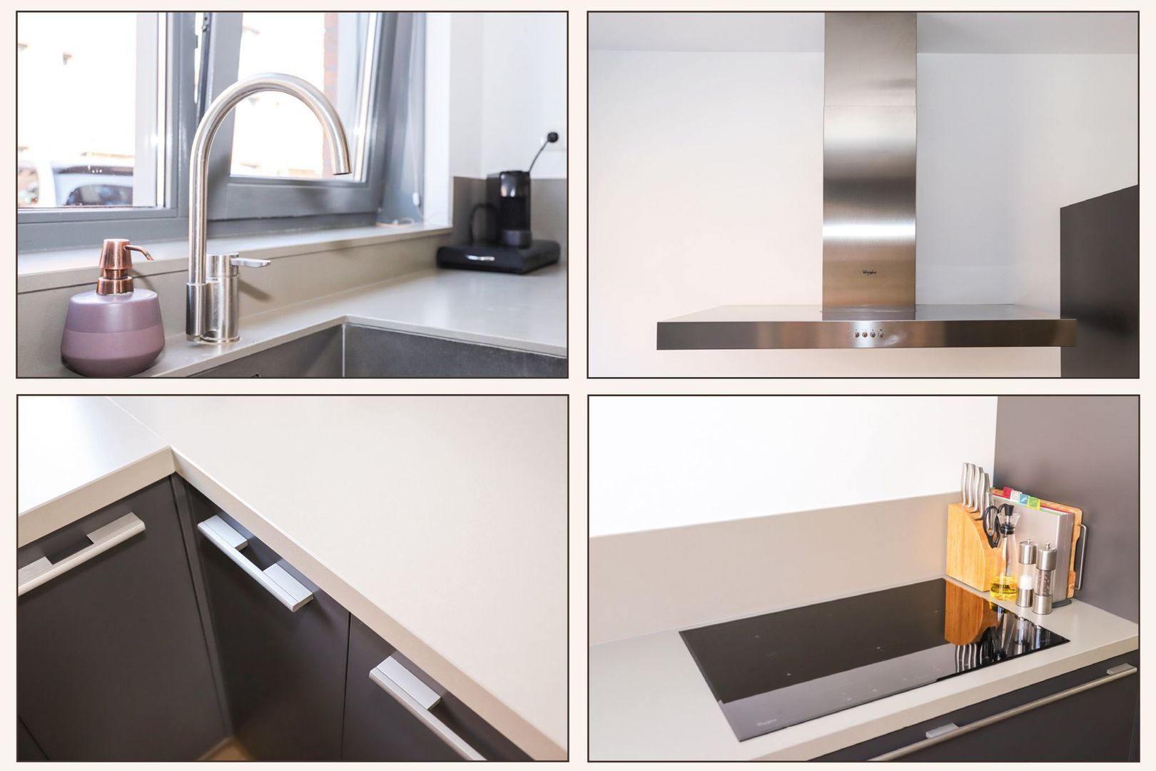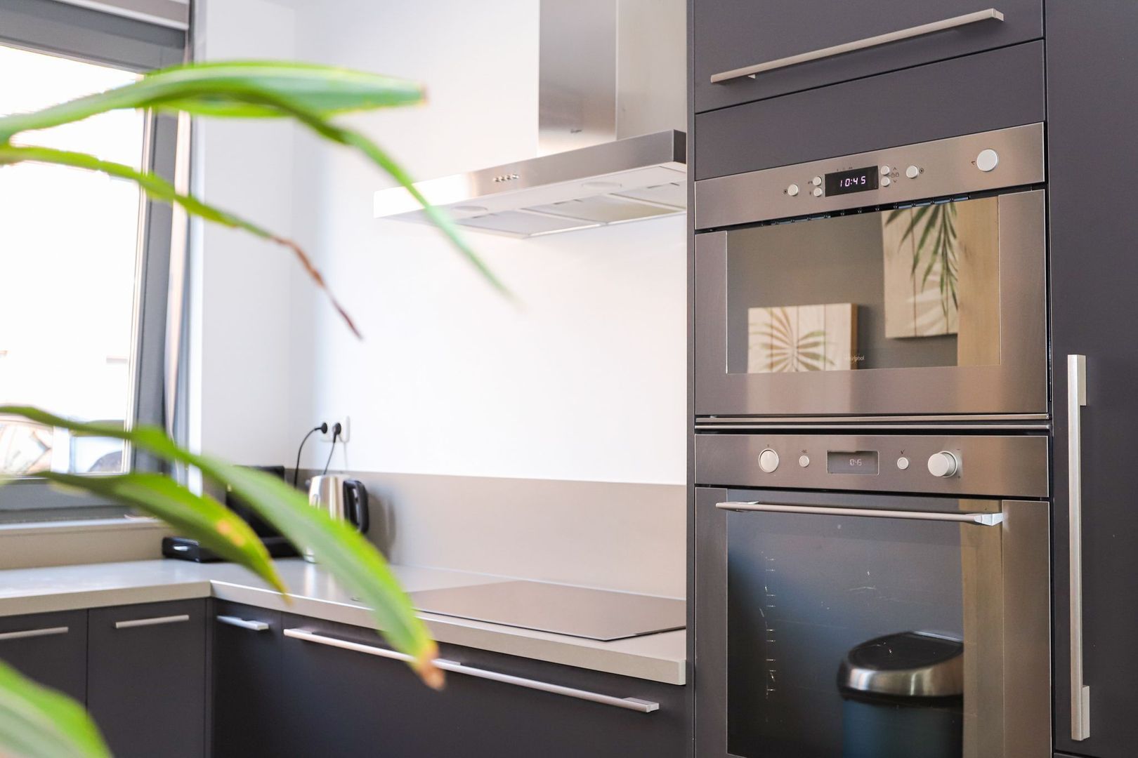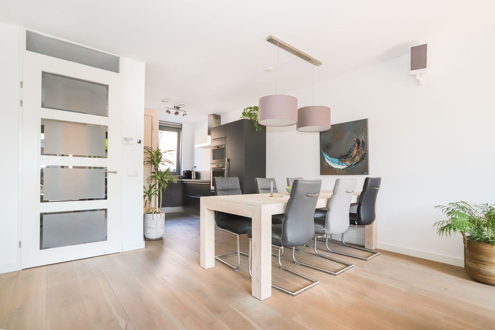 Ground floor: Hall with meter cupboard, stairs to the first floor, toilet and access to the living room. The living room is wonderfully light through the large windows and patio doors to the backyard. Due to the extension, the living room is also spacious, so there is enough space for a cozy sitting area and a pleasant dining area. The open kitchen is located at the front and is designed in a corner arrangement with matte, dark fronts and a slightly lighter top, which gives it a luxurious look. The kitchen is also equipped with modern appliances: 5-burner hob, stainless steel extractor hood, refrigerator, freezer, dishwasher, oven and microwave. In addition to the storage space in the kitchen itself, there is a stair cupboard which offers many possibilities.