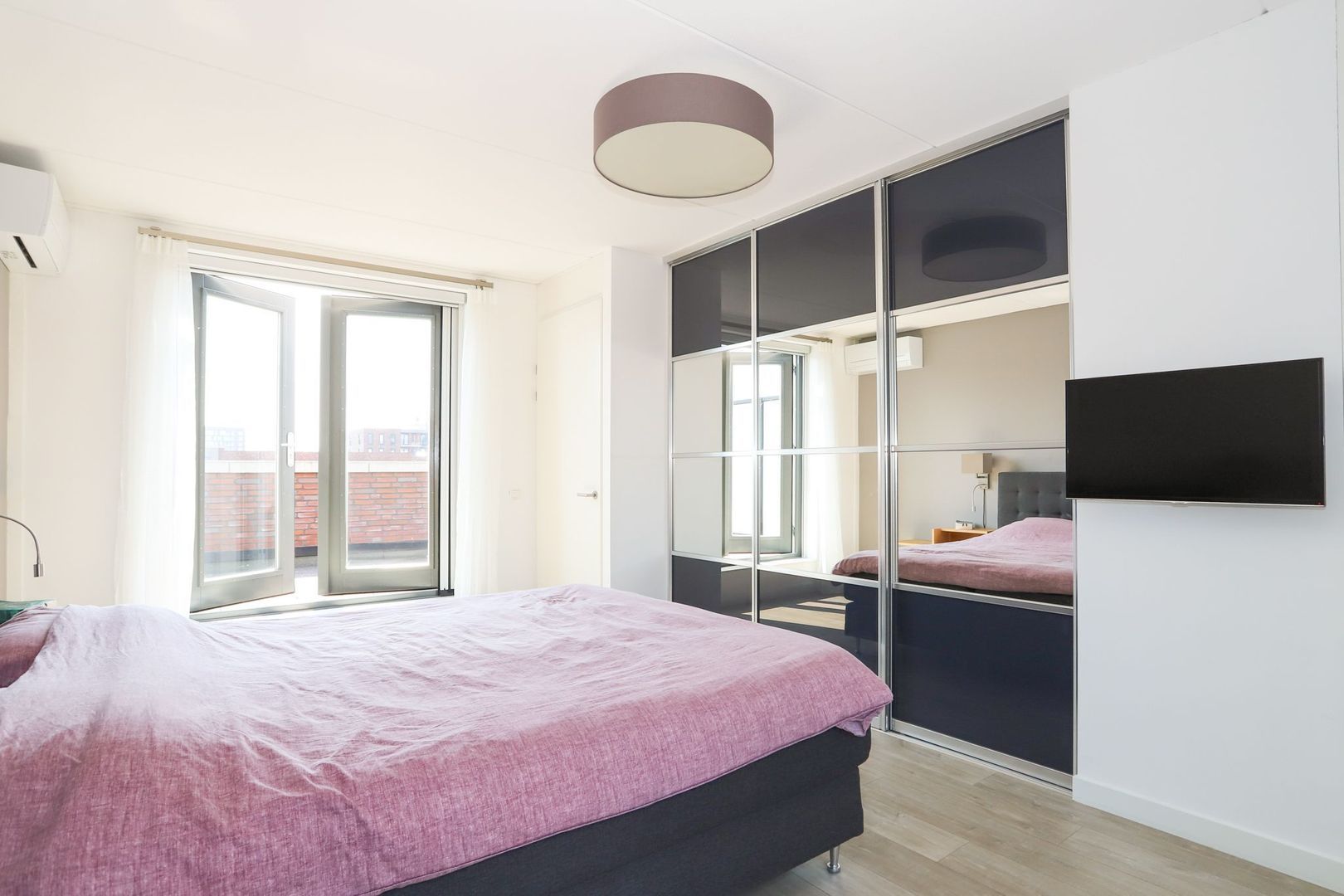 Second floor: Landing with access to the fourth bedroom. This bedroom is a real gem with its patio doors to the roof terrace, air conditioning and large closet. This bedroom also provides access to the storage room, with white goods connections. Above the closet and the landing is an extra loft, which is extremely practical as extra storage space.