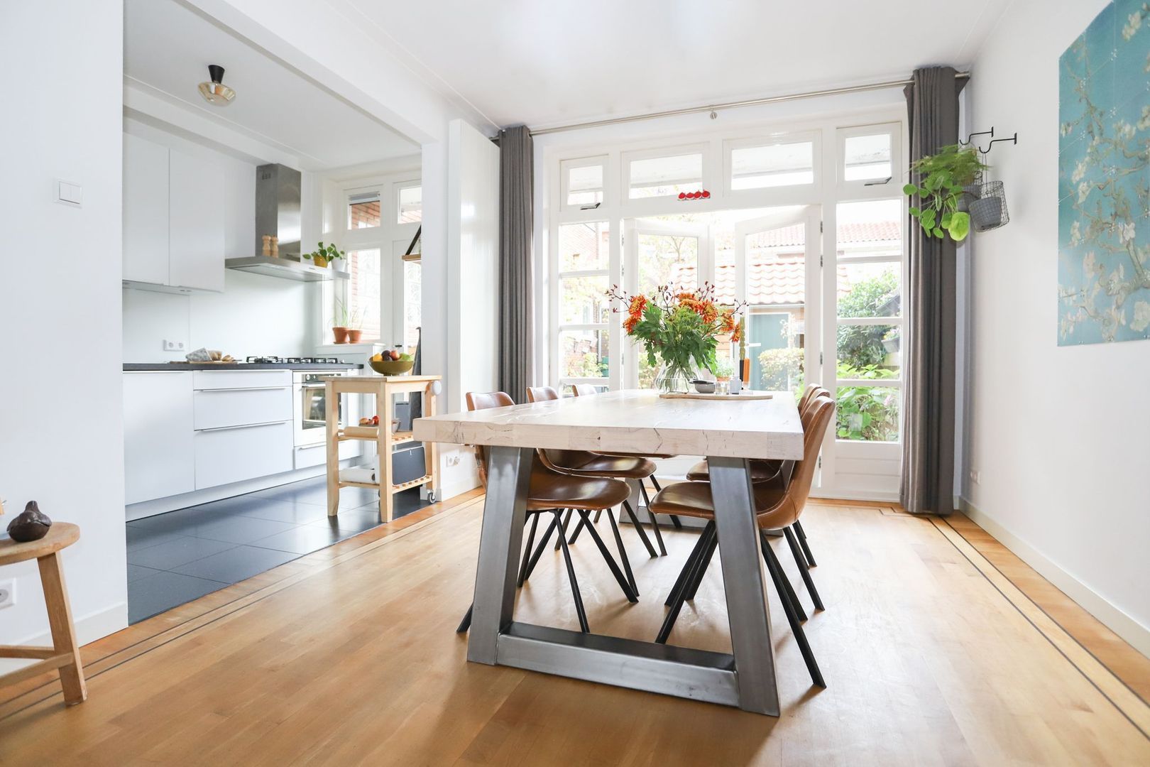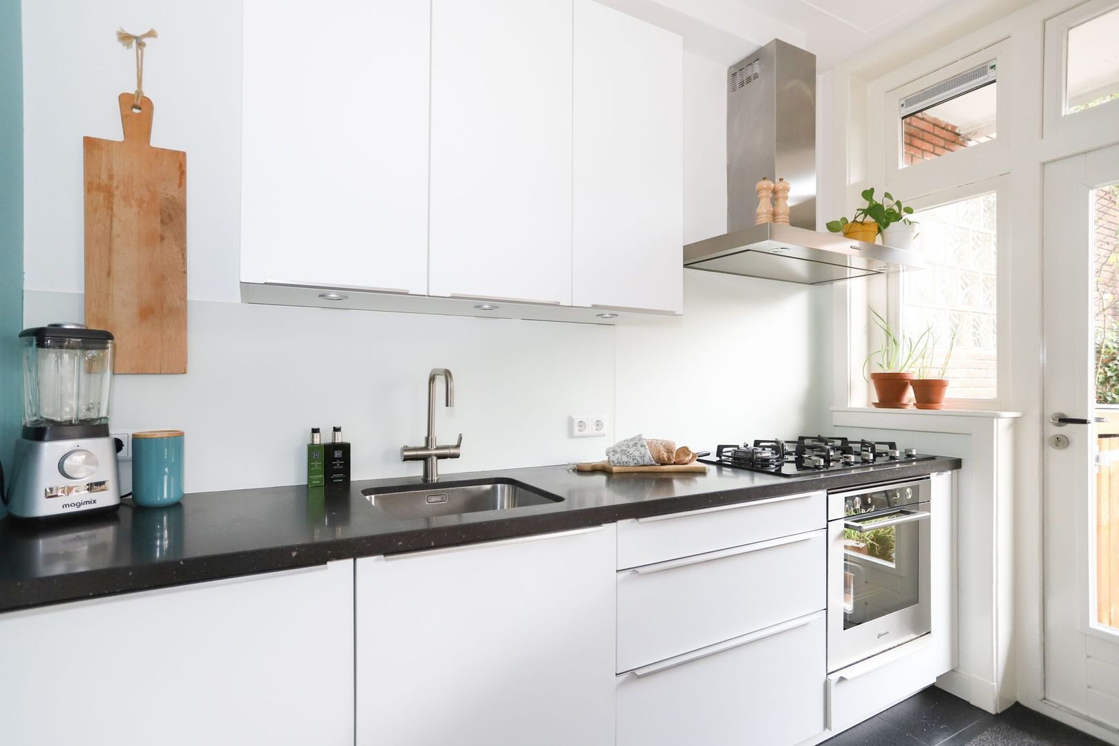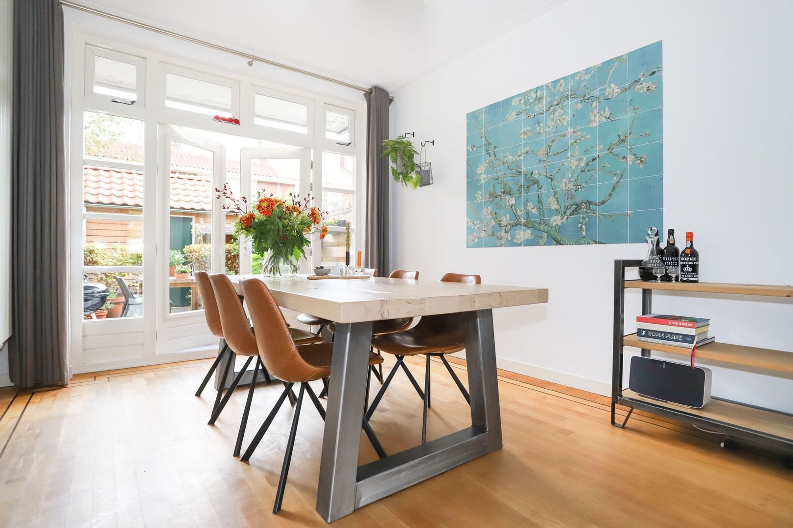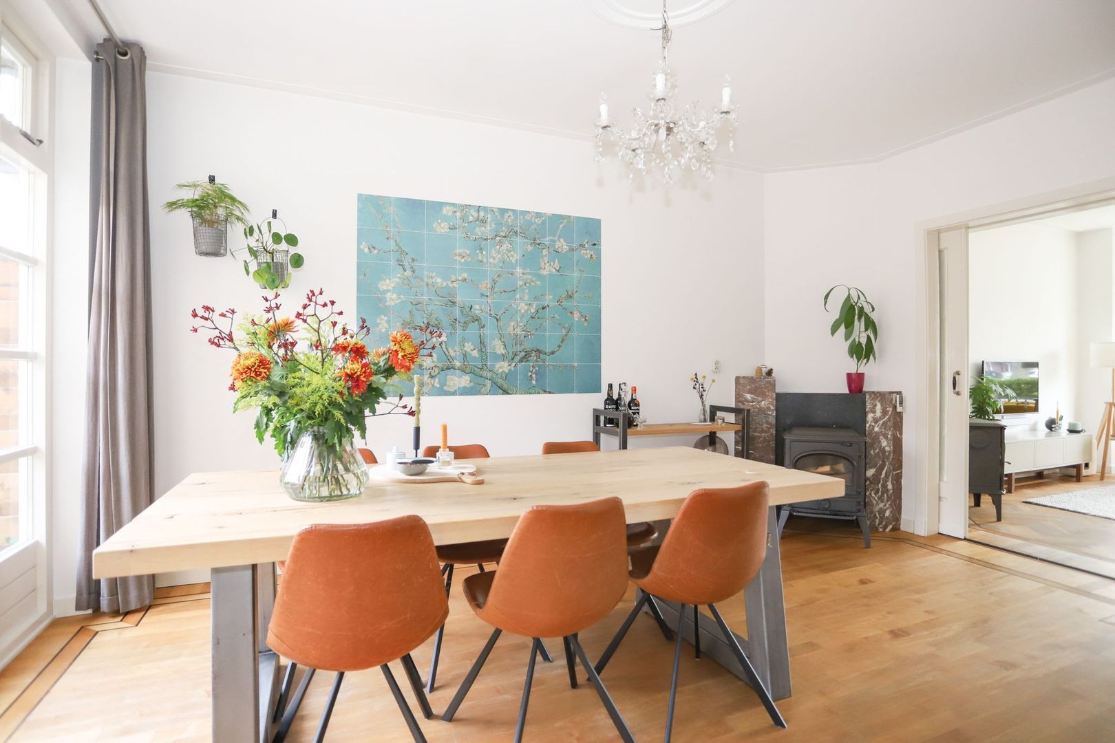 Begane grond: Zonnige voortuin, vestibule met originele Mosa tegels. Hal met trapopgang naar de eerste verdieping, (meter)kast, toiletruimte en toegang tot de woonkamer. De woonkamer wordt door middel van karakteristieke en-suite deuren gesplitst in een voor- en achterkamer. De zithoek is in de voorkamer gesitueerd, welke heerlijk licht is door de grote raampartijen en erker. De achterkamer is in gebruik als eetkamer, deze is voorzien van openslaande deuren naar de achtertuin, waardoor er veel lichtinval is. Beide kamers zijn voorzien van een authentieke vaste kast en originele schouw. De woonkamer is voorzien van een sfeervolle kachel en een prachtige vissengraatvloer met stijlvolle kenmerken en belijning. De open keuken heeft een moderne uitstraling met witte kasten, een granieten werkblad en donkere vloertegels. Verder is de keuken voorzien van Bauknecht apparatuur zoals; vaatwasser, oven, 5-pitsgasfornuis (incl. wokpit), RVS afzuigkap, Daalderop kokendwaterkraan (10 liter), koelkast en vriezer.