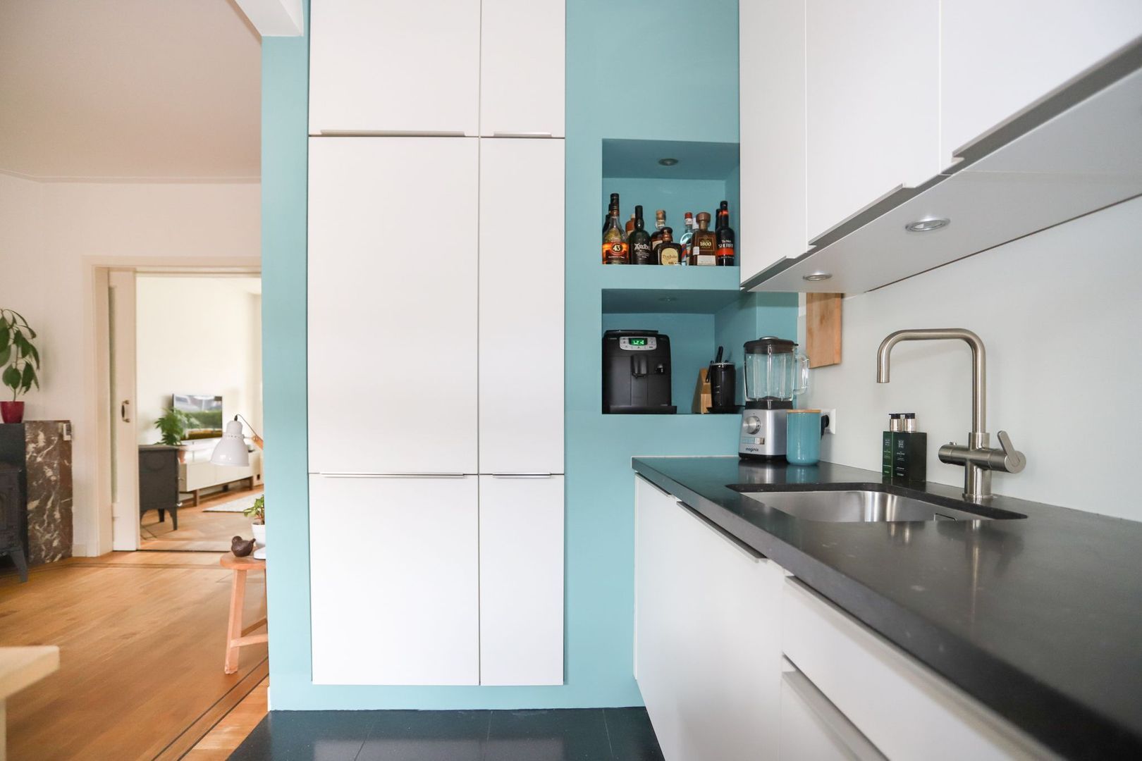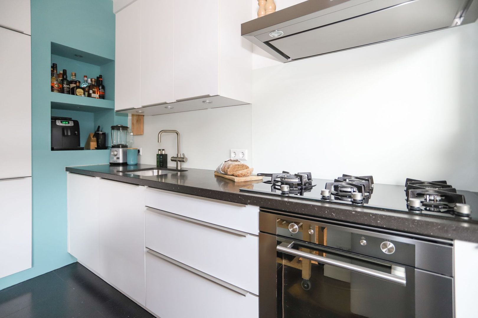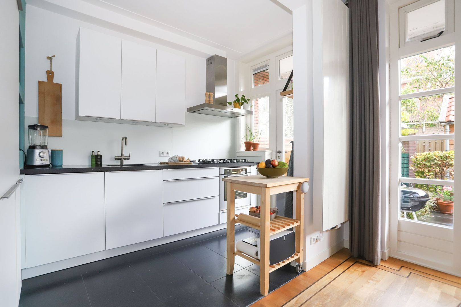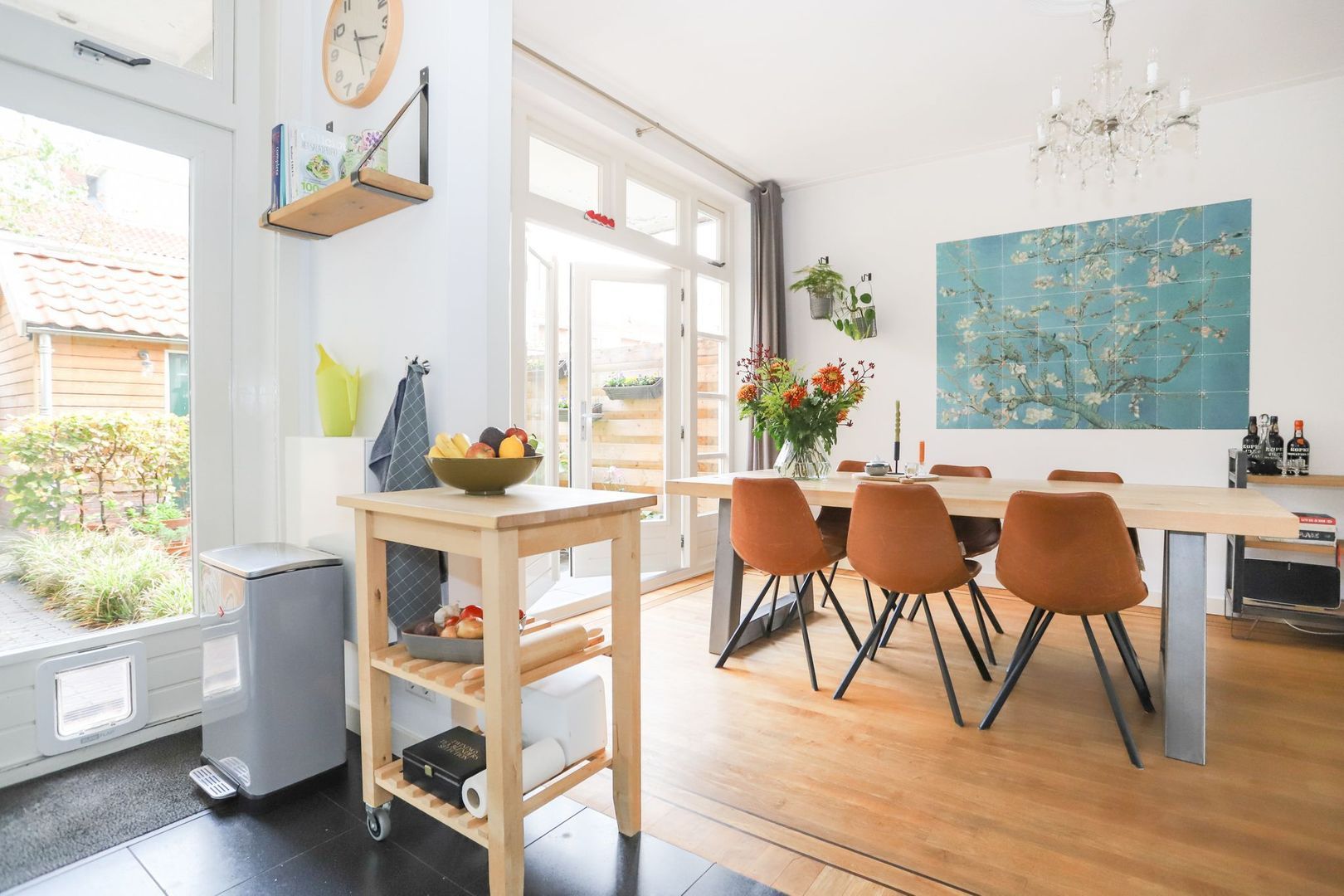 Begane grond: Zonnige voortuin, vestibule met originele Mosa tegels. Hal met trapopgang naar de eerste verdieping, (meter)kast, toiletruimte en toegang tot de woonkamer. De woonkamer wordt door middel van karakteristieke en-suite deuren gesplitst in een voor- en achterkamer. De zithoek is in de voorkamer gesitueerd, welke heerlijk licht is door de grote raampartijen en erker. De achterkamer is in gebruik als eetkamer, deze is voorzien van openslaande deuren naar de achtertuin, waardoor er veel lichtinval is. Beide kamers zijn voorzien van een authentieke vaste kast en originele schouw. De woonkamer is voorzien van een sfeervolle kachel en een prachtige vissengraatvloer met stijlvolle kenmerken en belijning. De open keuken heeft een moderne uitstraling met witte kasten, een granieten werkblad en donkere vloertegels. Verder is de keuken voorzien van Bauknecht apparatuur zoals; vaatwasser, oven, 5-pitsgasfornuis (incl. wokpit), RVS afzuigkap, Daalderop kokendwaterkraan (10 liter), koelkast en vriezer.