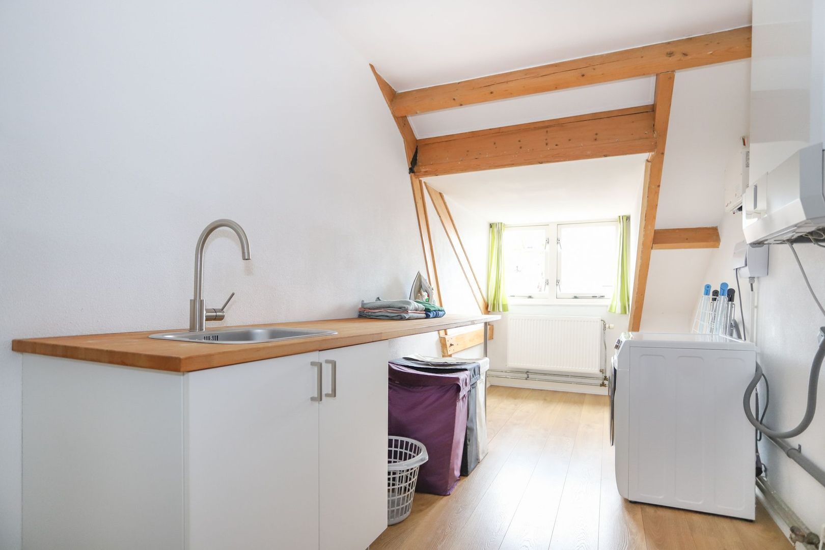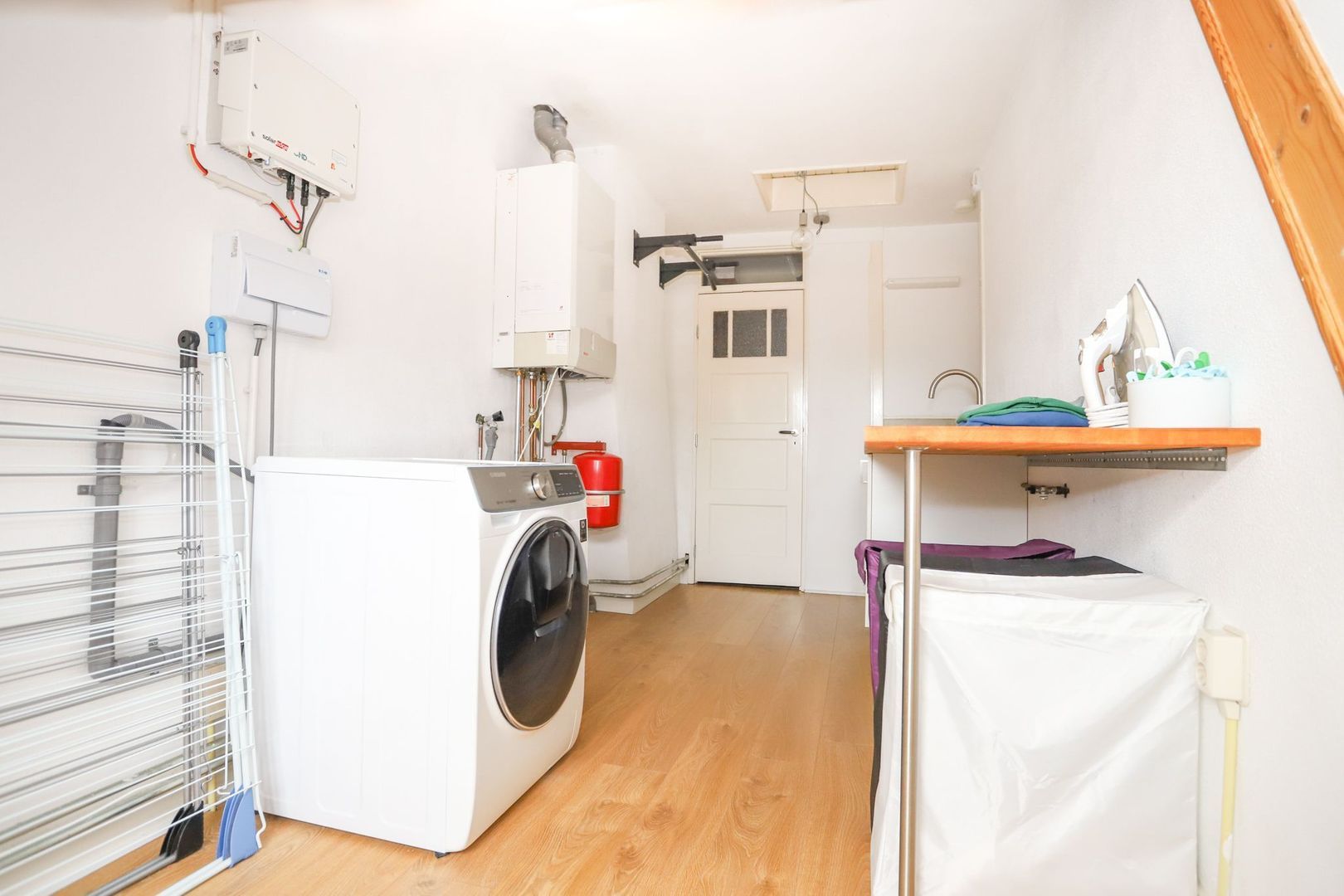 Op de overloop is een praktische wasruimte gecreëerd met keukenblok voorzien van een wasbak met warm en koud water, cv-ketel, wasmachineaansluiting en omvormer van de zonnepanelen. Er is ook een ruime berging en extra vliering met aanvullende opslagmogelijkheden.
