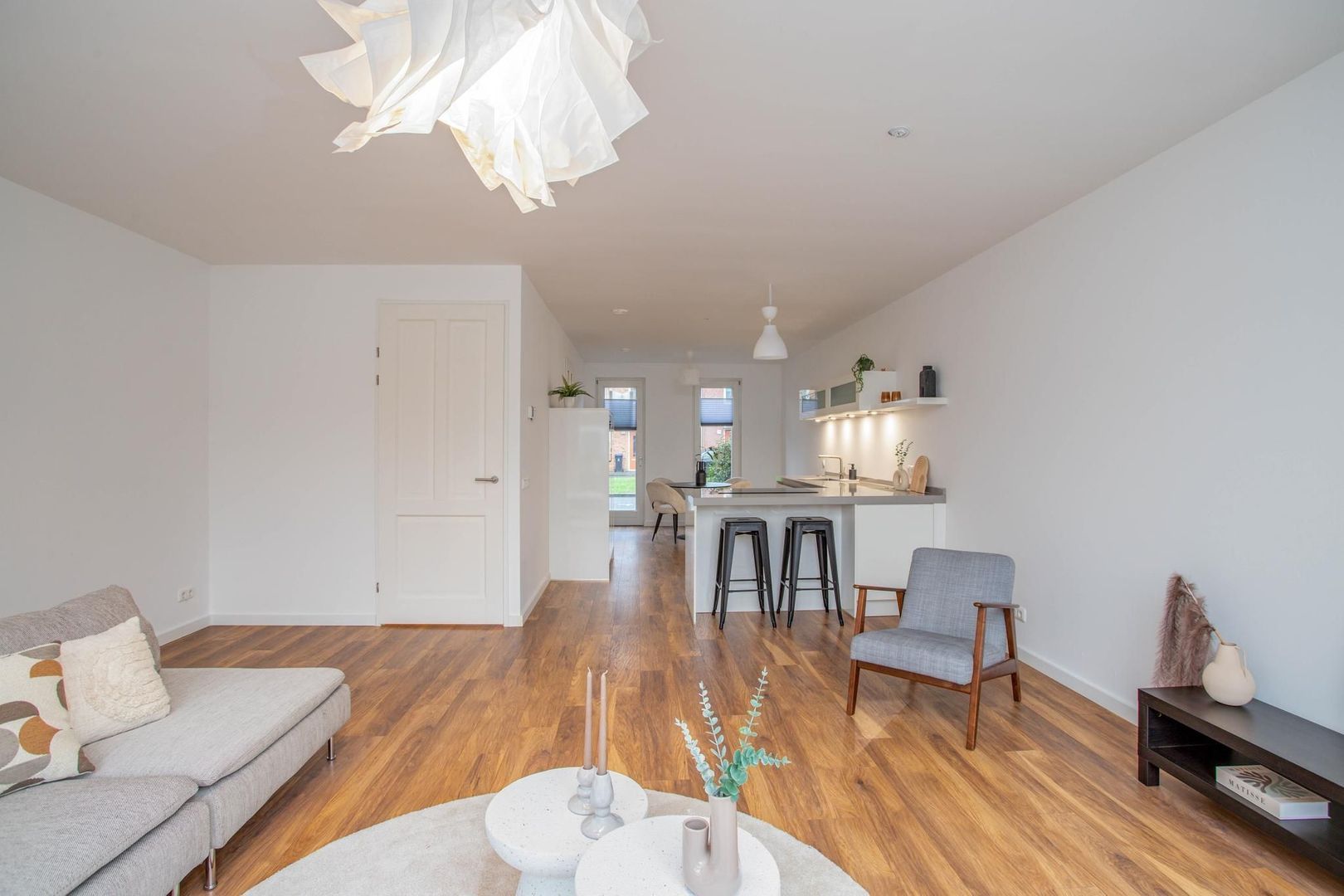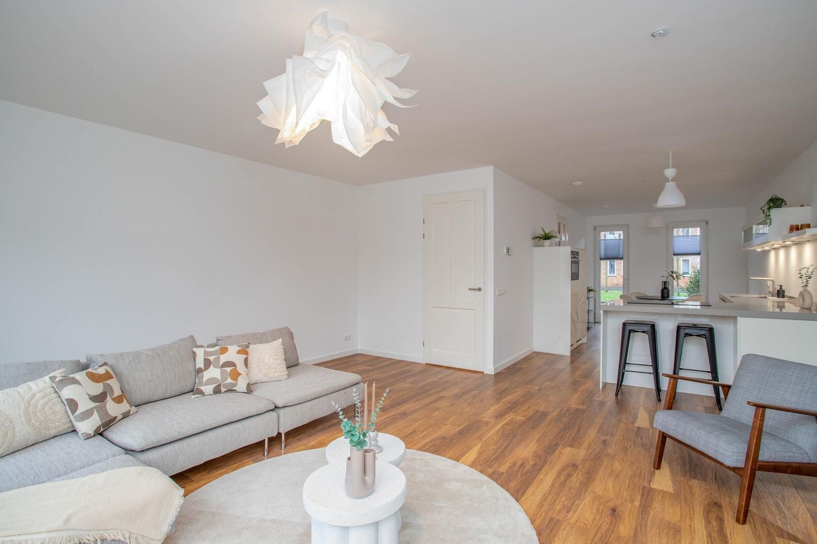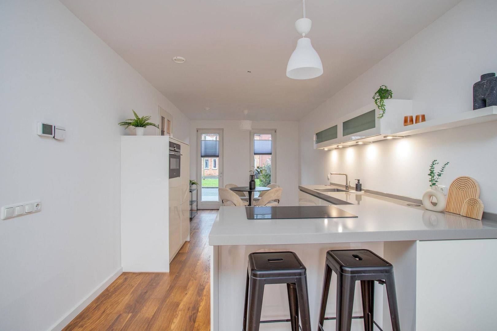 Via de voortuin, waar ruimte is voor een bankje, kom je binnen in de hal. Deze geeft toegang tot de keuken, woonkamer, trapopgang, toilet en meterkast. De moderne open keuken aan de voorzijde is voorzien van een vaatwasser, inductiekookplaat, afzuigkap, combi-oven, koelkast en vriezer. Dankzij de L-vormige indeling is er een bar gecreëerd, en er is voldoende ruimte voor een eettafel. De plafonds zijn recent voorzien van glad stucwerk en samen met de wanden volledig geschilderd.
