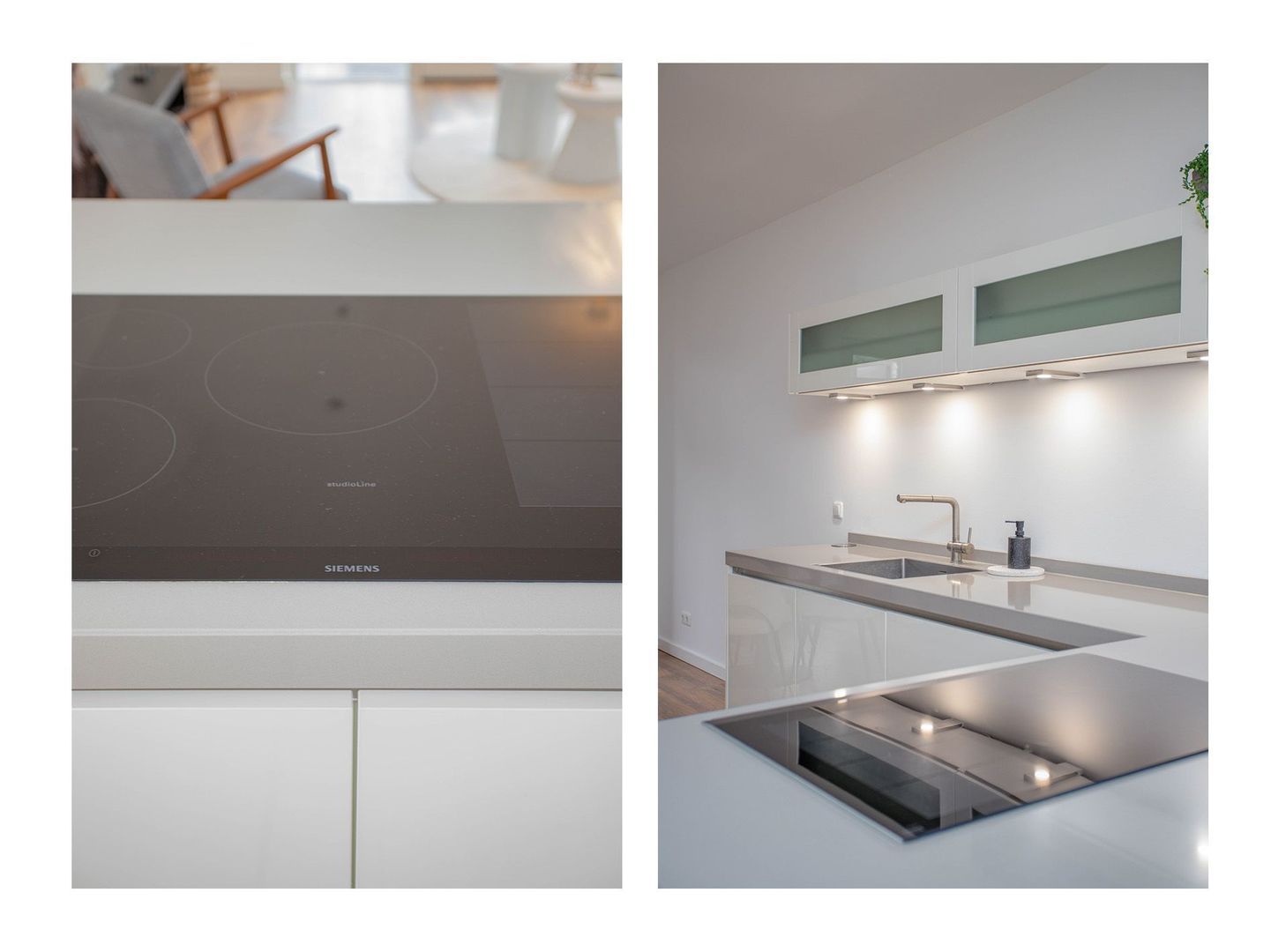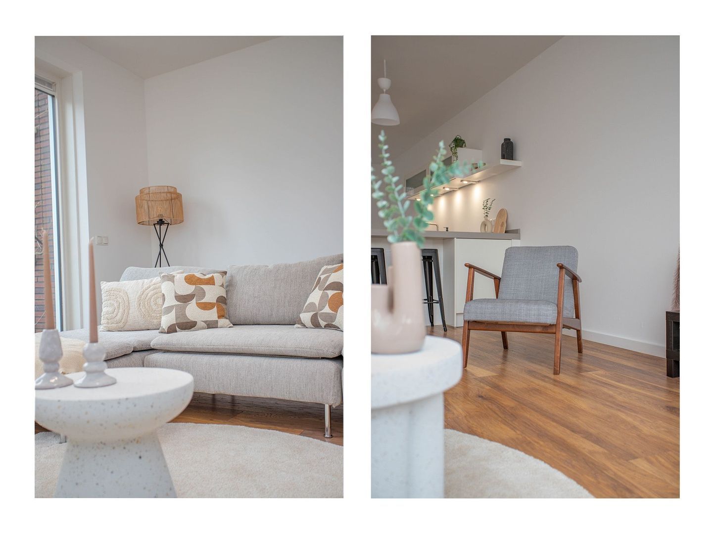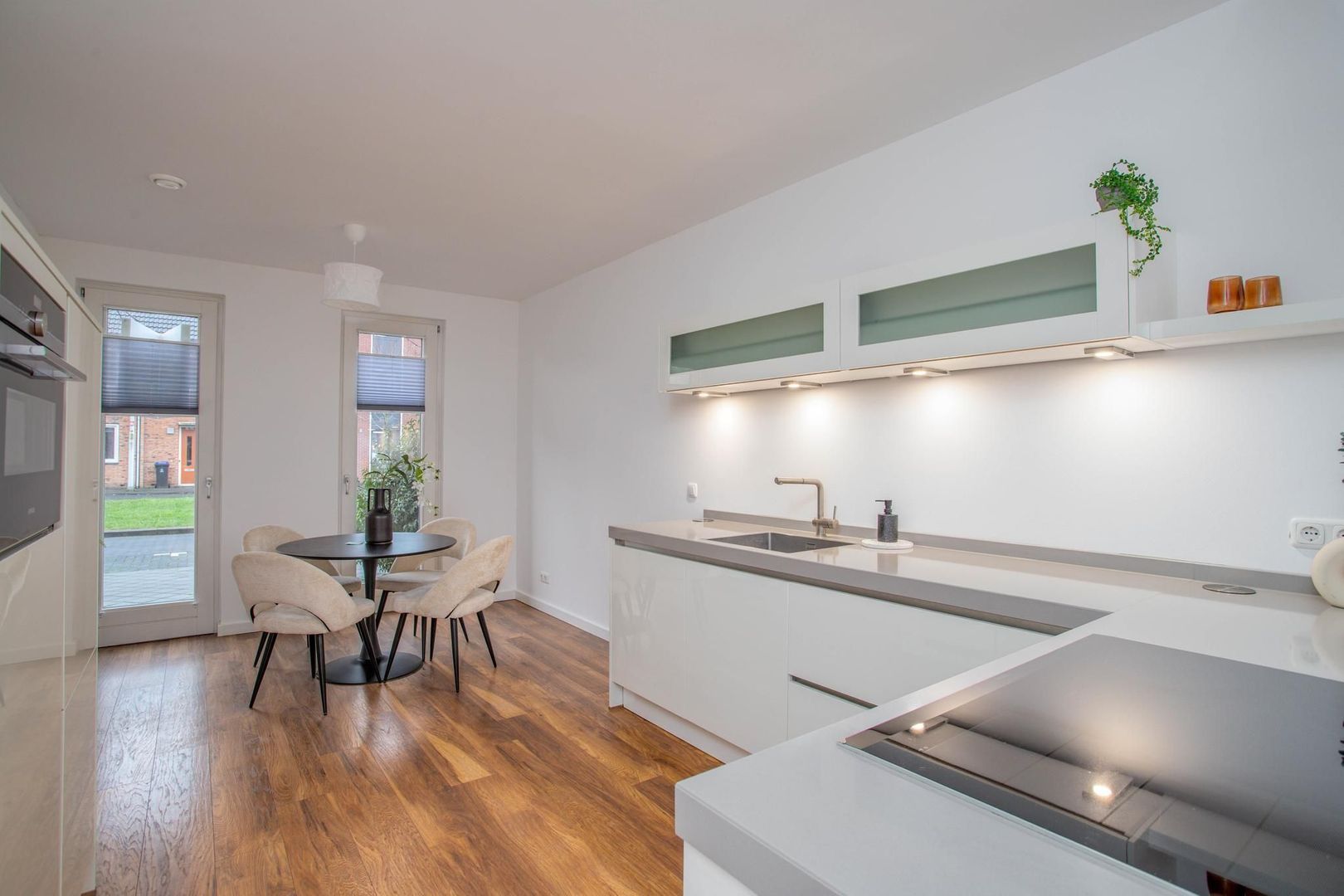 Via de voortuin, waar ruimte is voor een bankje, kom je binnen in de hal. Deze geeft toegang tot de keuken, woonkamer, trapopgang, toilet en meterkast. De moderne open keuken aan de voorzijde is voorzien van een vaatwasser, inductiekookplaat, afzuigkap, combi-oven, koelkast en vriezer. Dankzij de L-vormige indeling is er een bar gecreëerd, en er is voldoende ruimte voor een eettafel. De plafonds zijn recent voorzien van glad stucwerk en samen met de wanden volledig geschilderd.