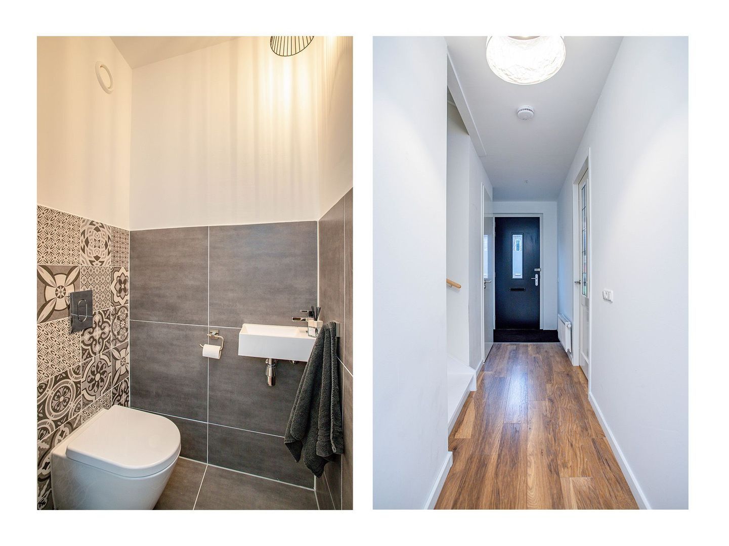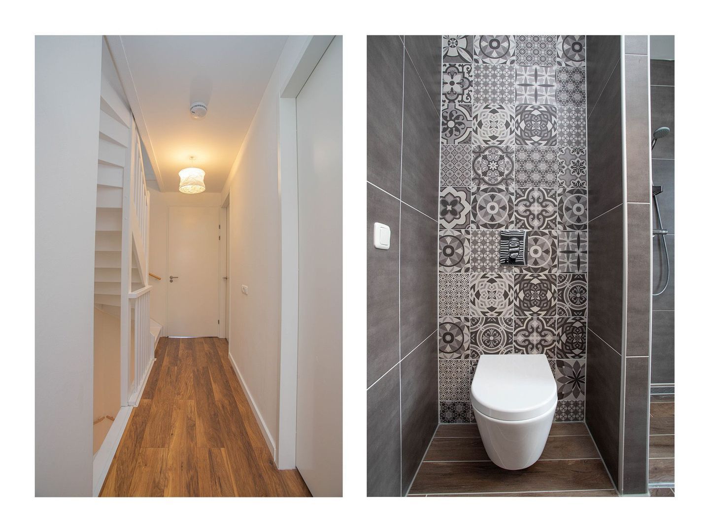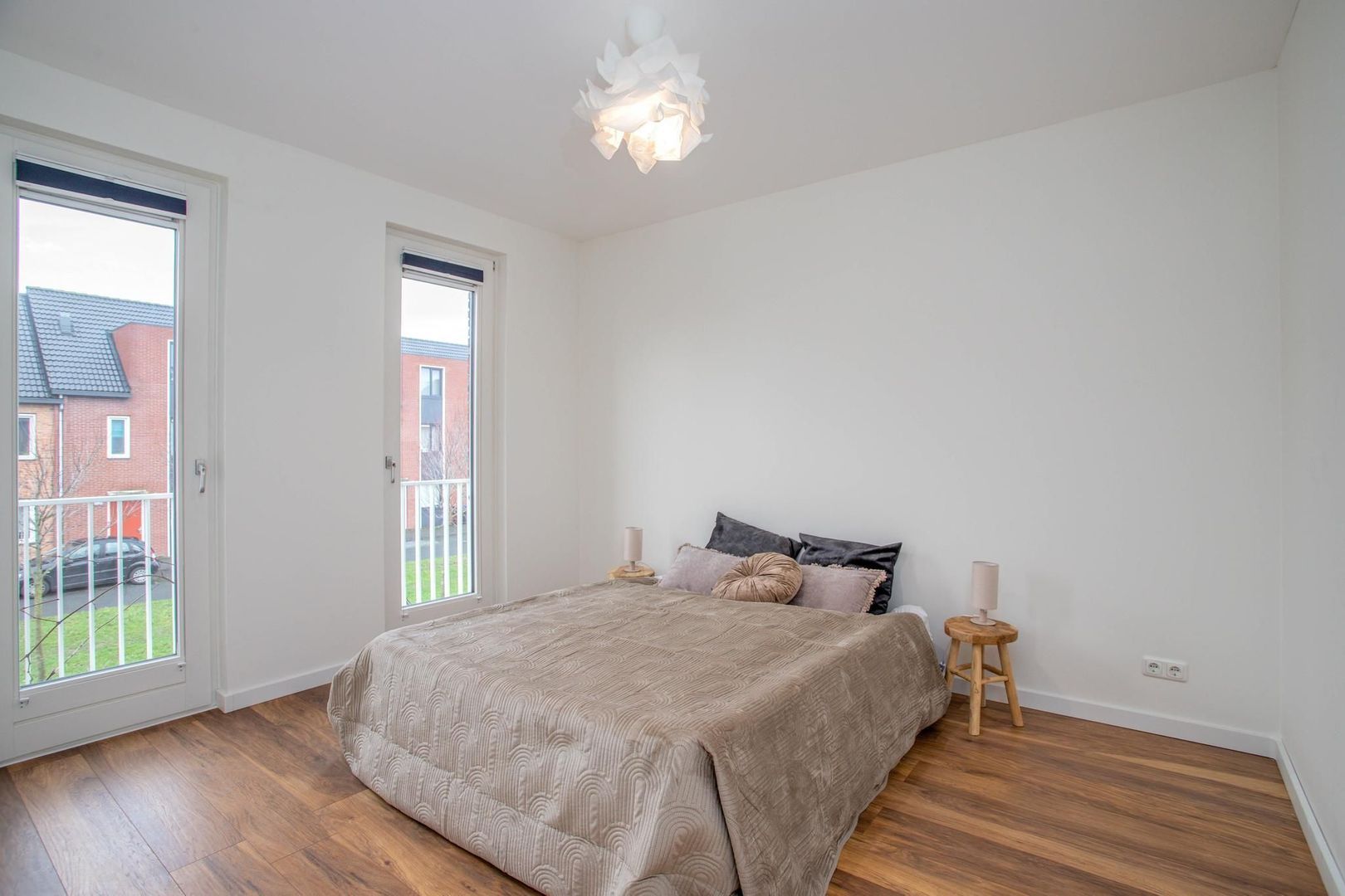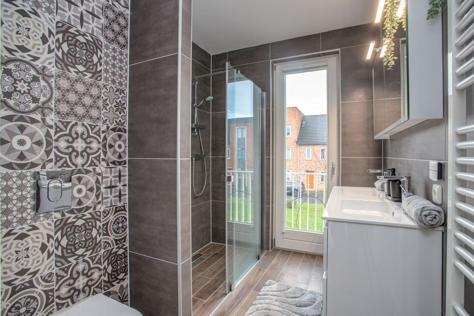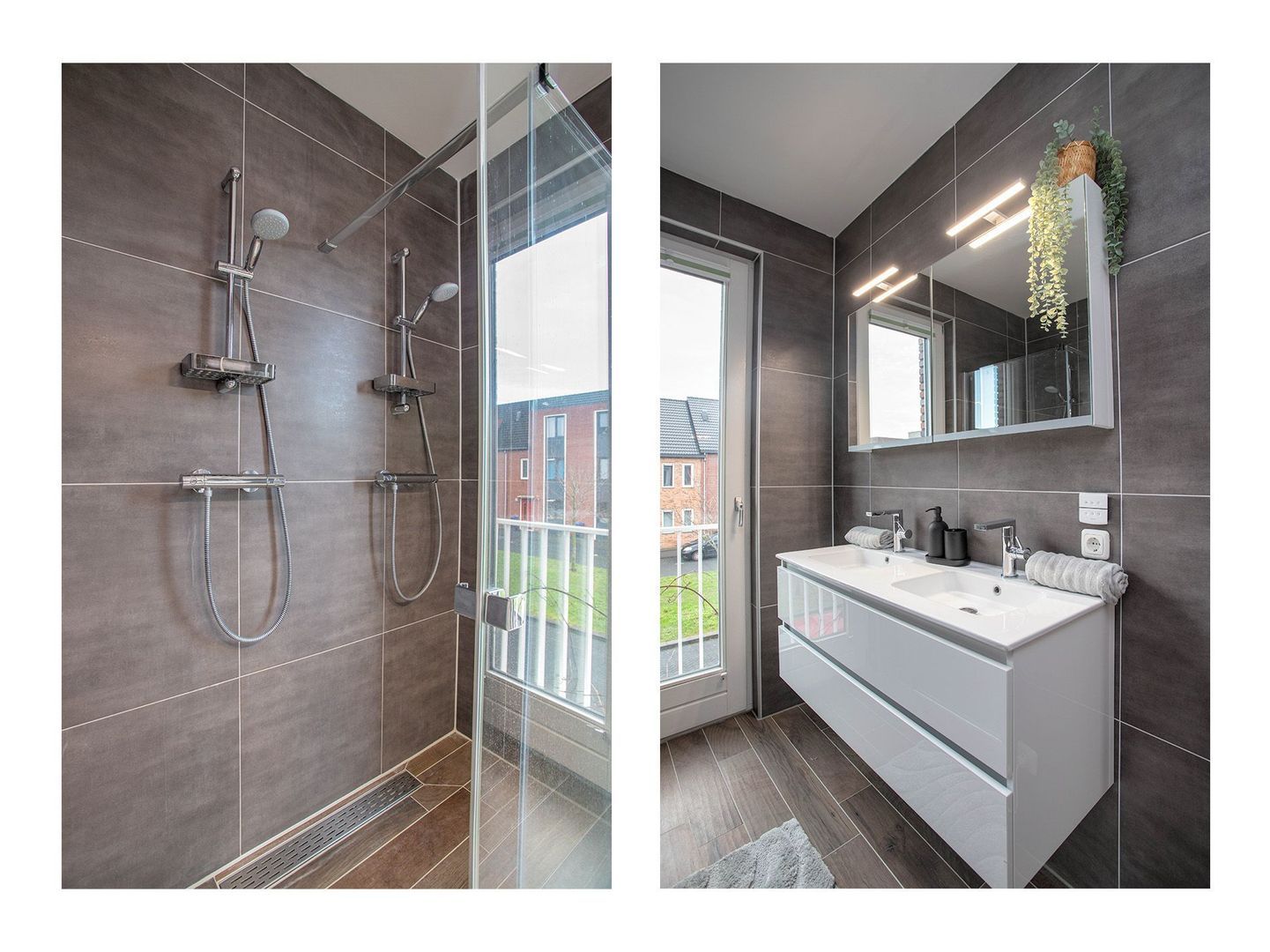 De luxe badkamer combineert donkere tegels met lichte accenten en is uitgerust met een dubbele inloopdouche, dubbele wastafel met meubel, toilet en handdoekradiator. Het Franse balkon zorgt voor veel daglicht.