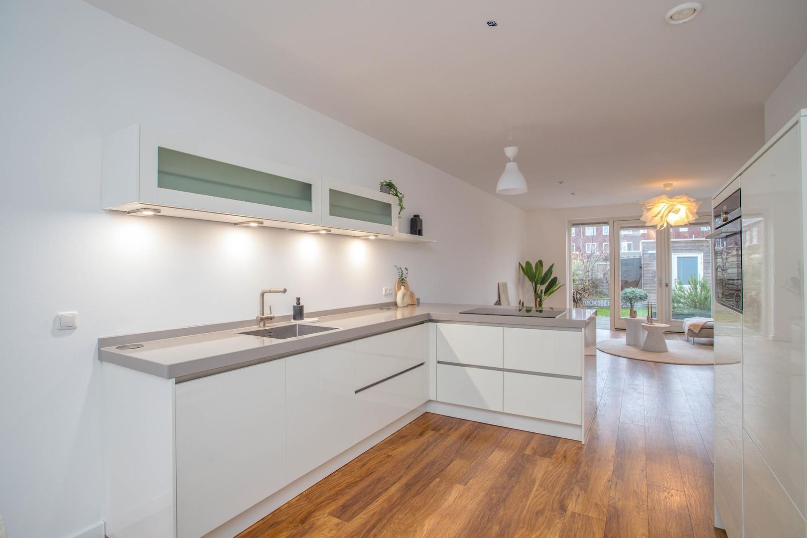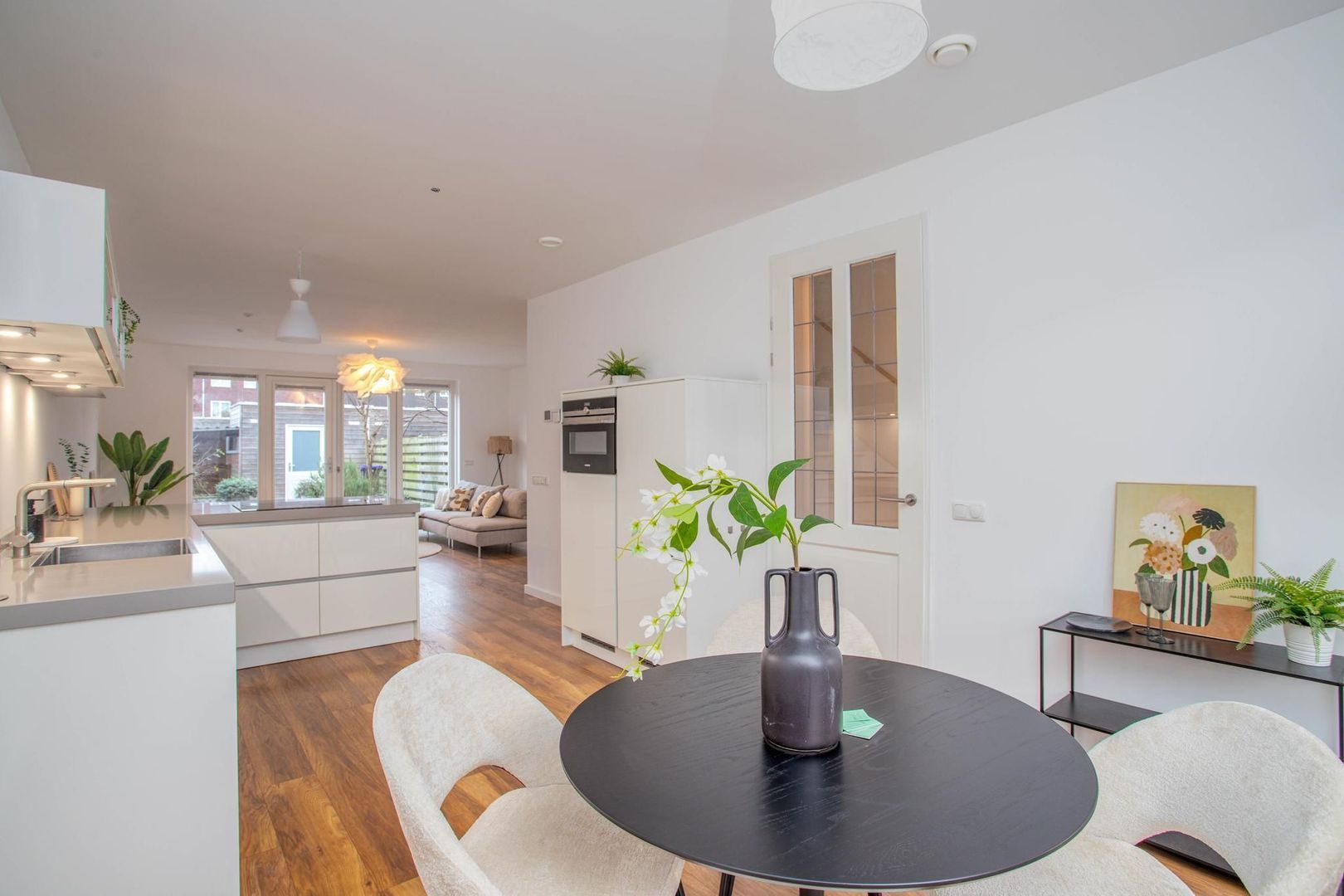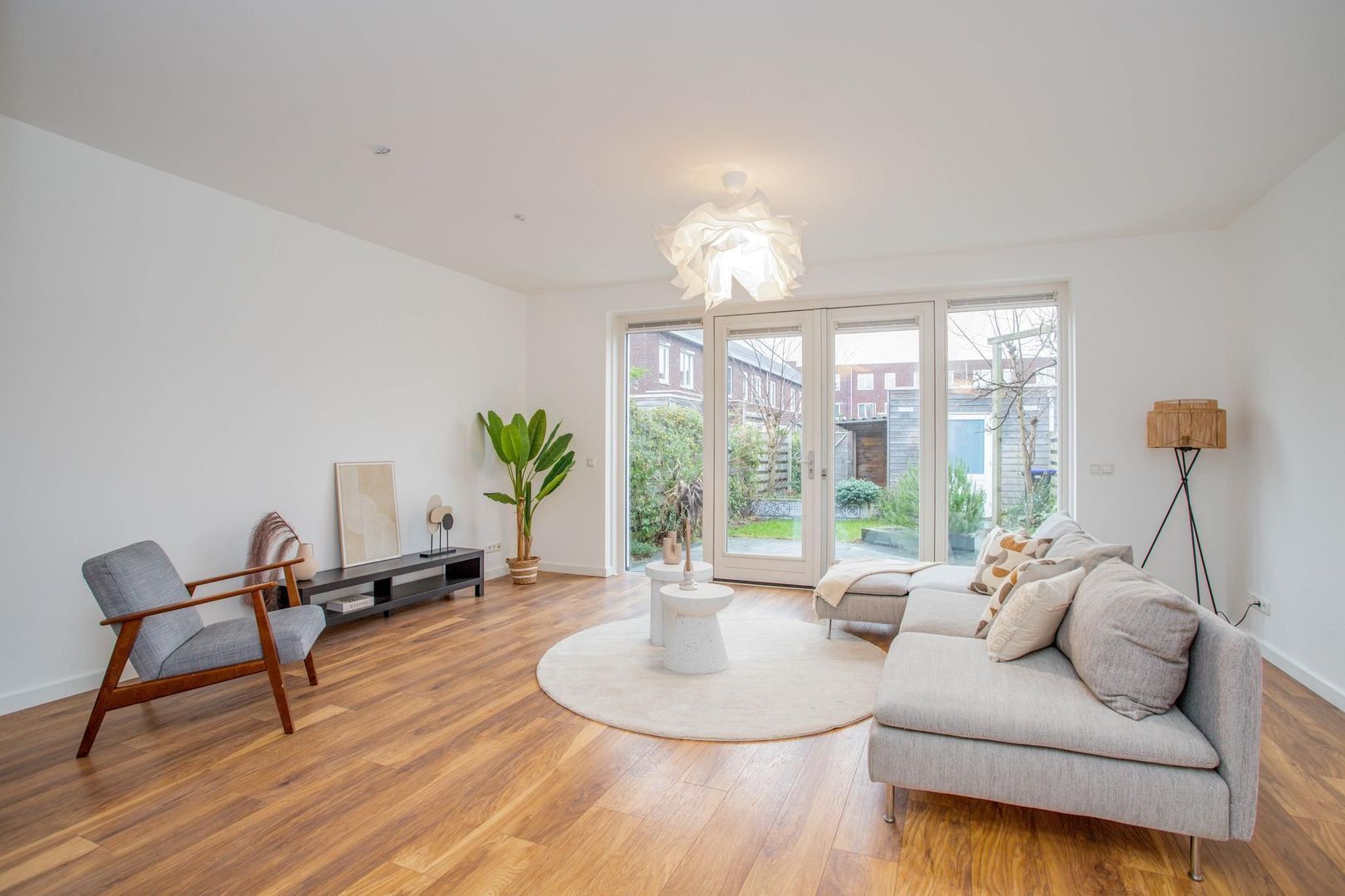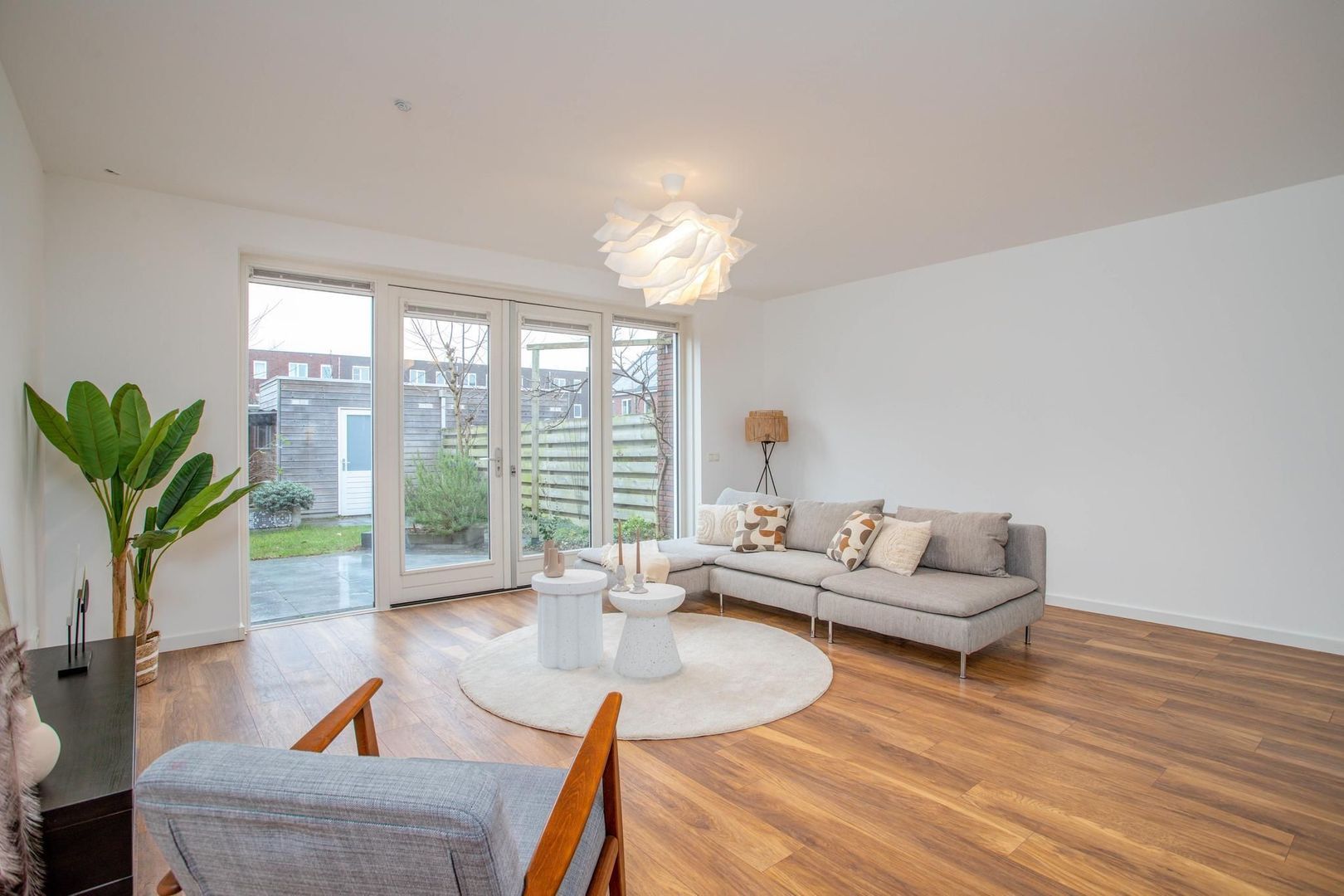 De royale en lichte woonkamer biedt plaats aan een grote bank en heeft uitzicht op zowel de keuken als de fraai aangelegde achtertuin, bereikbaar via openslaande deuren. De groene tuin is voorzien van planten die regenwater goed afvoeren, en achterin vind je een berging met achterom.