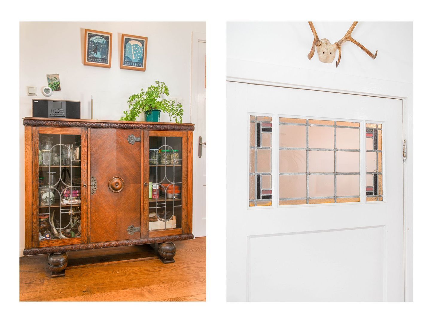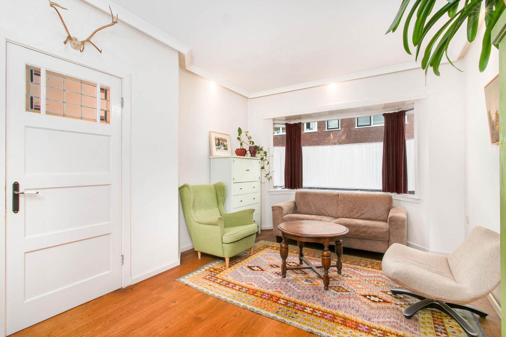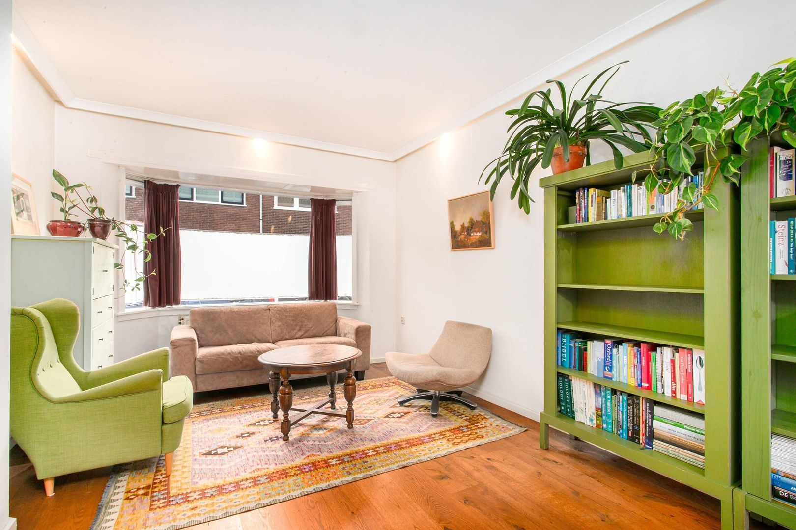 Via de voordeur met glas-in-lood bereikt men de entree met een apart toilet. De woonkamer is aan de voorzijde gelegen en voorzien van een eiken laminaat parketvloer, met een sfeervolle erker die uitkijkt op de straat. De woning beschikt over authentieke details, zoals paneeldeuren en glas-in-loodramen.