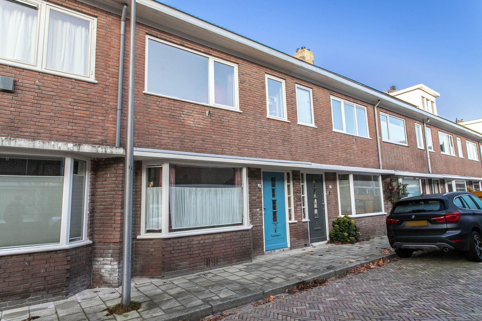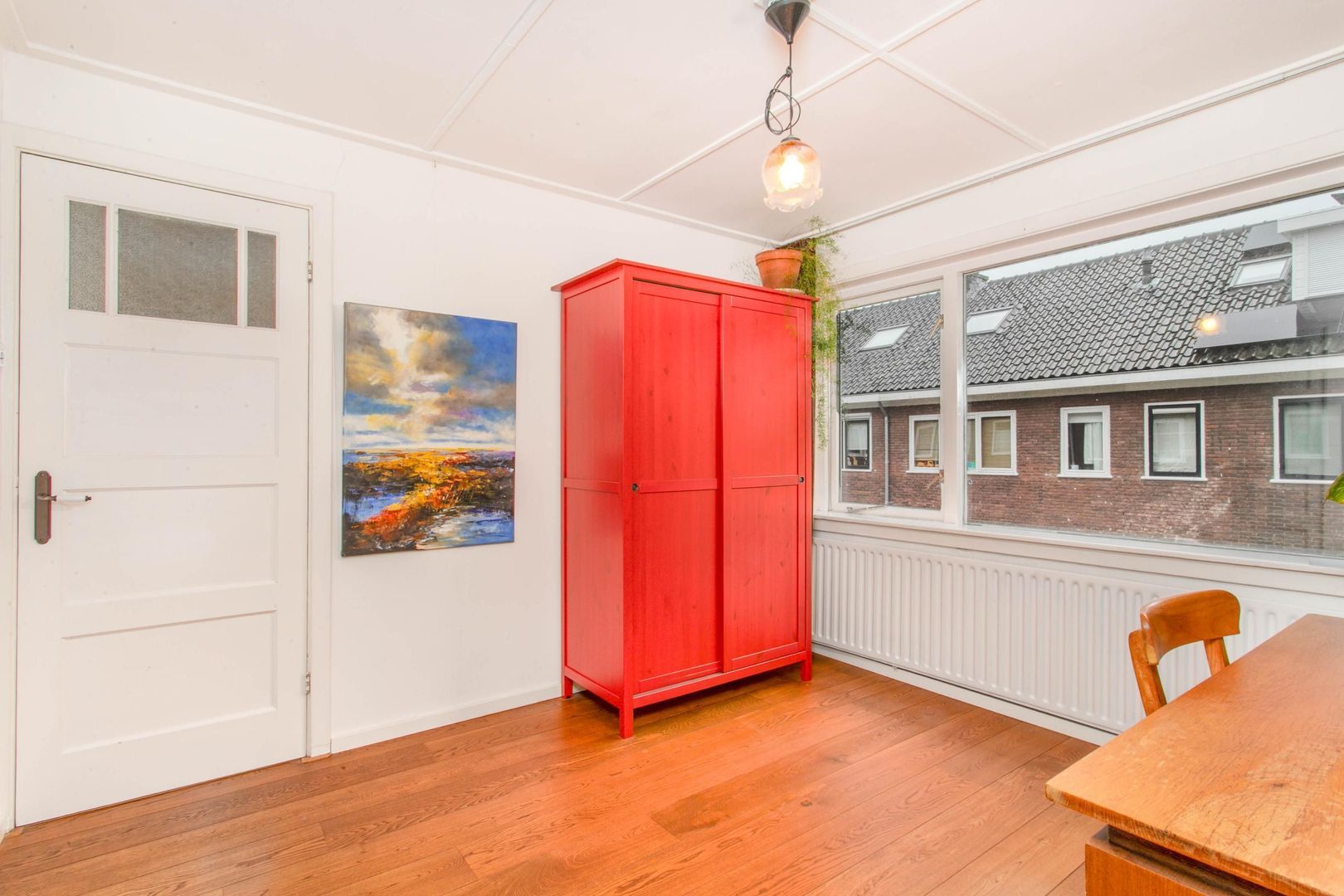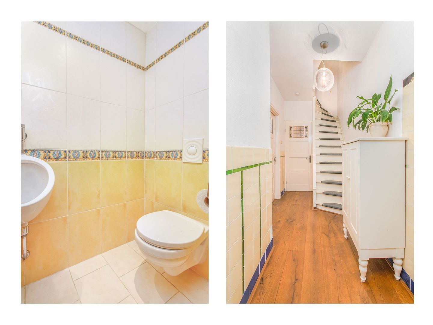 Via de voordeur met glas-in-lood bereikt men de entree met een apart toilet. De woonkamer is aan de voorzijde gelegen en voorzien van een eiken laminaat parketvloer, met een sfeervolle erker die uitkijkt op de straat. De woning beschikt over authentieke details, zoals paneeldeuren en glas-in-loodramen.