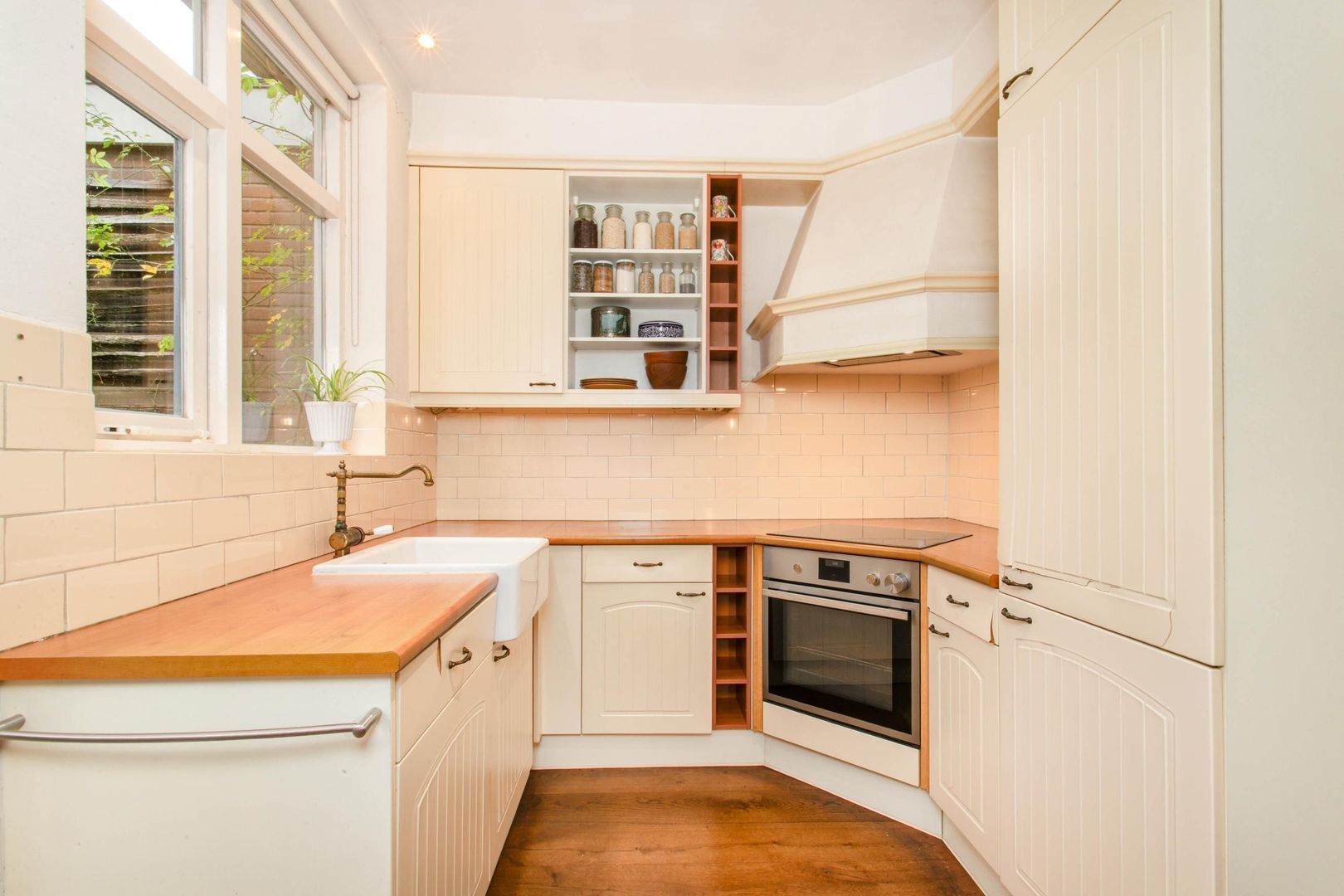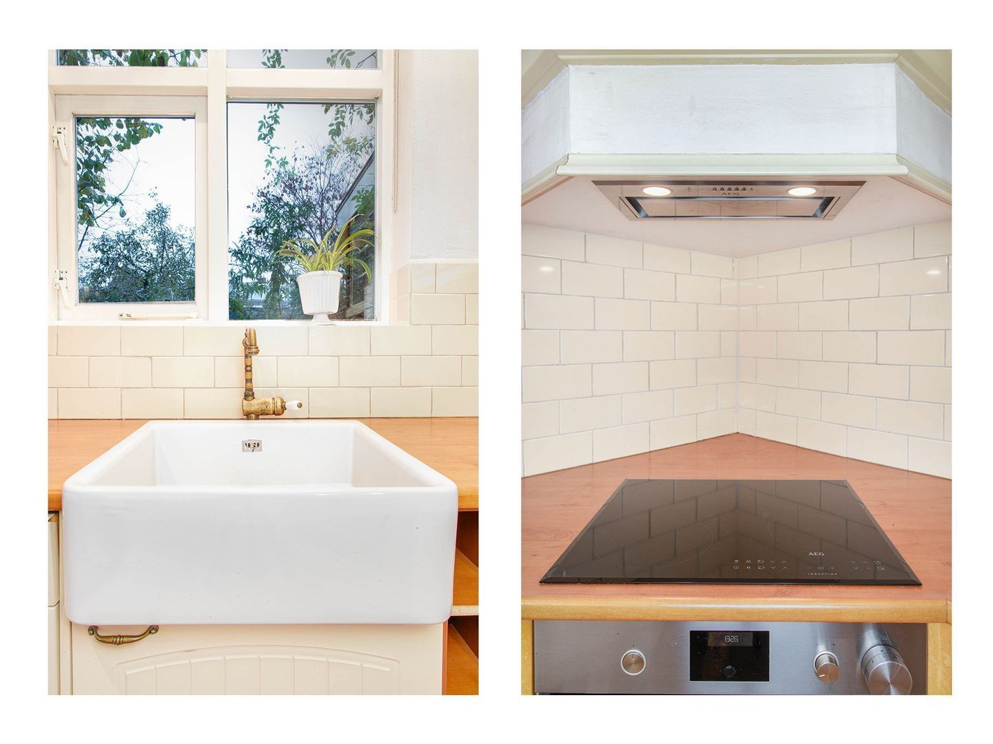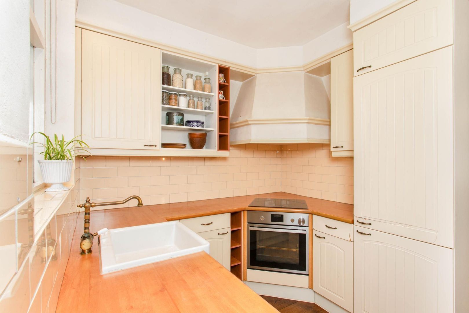 Aan de achterzijde bevindt zich de eenvoudig uitgevoerde keuken, voorzien van inbouwapparatuur waaronder een koel-vriescombinatie, vaatwasser, inductiekookplaat, enkele spoelbak en afzuigkap. Vanuit de keuken kijkt u uit op de groene, circa 10 meter diepe achtertuin, gelegen op het westen.