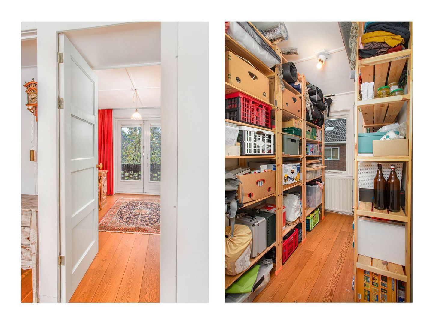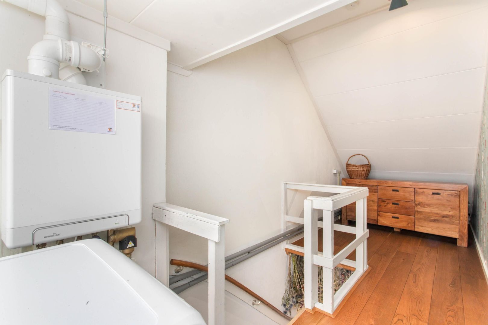 De zolderverdieping beschikt aan de achterzijde over een brede dakkapel en biedt veel bergruimte dankzij de praktische knieschotten. Hier bevindt zich tevens de wasruimte met aansluitingen voor wasmachine en droger. De verdieping is voorzien van een eiken laminaat parketvloer.