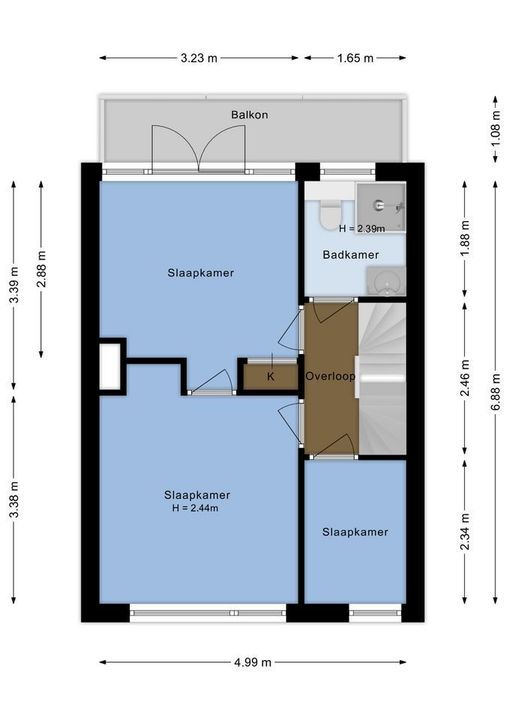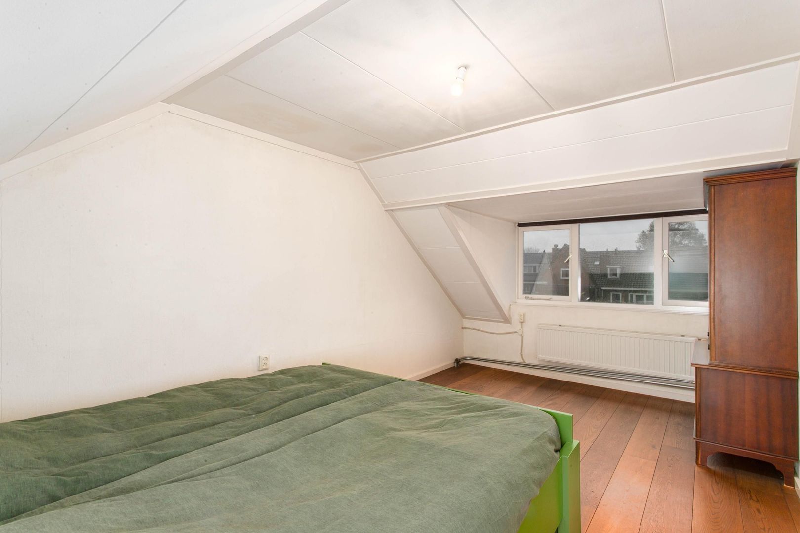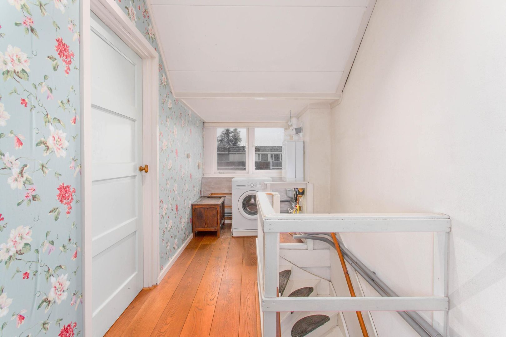 De overloop geeft toegang tot drie slaapkamers en de badkamer. De slaapkamer aan de achterzijde beschikt over een inbouwkast en een balkon op het westen. De twee slaapkamers aan de voorzijde bieden zicht op de straat; één daarvan is eveneens voorzien van een inbouwkast.