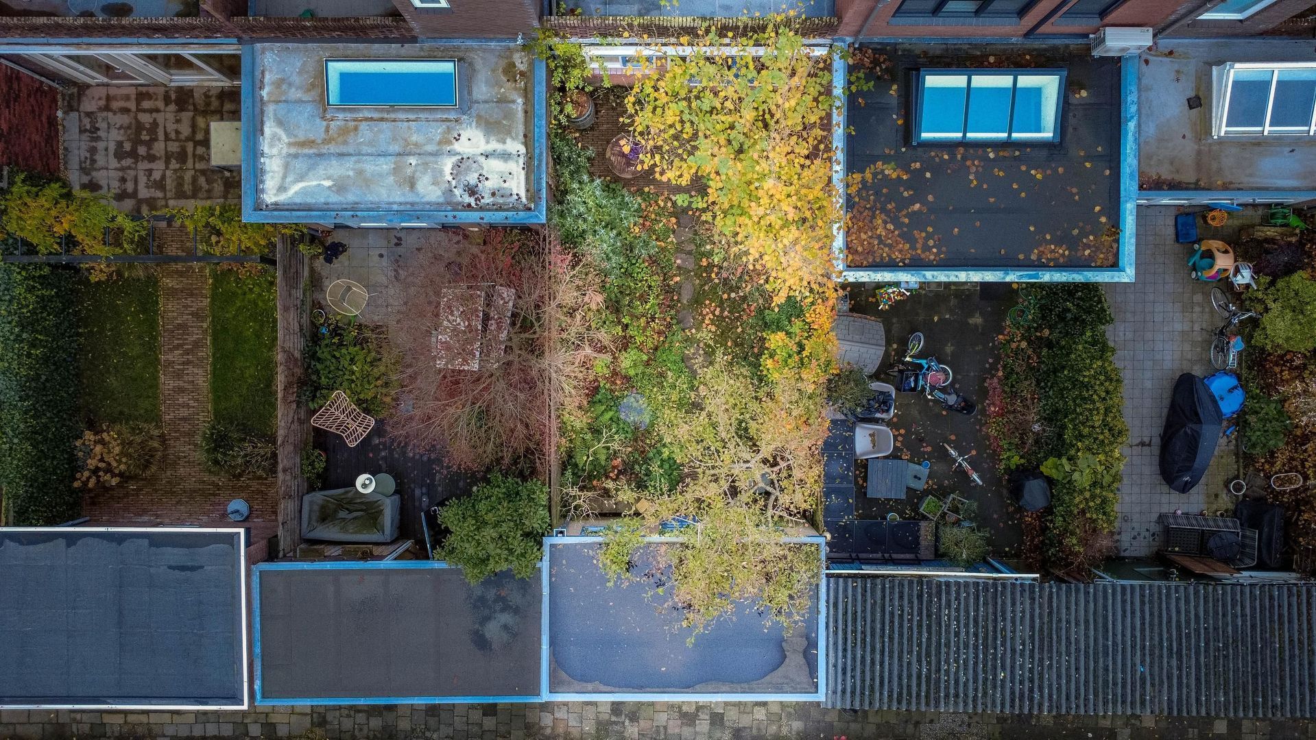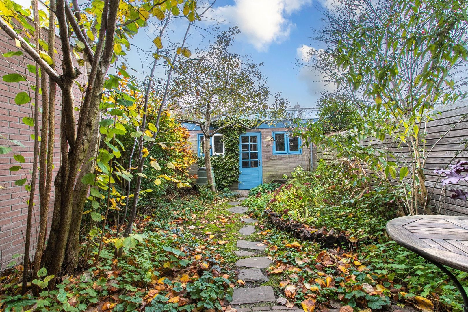 De achtertuin is bereikbaar via openslaande deuren vanuit de woonkamer en beschikt over een ruime schuur. Door de diepte en de gunstige ligging op het westen is er de hele dag zon.