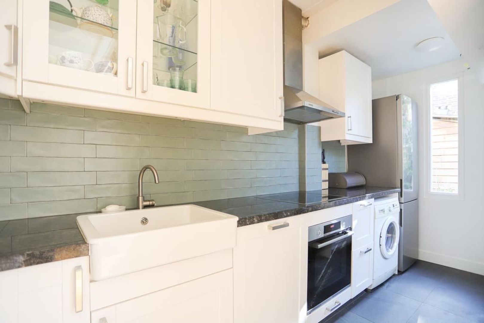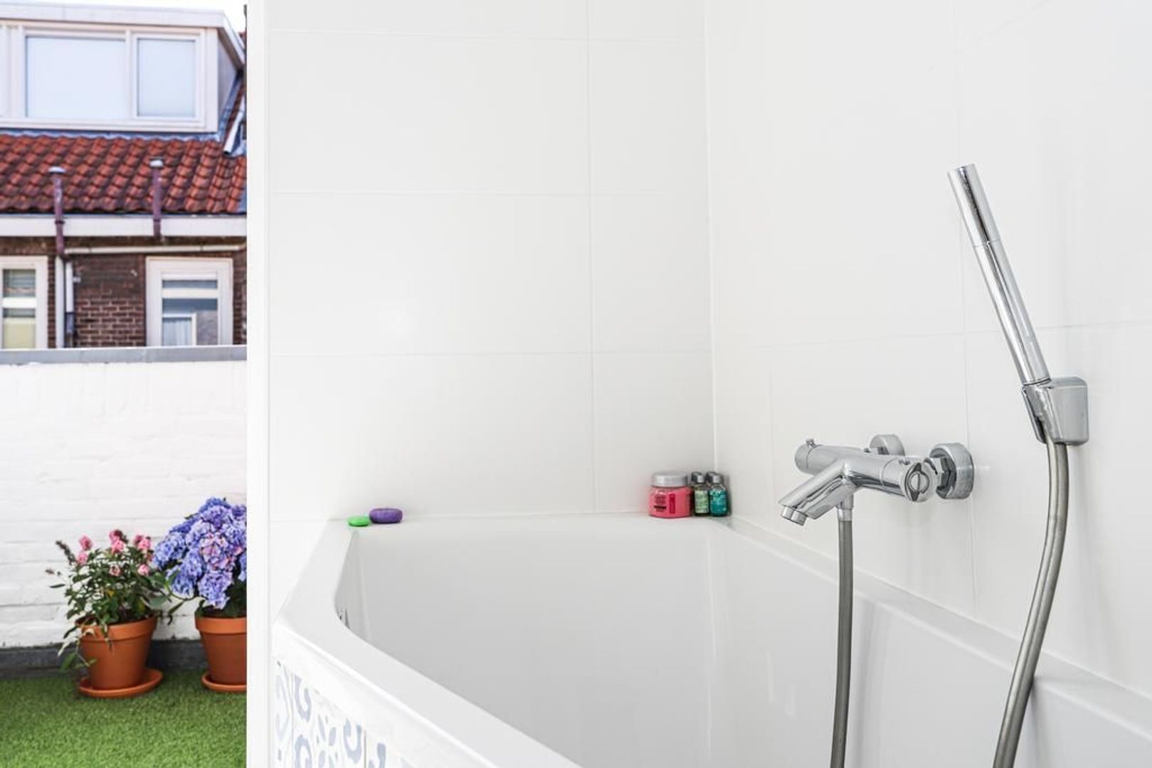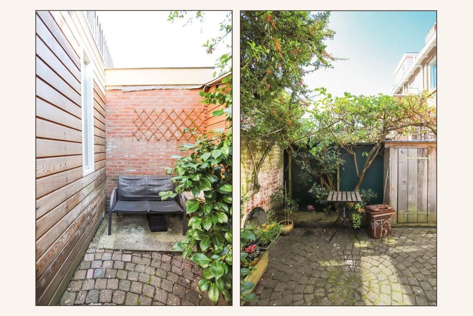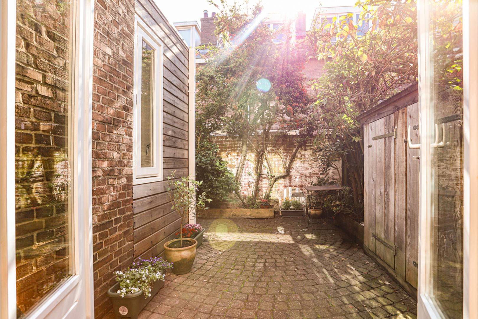 De heerlijk groene achtertuin op het zuidoosten is via de openslaande deuren in de woonkamer te bereiken. De zon weet de tuin de hele middag te vinden, waardoor je hier kunt genieten van zowel het zonnetje als de schaduw op kunt zoeken op warme dagen. De tuin is onderhoudsvriendelijk met bestrating, groene borders en een praktische houten kast. Het hout op de uitbouw draagt bij aan het idyllische plaatje wat het geheel een gemoedelijke sfeer geeft.