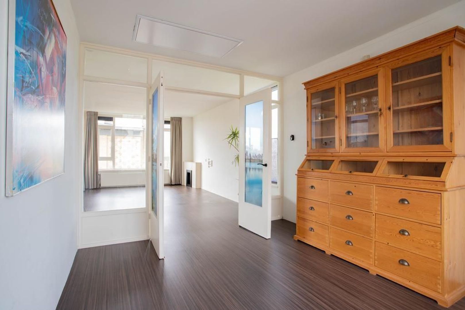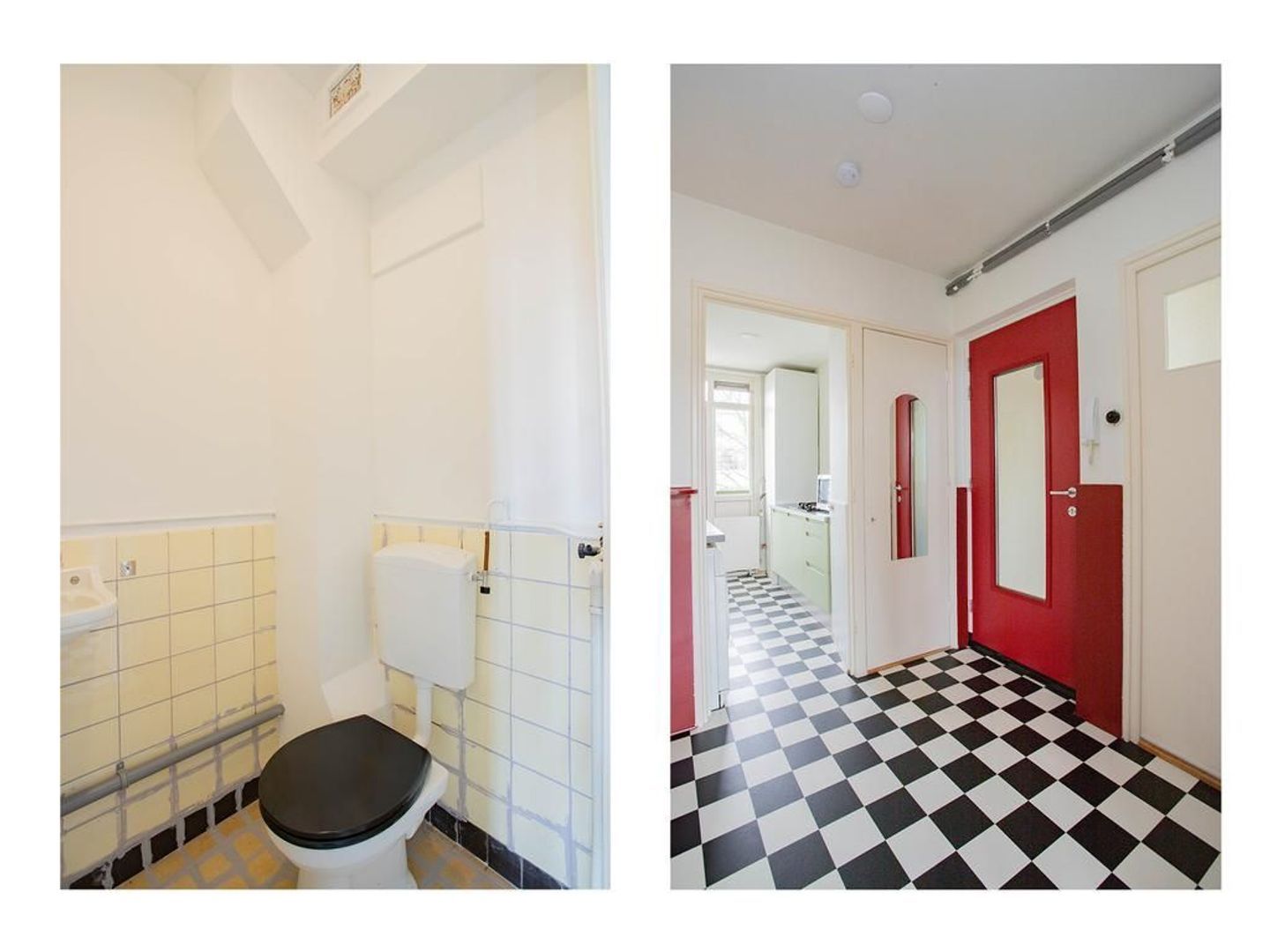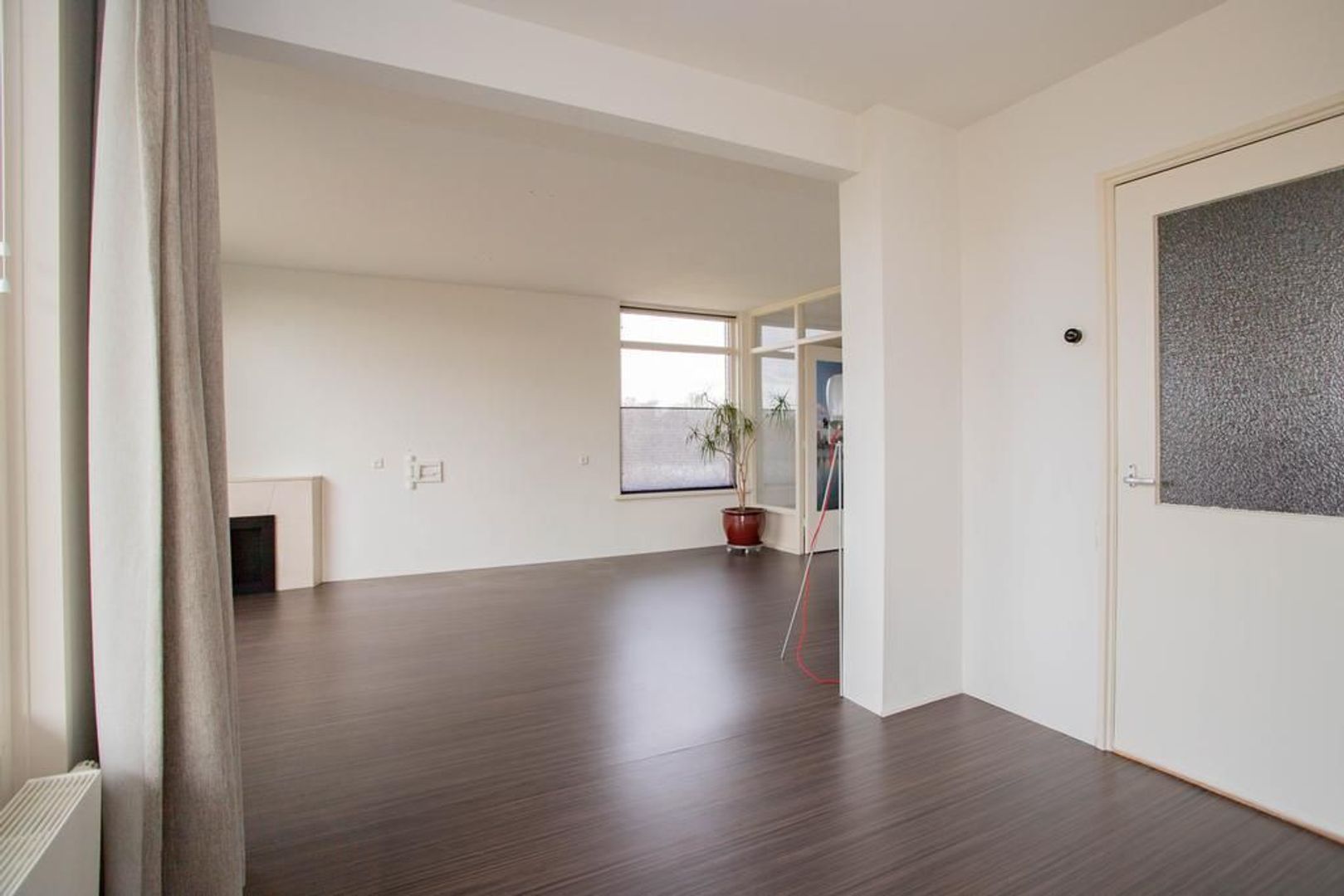 Je komt binnen via de entree. Entree met separaat toilet, een nis waarin nu een kapstok is geplaatst en de meterkast. Deze woning is eenvoudig van driekamer appartement naar vierkamer appartement om te bouwen. Door van de nis in de hal een nieuwe doorgang te maken naar de woonkamer, is de eetkamer gemakkelijk als vierde kamer te gebruiken. Een binnendeur is hiervoor al beschikbaar.