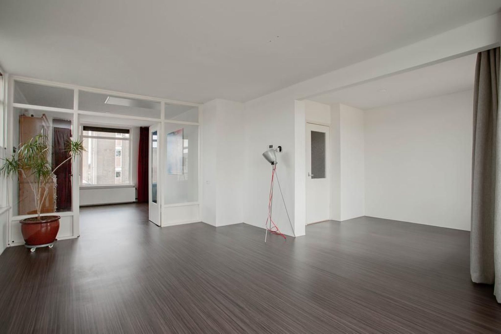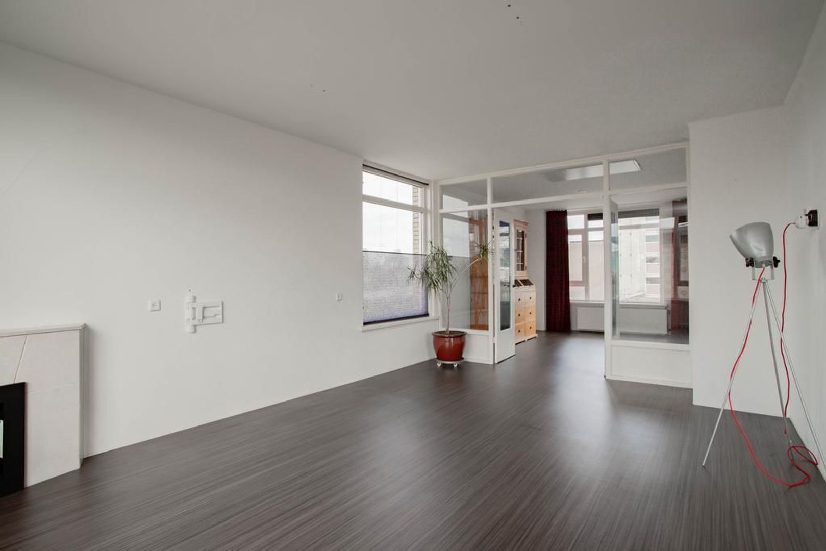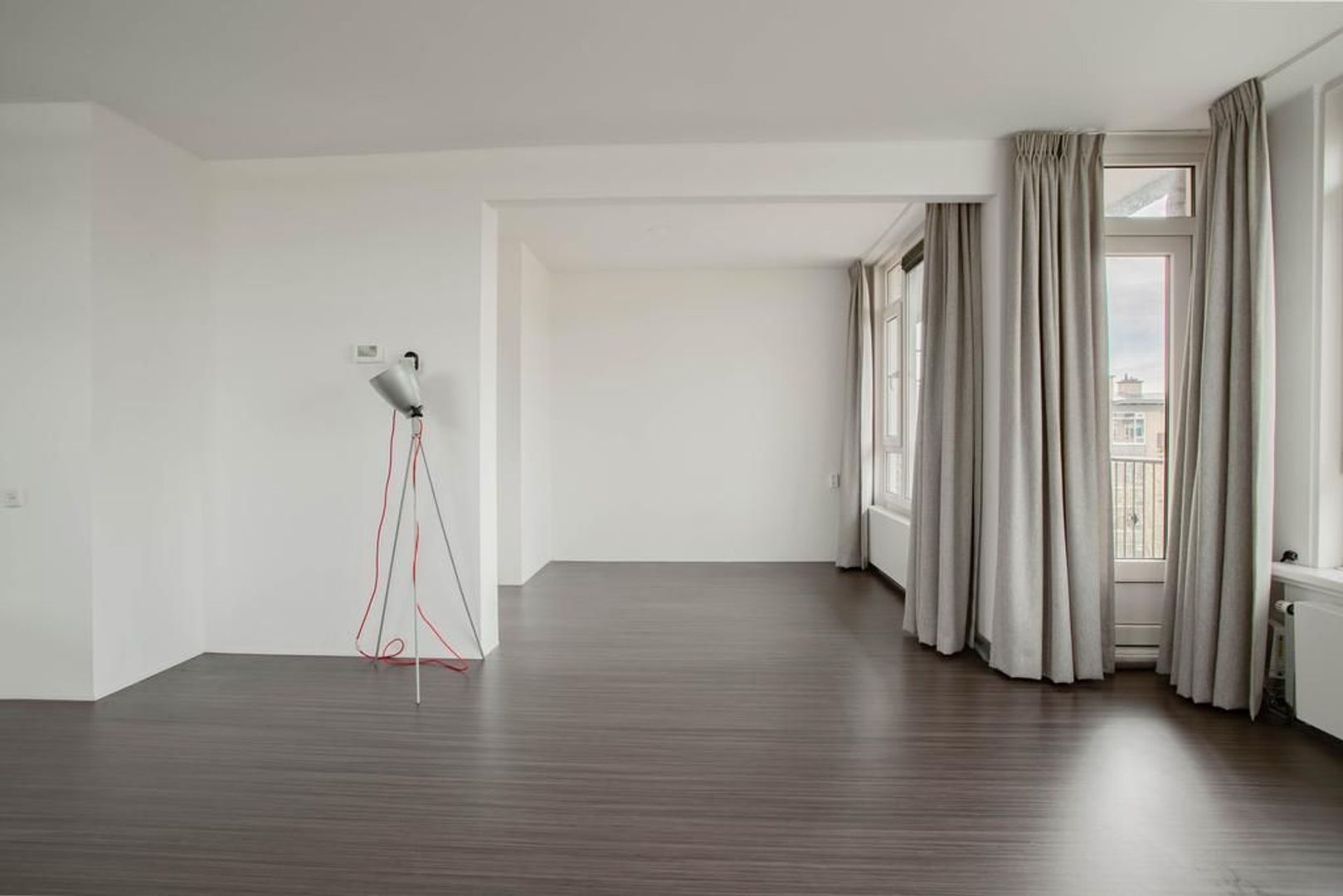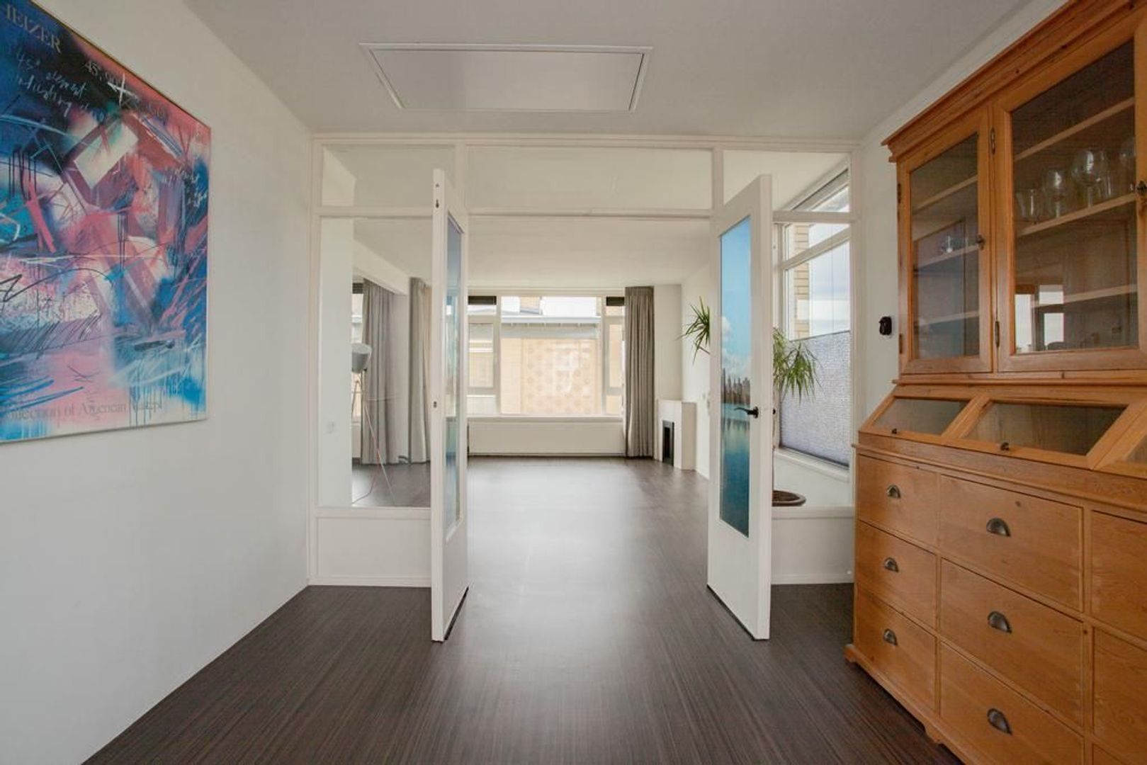 Je komt binnen via de entree. Entree met separaat toilet, een nis waarin nu een kapstok is geplaatst en de meterkast. Deze woning is eenvoudig van driekamer appartement naar vierkamer appartement om te bouwen. Door van de nis in de hal een nieuwe doorgang te maken naar de woonkamer, is de eetkamer gemakkelijk als vierde kamer te gebruiken. Een binnendeur is hiervoor al beschikbaar.