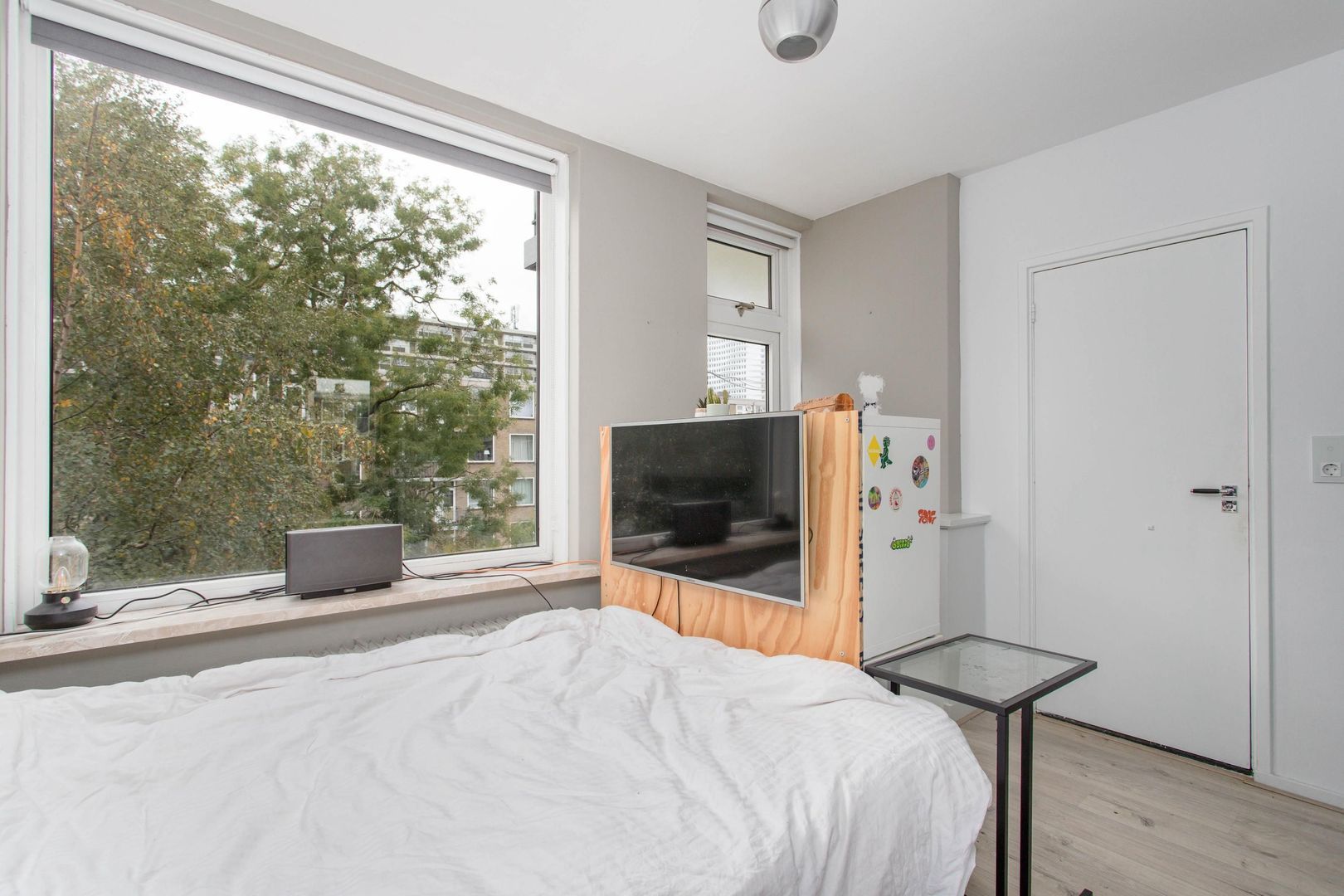 Aangrenzend aan de woonkamer ligt de royale hoofdslaapkamer, die volop ruimte biedt voor een tweepersoonsbed en een grote kledingkast, waardoor een comfortabele en rustige slaapomgeving ontstaat.