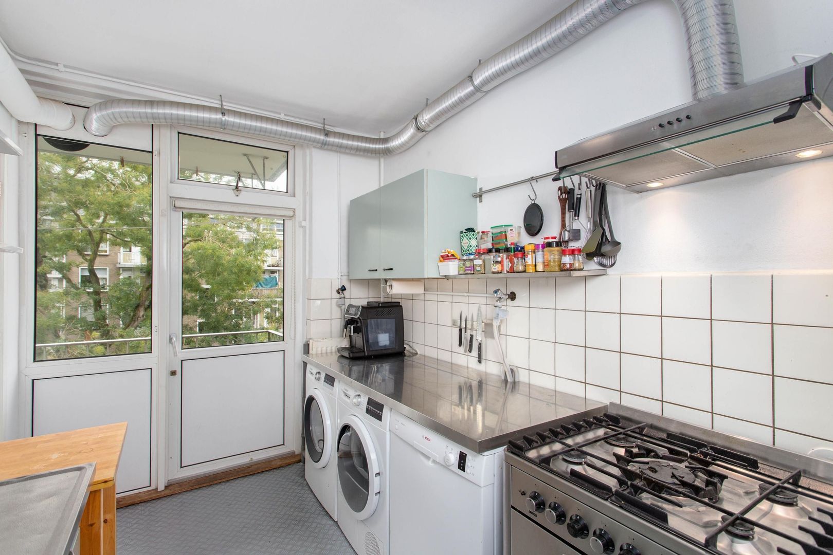 De keuken is uitgerust met een gaskookplaat, afzuigkap, oven, koel-/vriescombinatie, wasmachineaansluiting en een aansluiting voor een wasdroger. Zo vormt deze ruimte een praktische en eigentijdse leefomgeving waarin comfort en gebruiksgemak samenkomen.