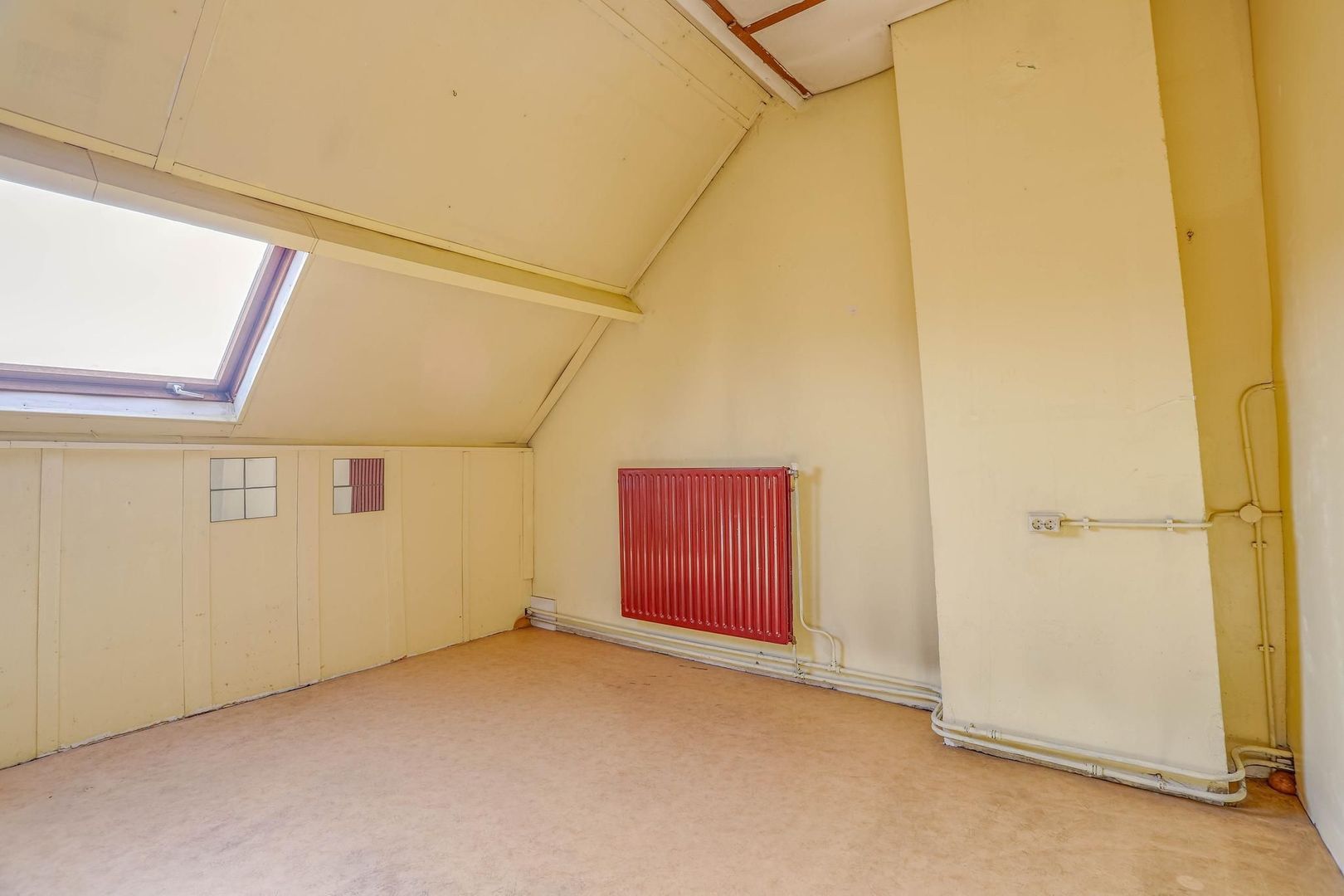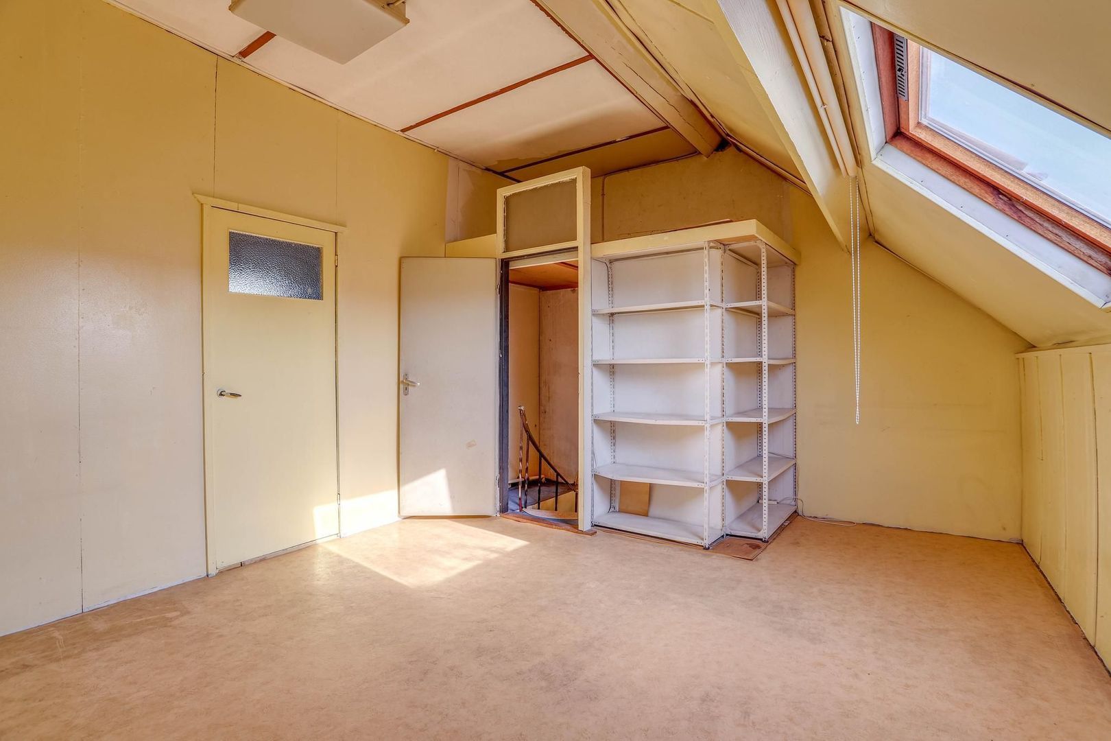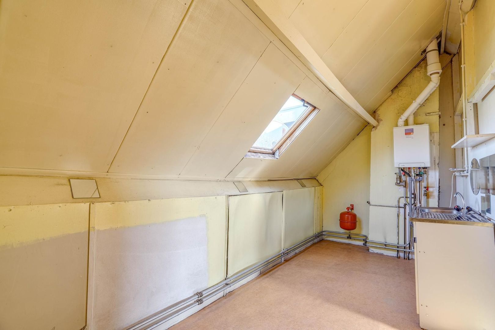 Nog een verdieping hoger betreed je direct de vierde slaapkamer, die is voorzien van een fijne lichtinval in de kamer door de aanwezigheid van het grote dakraam. Via deze kamer is er nog een aangrenzende ruimte op de tweede verdieping, die bijvoorbeeld kan worden ingericht als wasruimte. ruimte te betreden. Deze kamer beschikt over onder andere een keukenblad en de cv-installatie.