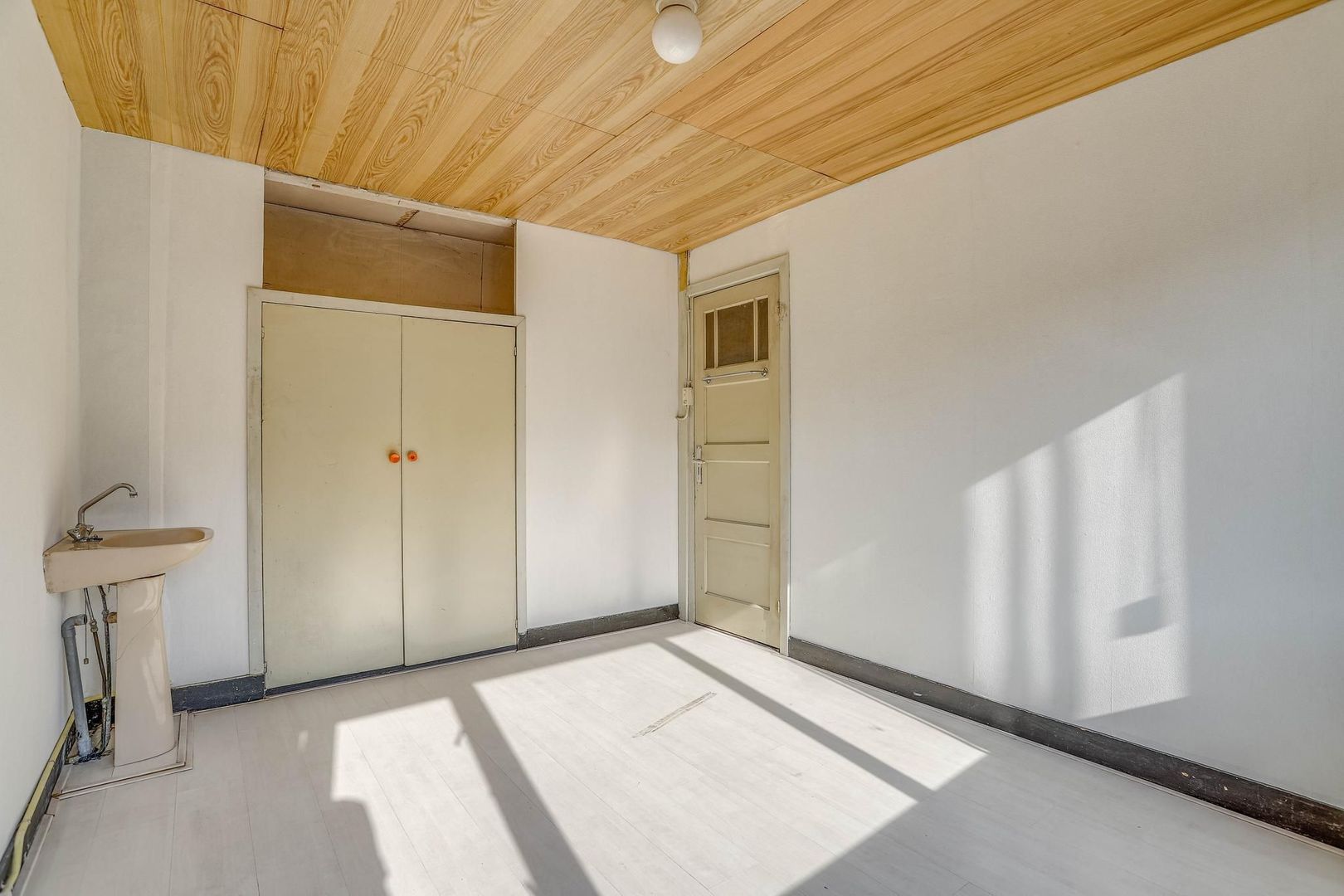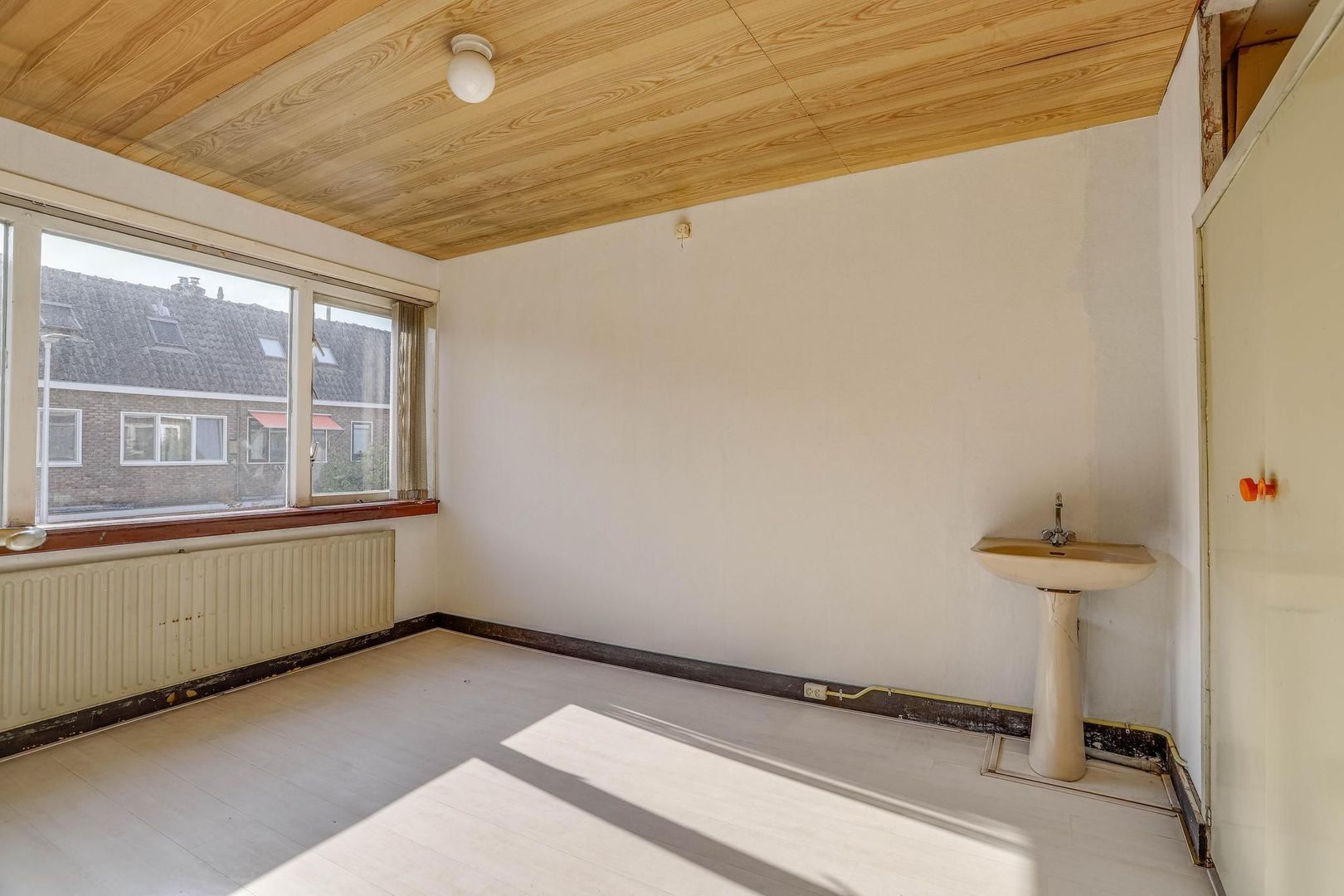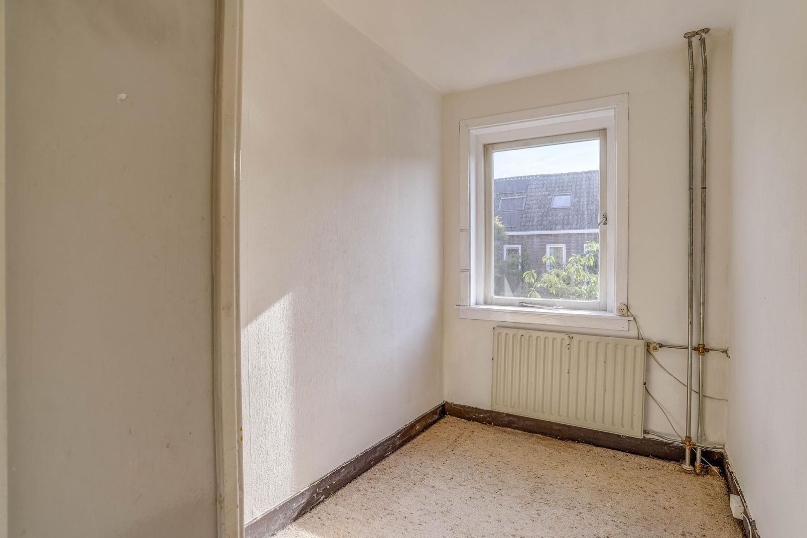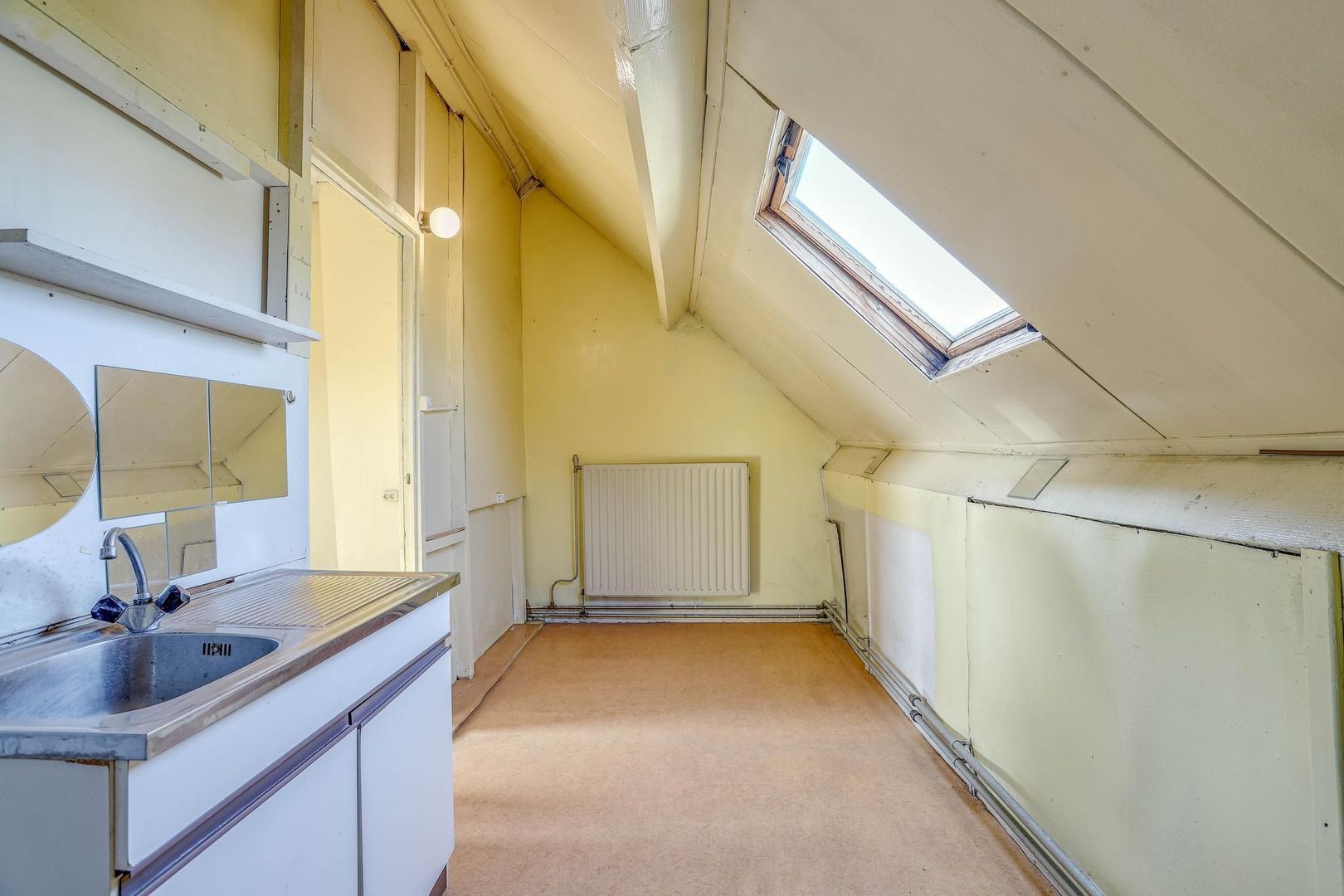 Nog een verdieping hoger betreed je direct de vierde slaapkamer, die is voorzien van een fijne lichtinval in de kamer door de aanwezigheid van het grote dakraam. Via deze kamer is er nog een aangrenzende ruimte op de tweede verdieping, die bijvoorbeeld kan worden ingericht als wasruimte. ruimte te betreden. Deze kamer beschikt over onder andere een keukenblad en de cv-installatie.