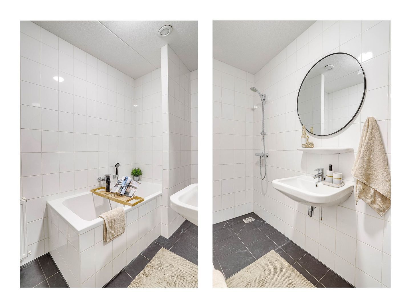 is bereikbaar vanuit de slaapkamer en beschikt over een ligbad, inloopdouche en wastafel. Via de