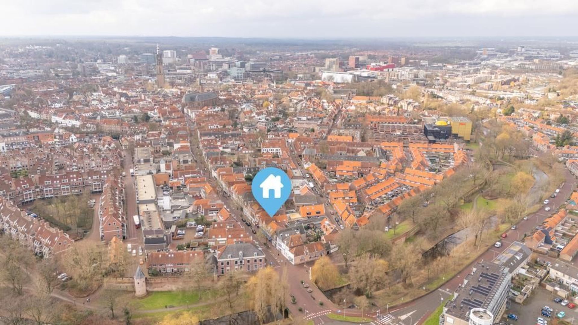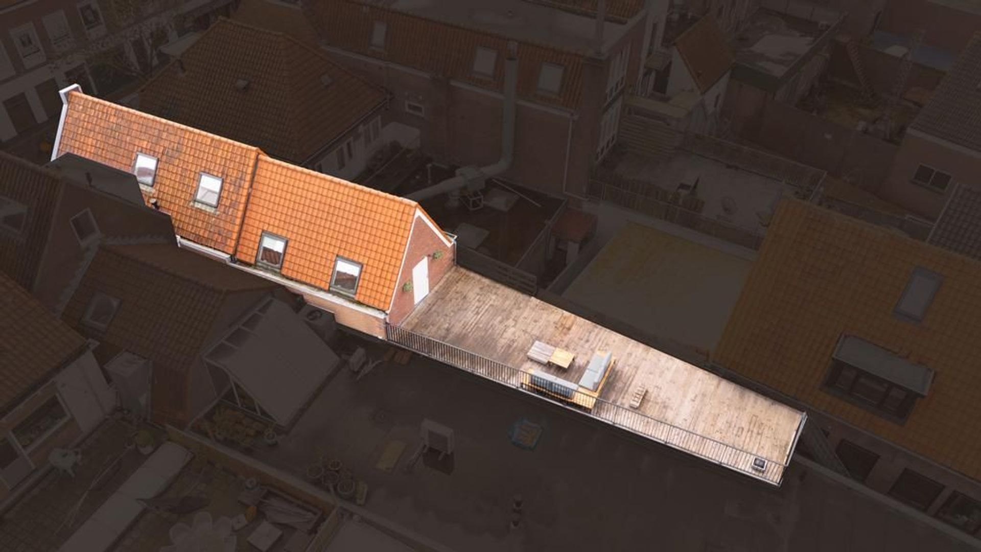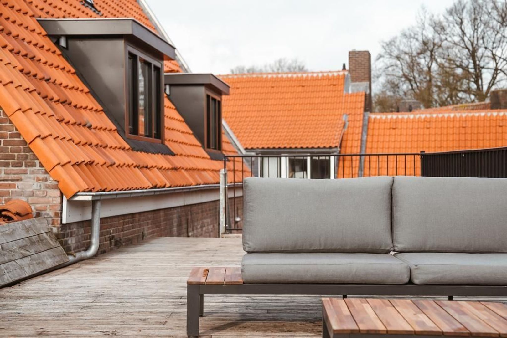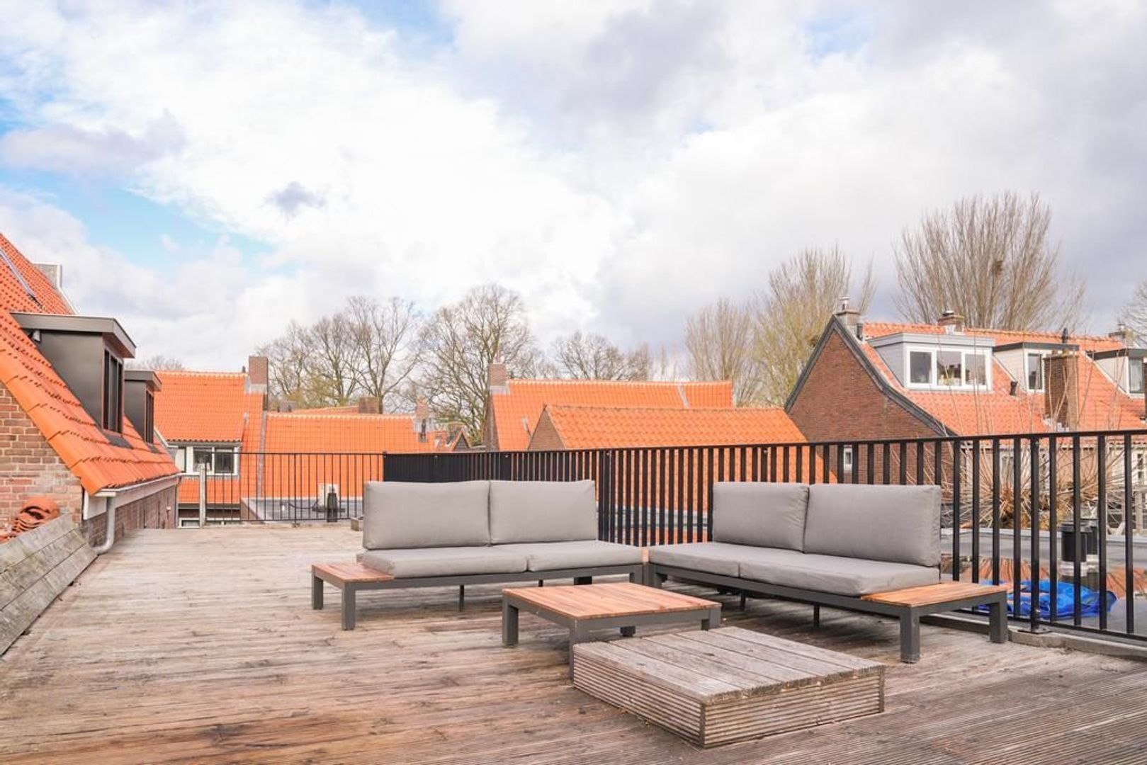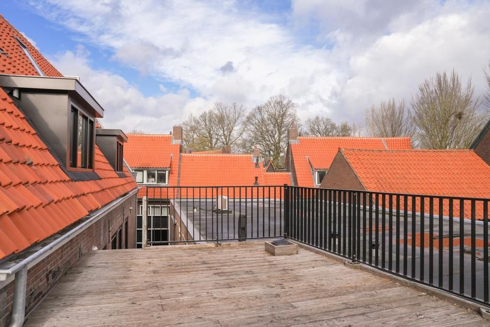 Vanaf de openbare weg bereik je via een degelijke poort en opgang het riante dakterras van de woning. De ligging is grotendeels op het zuiden en biedt dus veel zon en een bijzonder uitzicht over de stad. Via dit dakterras, voorzien van hardhouten vlonderdelen, is de woning bereikbaar en je betreed de woning in de woonkamer. De kamer is efficiënt in te delen en voelt dankzij de hoge kapconstructie lofachtig en ruimtelijk aan. De afwerking op vloeren en wanden is verzorgd. De trap in de woonkamer is een heuse eyecatcher waarmee je de vide bereikt die in gebruik kan worden genomen als 3e kamer.