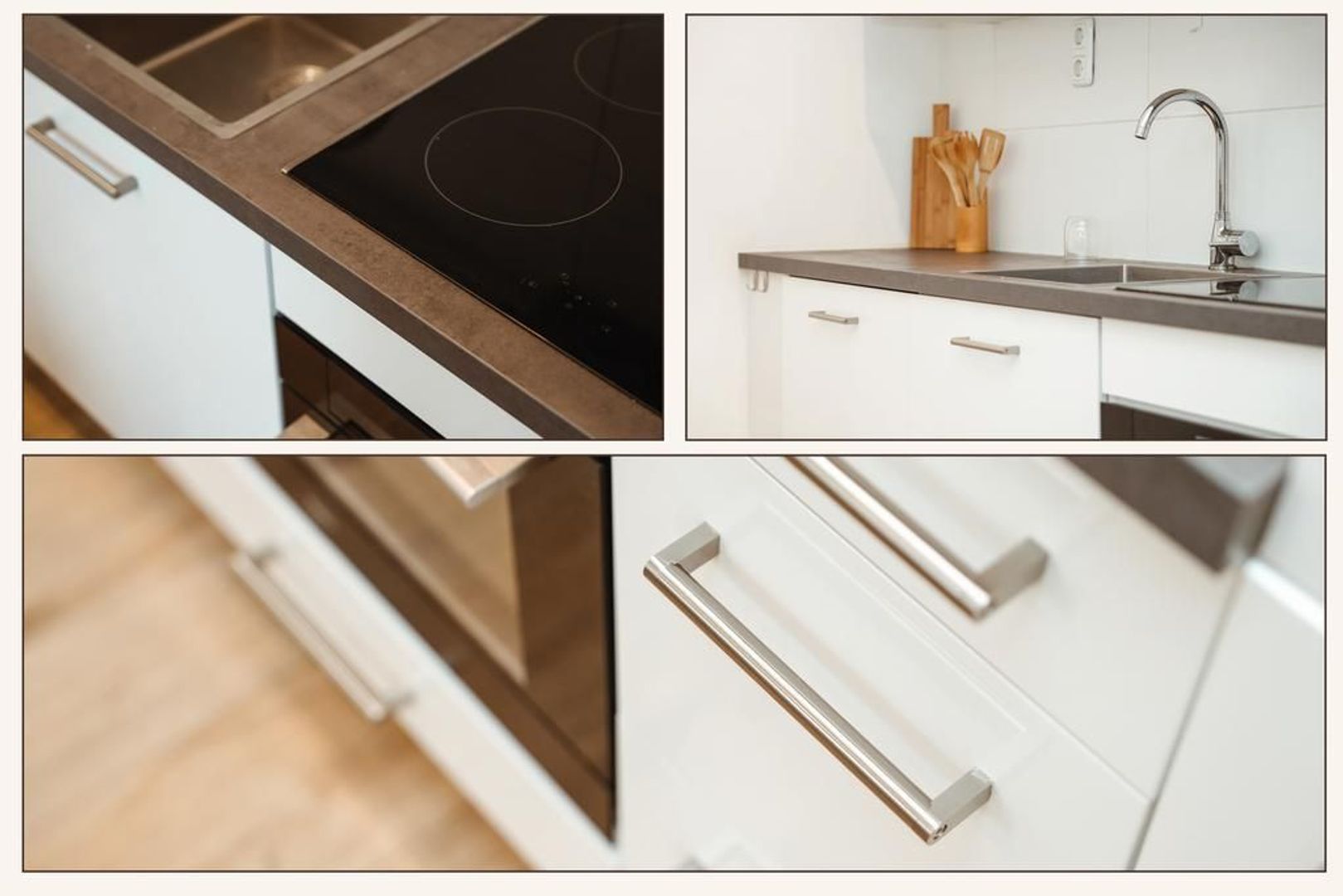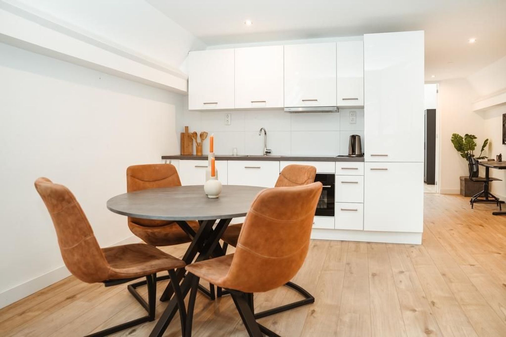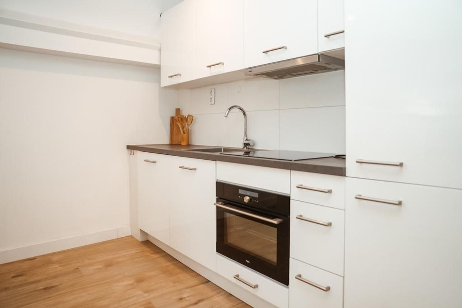 De open keuken heeft een moderne uitstraling en is voorzien van de nodige inbouwapparatuur waaronder een combioven-magnetron, vaatwasser en inductiekookplaat met afzuigschouw.