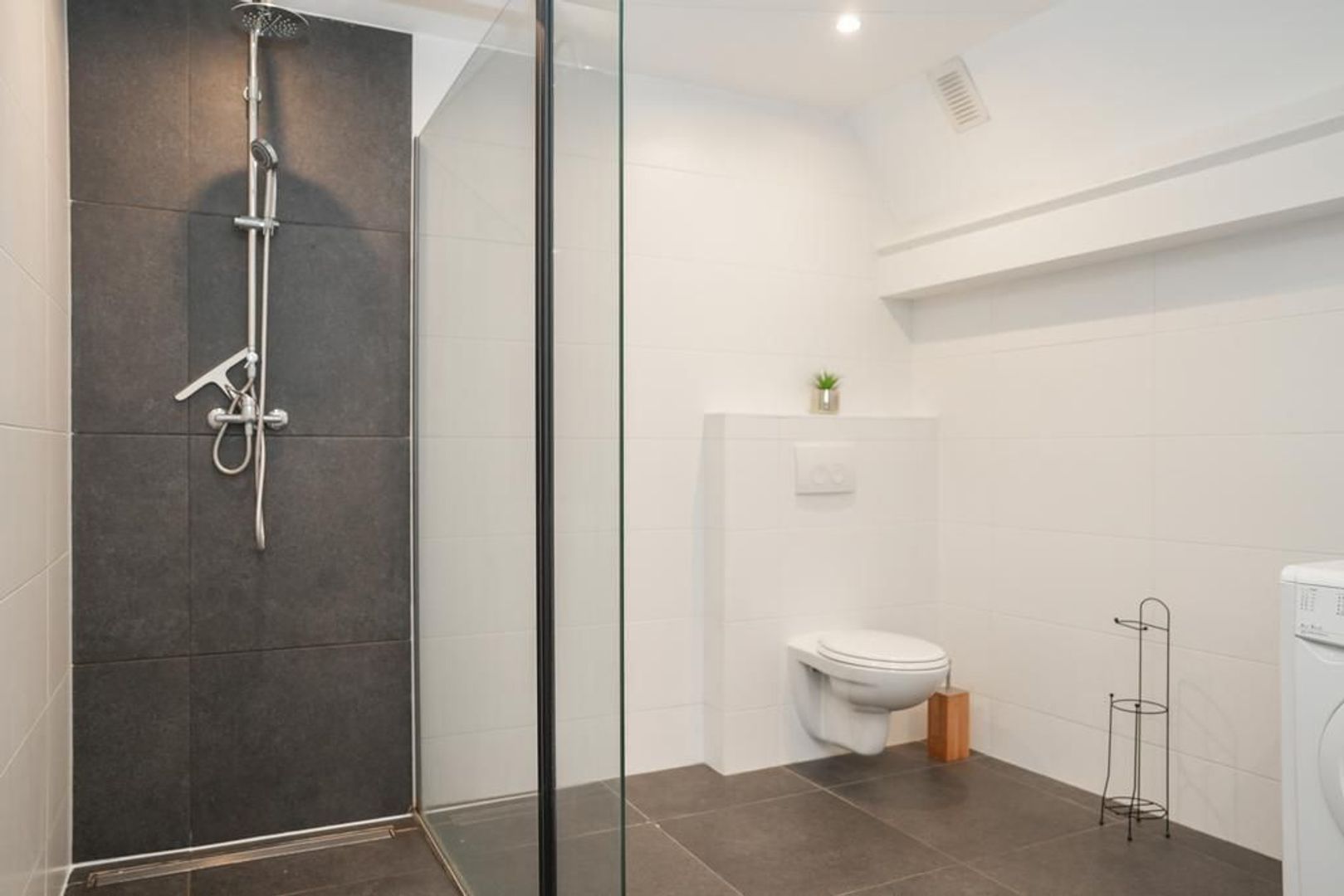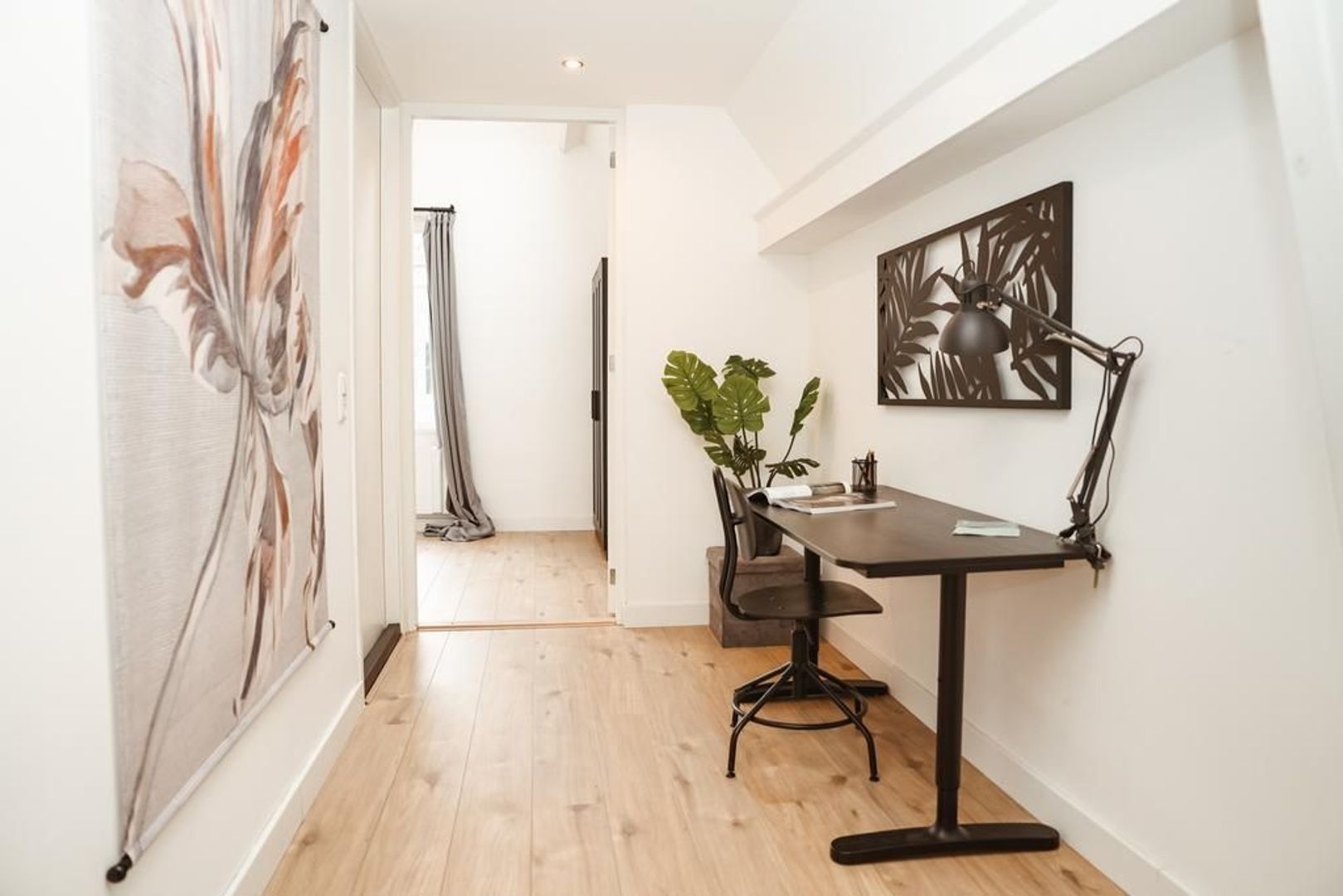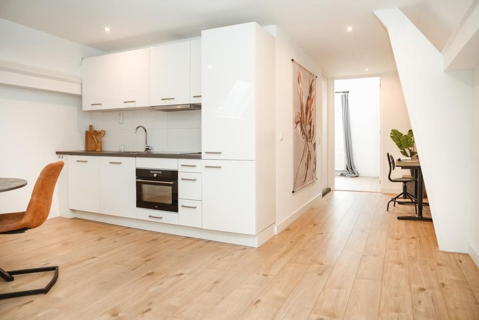 Naast de keuken heb je een doorgang richting de slaap -en badkamer. In deze doorgang is genoeg ruimte voor een fijne werkplek. Door het hoge plafond heb je een erg ruime slaapkamer met genoeg ruimte voor een tweepersoonsbed en een grote kast. De moderne badkamer is van alle gemakken voorzien. Zo heb je een ruim inloopdouche, een dubbele wastafel met meubel, een handdoekenradiator en een witgoed aansluiting.