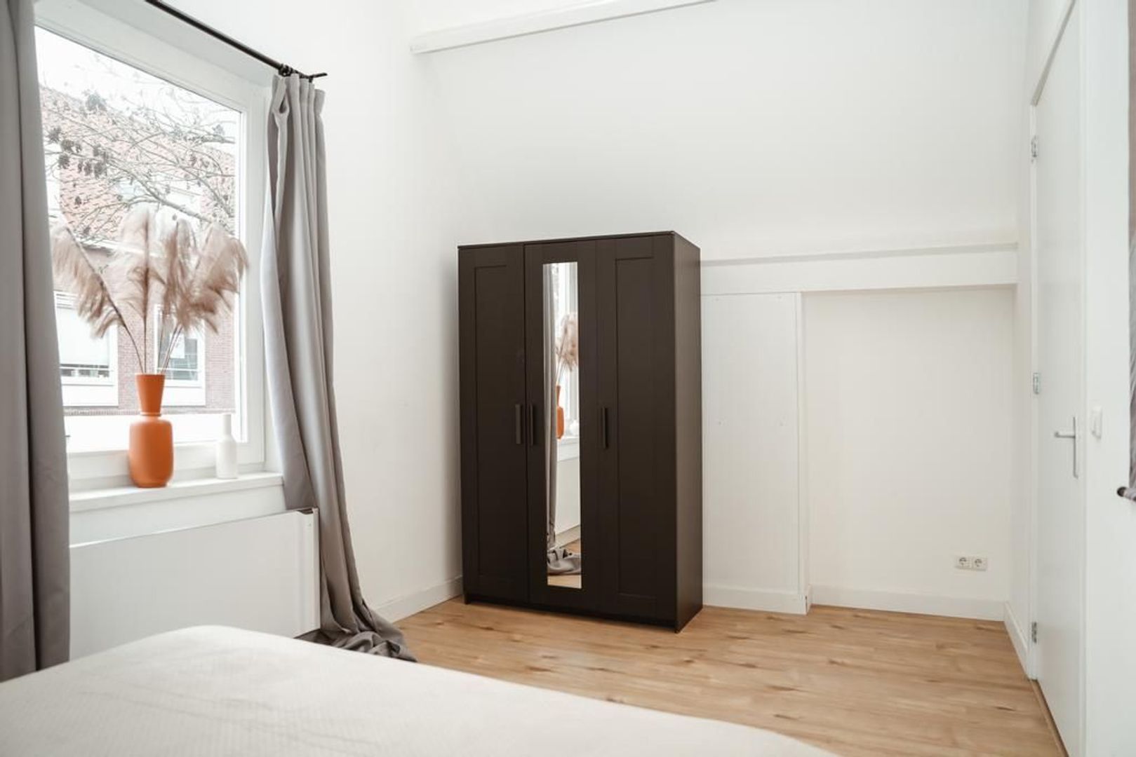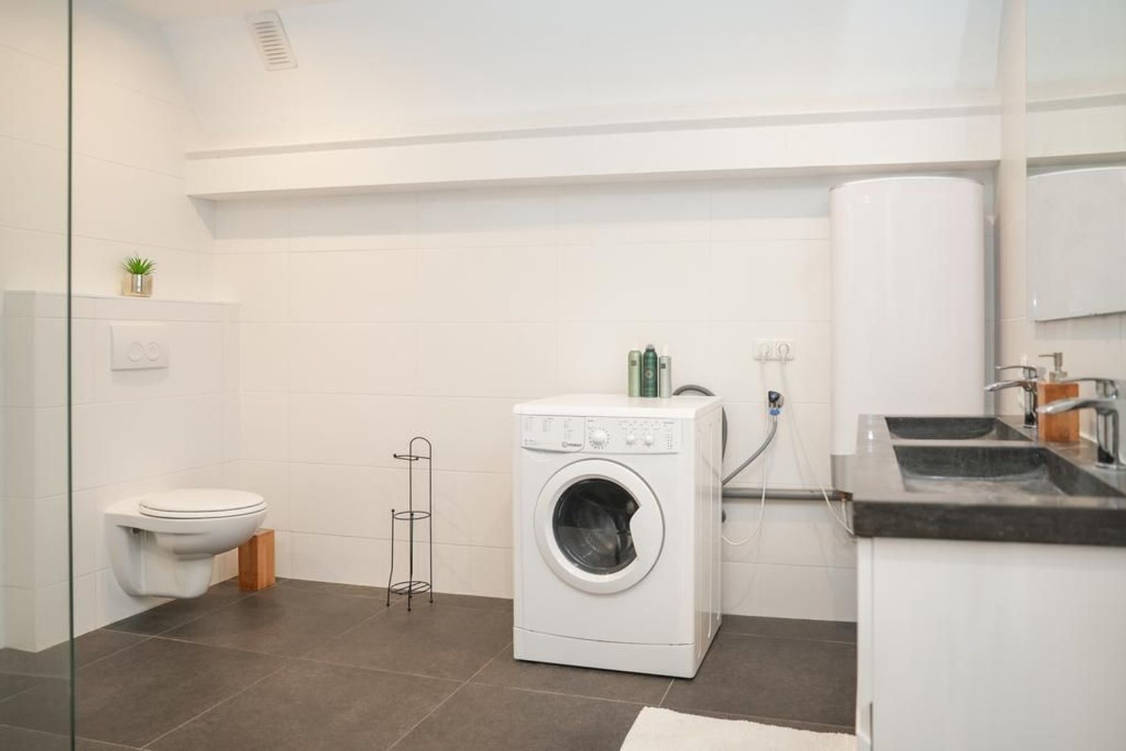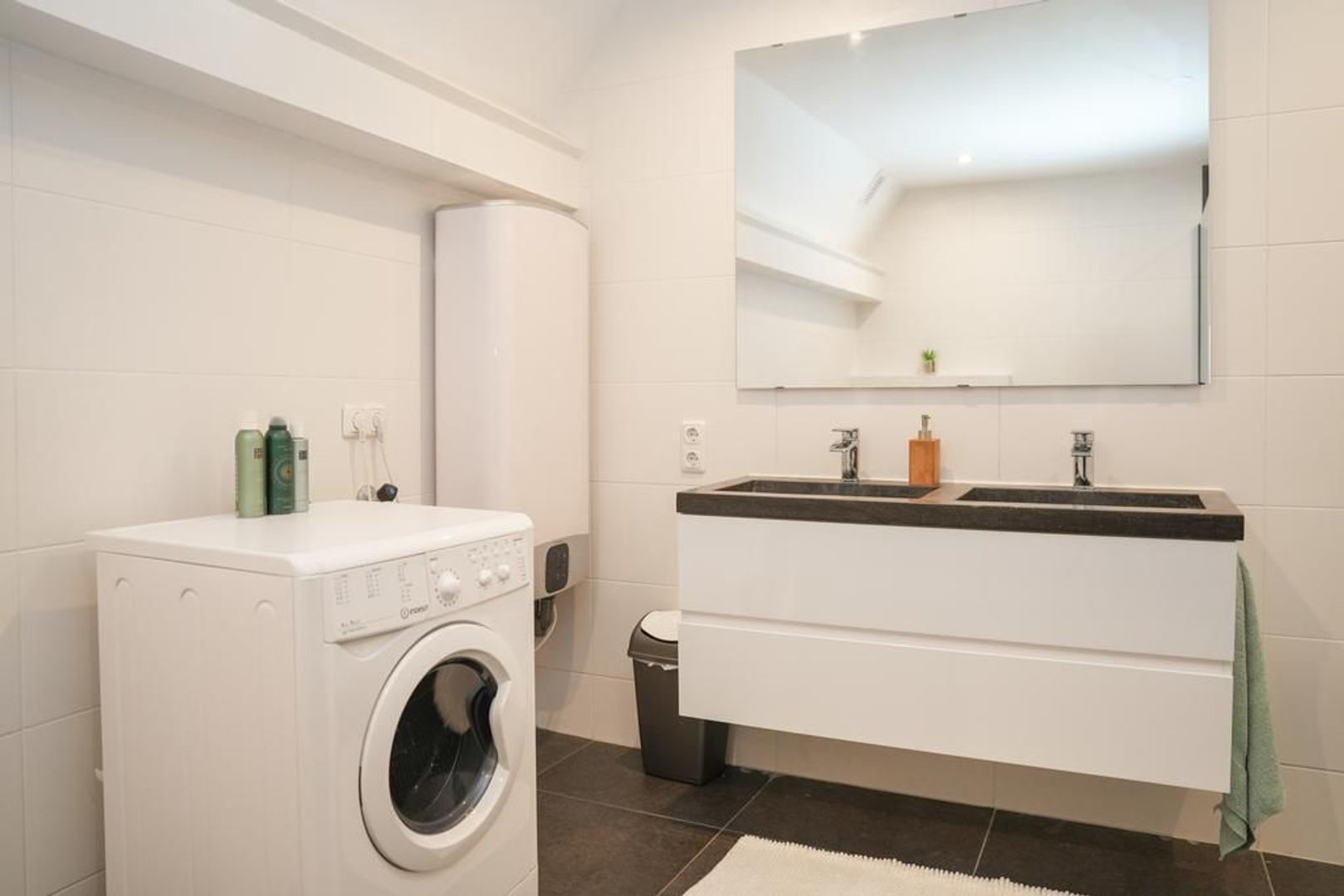 Naast de keuken heb je een doorgang richting de slaap -en badkamer. In deze doorgang is genoeg ruimte voor een fijne werkplek. Door het hoge plafond heb je een erg ruime slaapkamer met genoeg ruimte voor een tweepersoonsbed en een grote kast. De moderne badkamer is van alle gemakken voorzien. Zo heb je een ruim inloopdouche, een dubbele wastafel met meubel, een handdoekenradiator en een witgoed aansluiting.