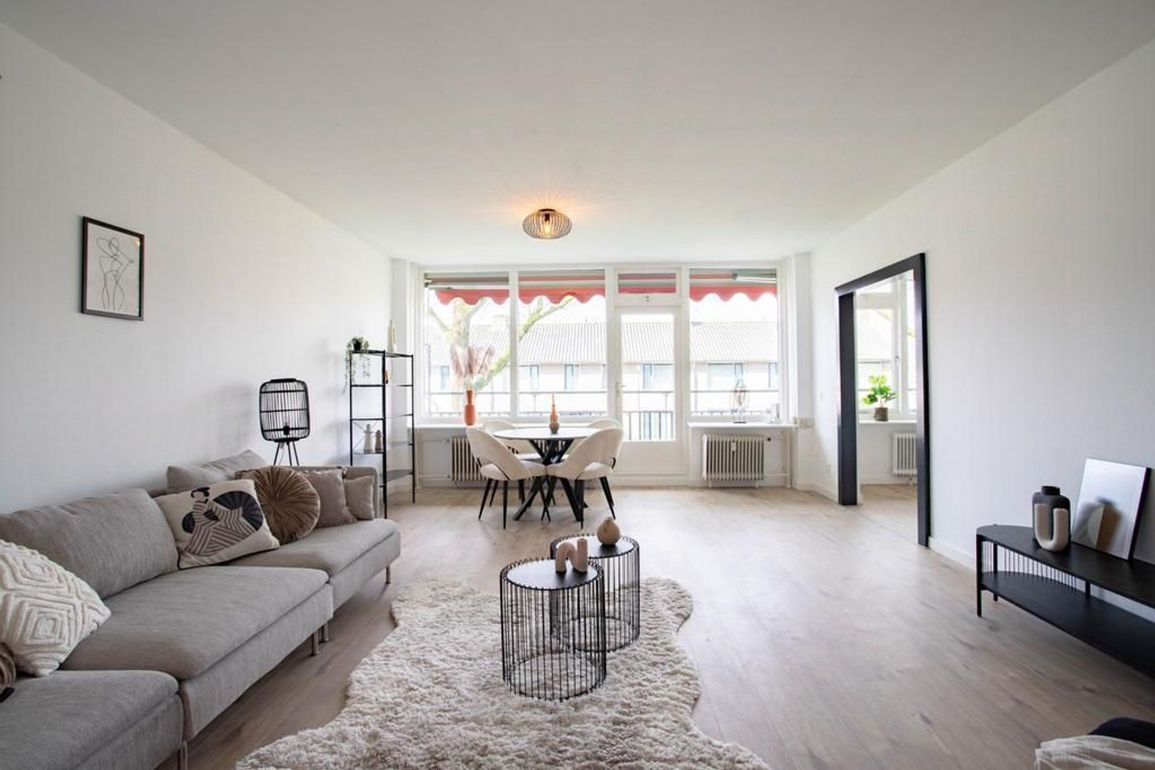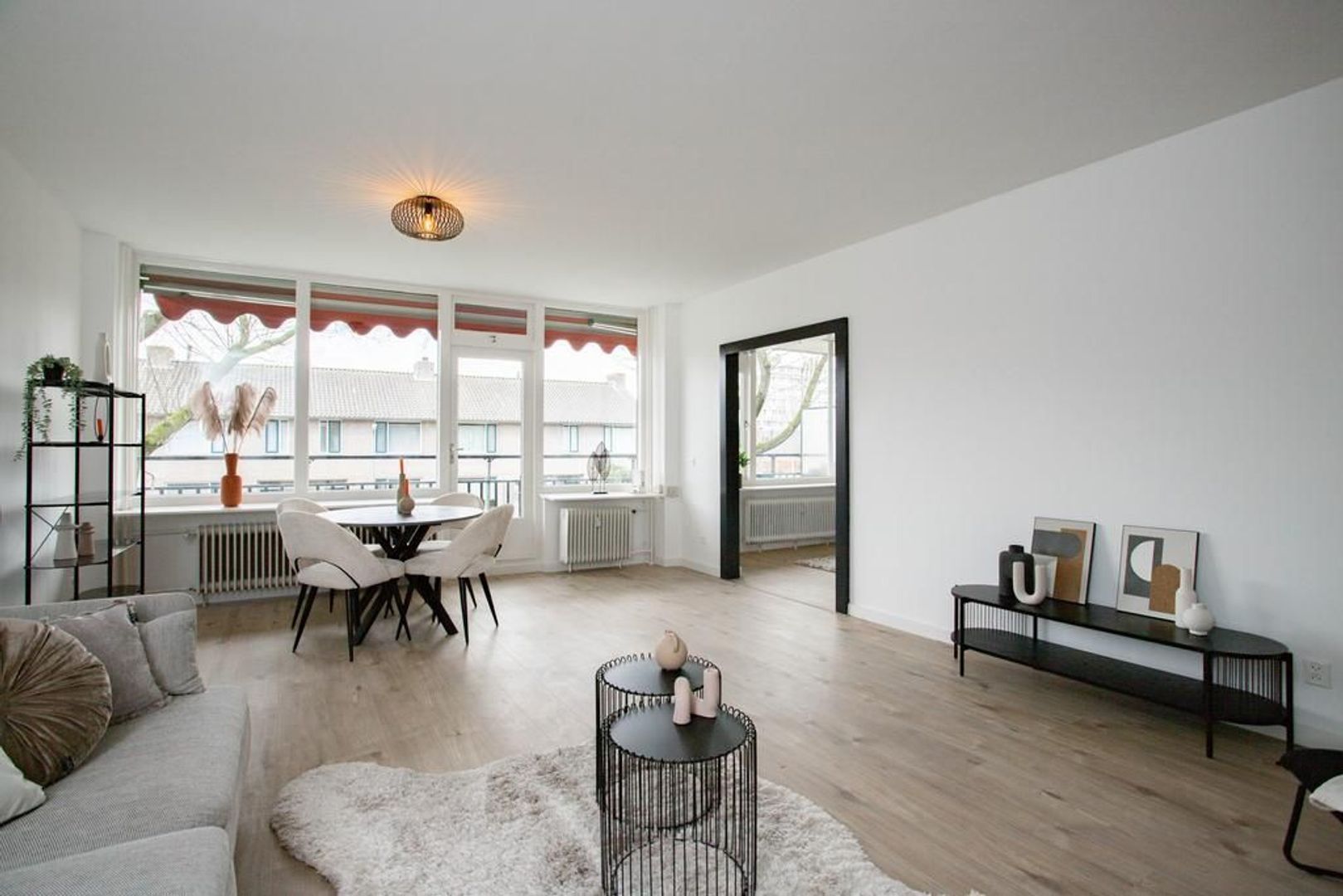De riante woonkamer, geschikt voor meerdere indelingsvarianten, geeft toegang tot het balkon dat over de gehele breedte van de woning is gelegen. Dankzij de ligging op het westen is de middag/avondzon op het balkon te vinden en dankzij de bomen is er voldoende privacy aanwezig. Naast de ruime woonkamer zijn er twee slaapkamers en werkkamer aanwezig. De half open werkkamer kan vrij eenvoudig worden afgesloten waardoor er een derde slaapkamer wordt gecreëerd.