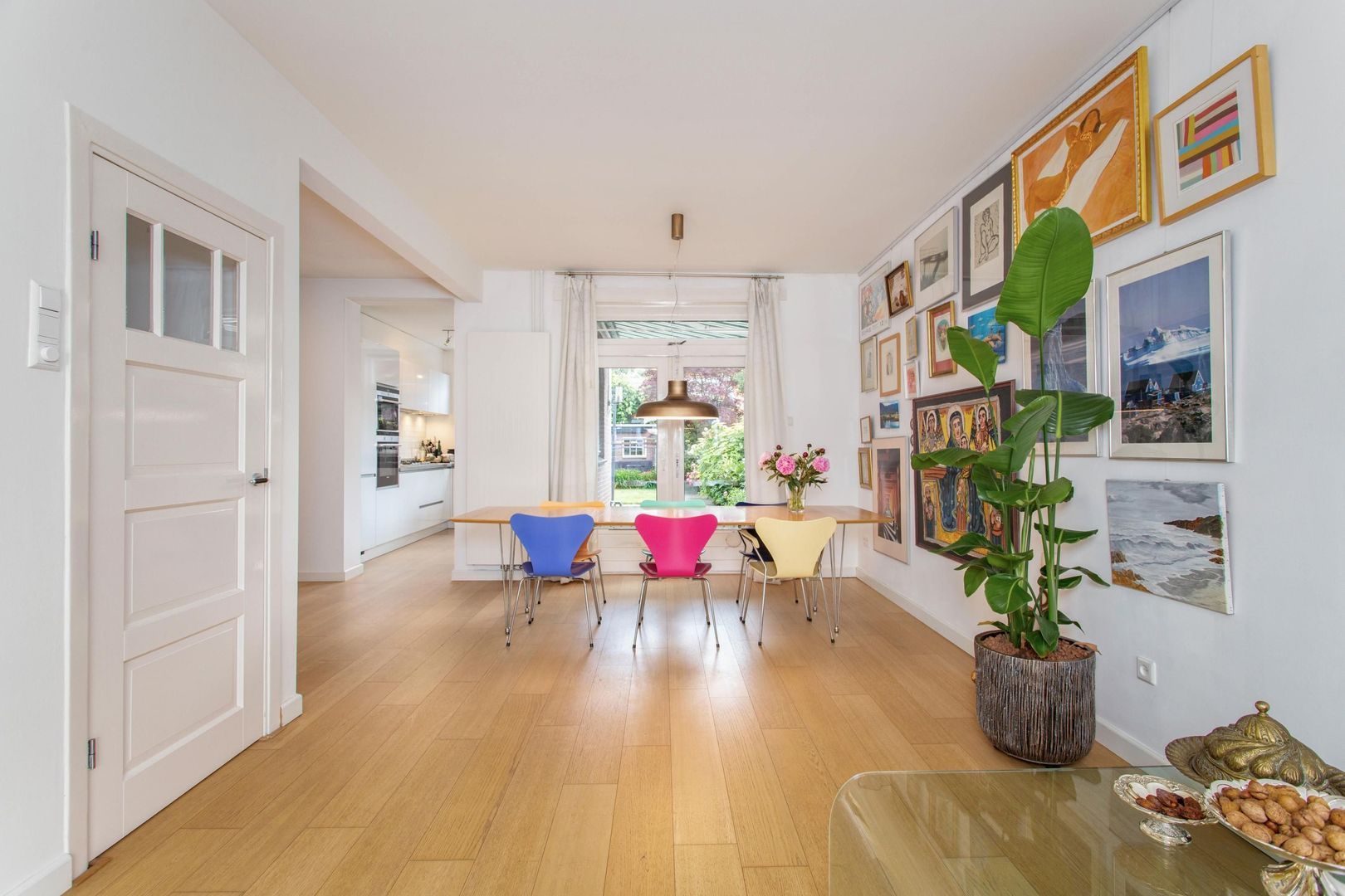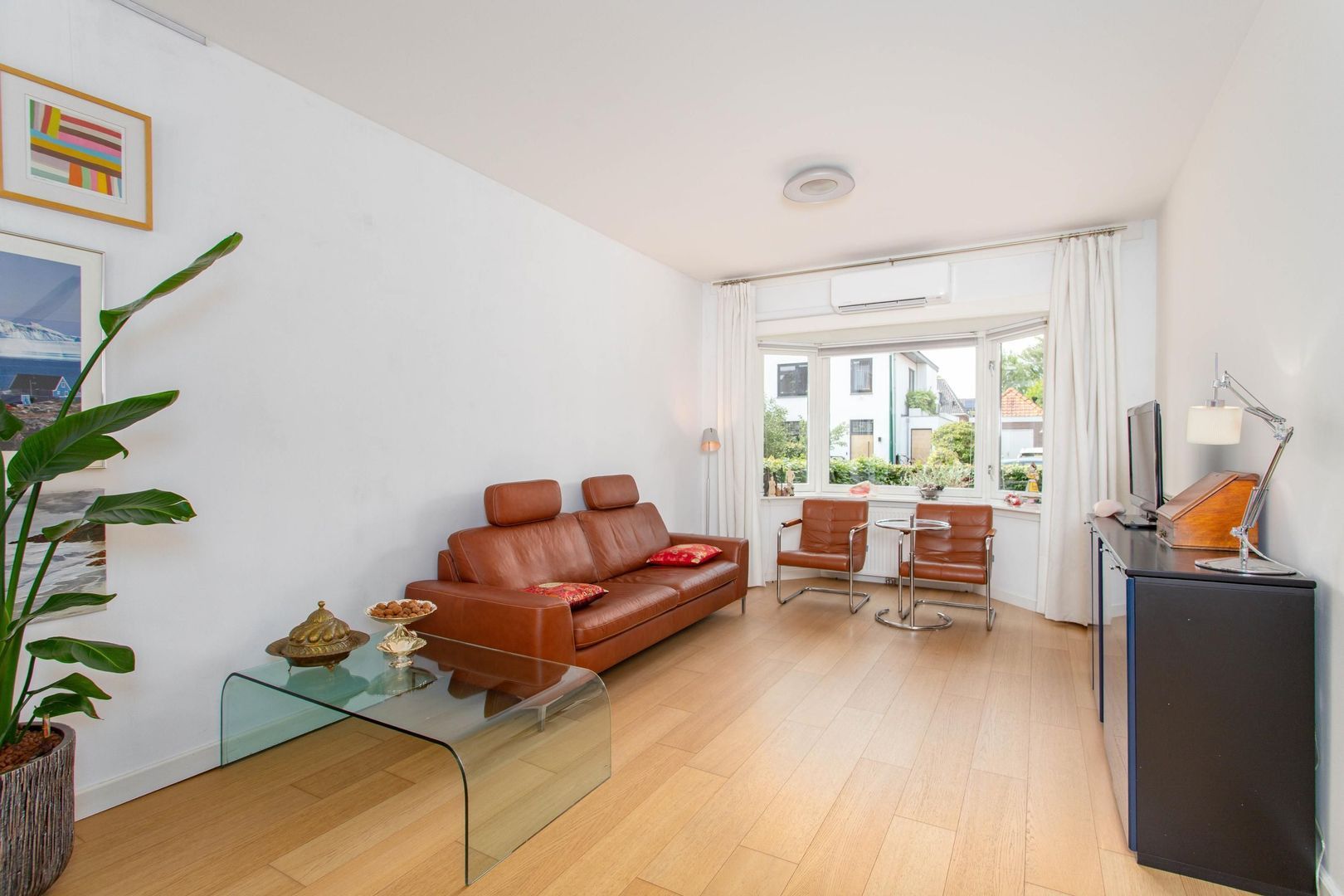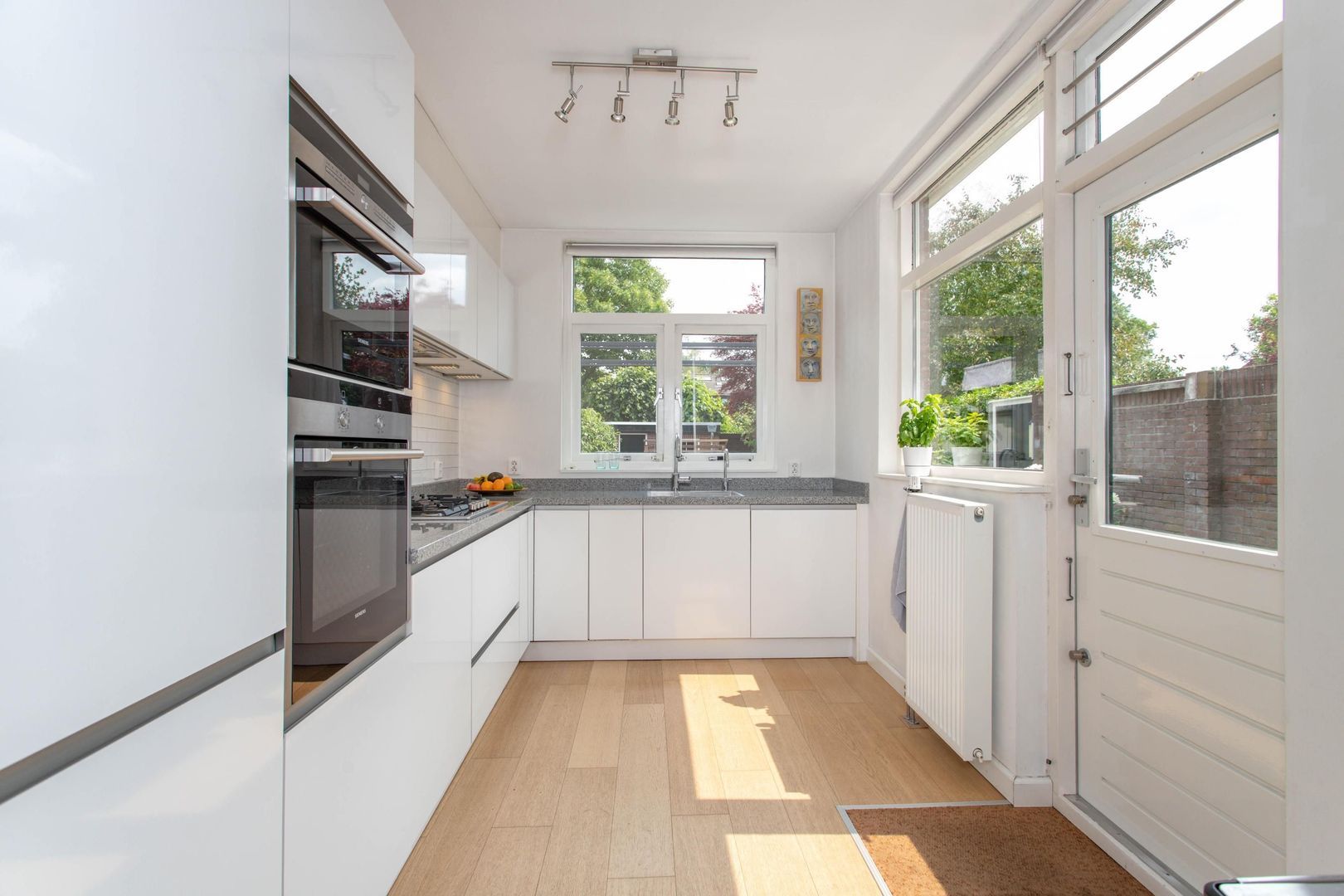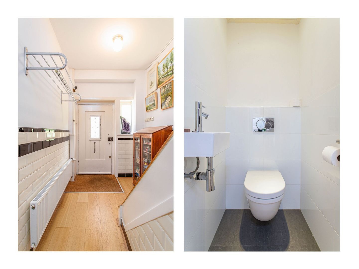 Via de fraai aangelegde voortuin bereik je de karakteristieke voordeur die toegang biedt tot de hal. Hier bevinden zich de kelderkast met de meterkast. Separaat toilet. Vanuit de hal heb je toegang tot de woonkamer en de trapopgang. De woonkamer is heerlijk ruim, met een gezellige erker aan de voorzijde waar het zitgedeelte zich bevindt. Aangrenzend vind je de eetkamer, die eveneens royaal is. Vanuit de eetkamer is de keuken te bereiken. De keuken is uitgevoerd in een frisse, voornamelijk witte kleurstelling met een grijs composiet keukenblad en baadt in het licht dankzij de vele ramen. Je vindt er diverse inbouwapparaten: oven, magnetron, gaskookplaat, Quooker-kraan, koelkast, vriezer, vaatwasser en afzuigkap. Tevens is er een split airco aanwezig voor verwarmen- en koelen.