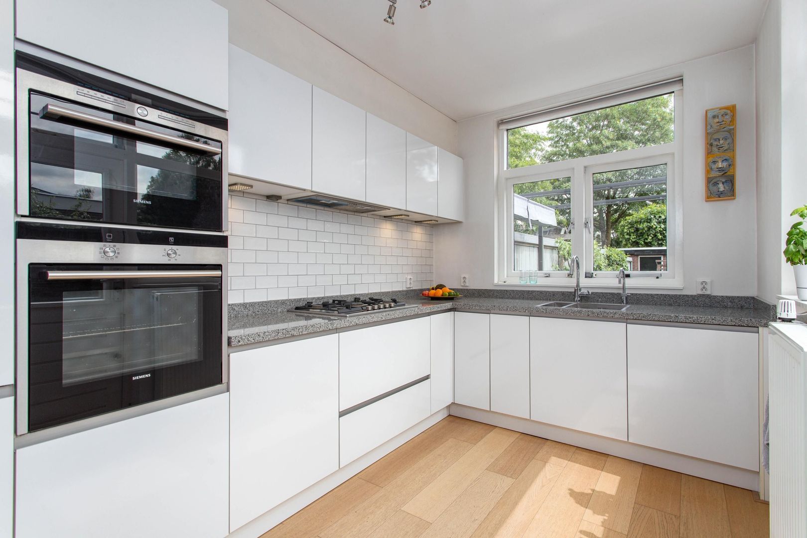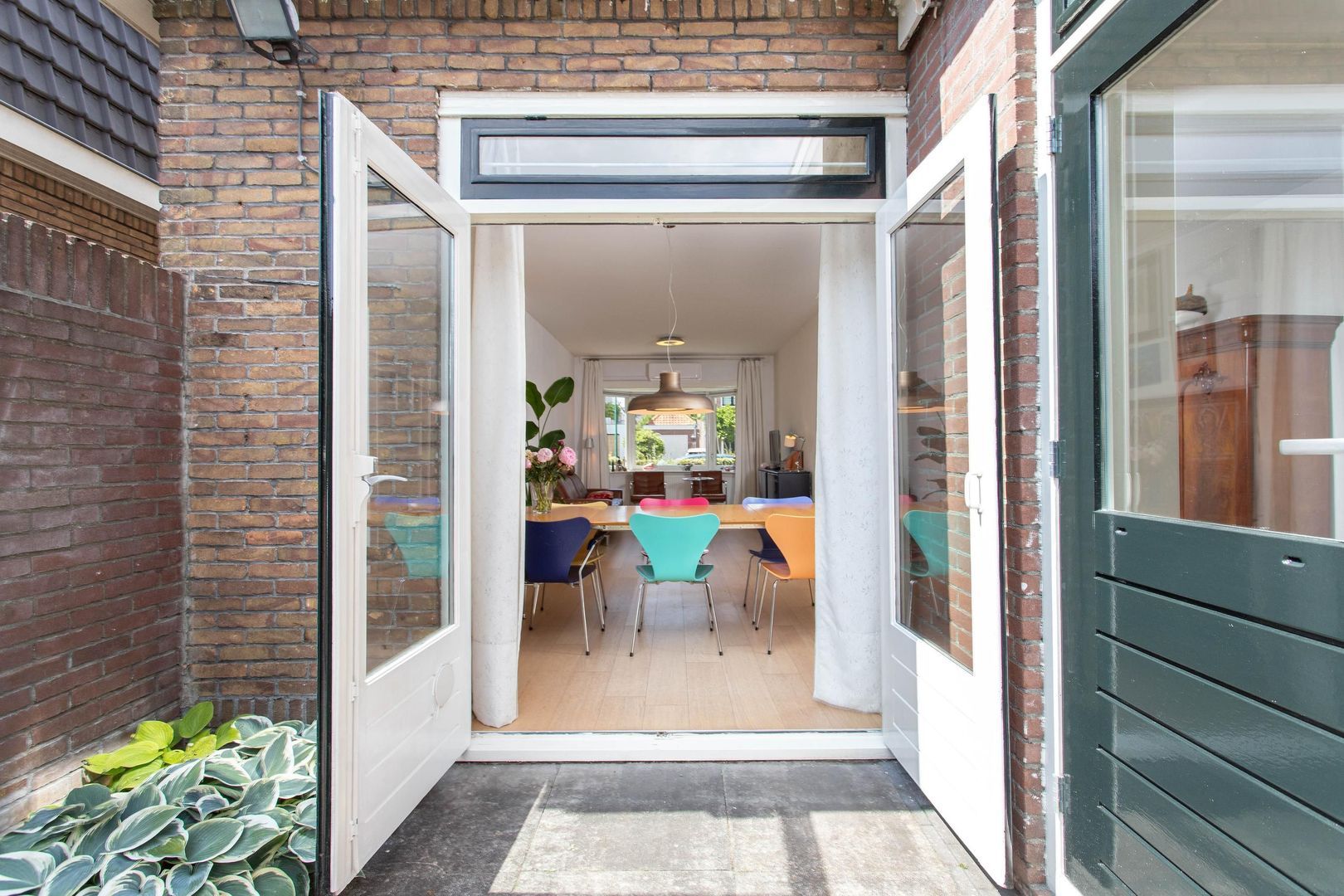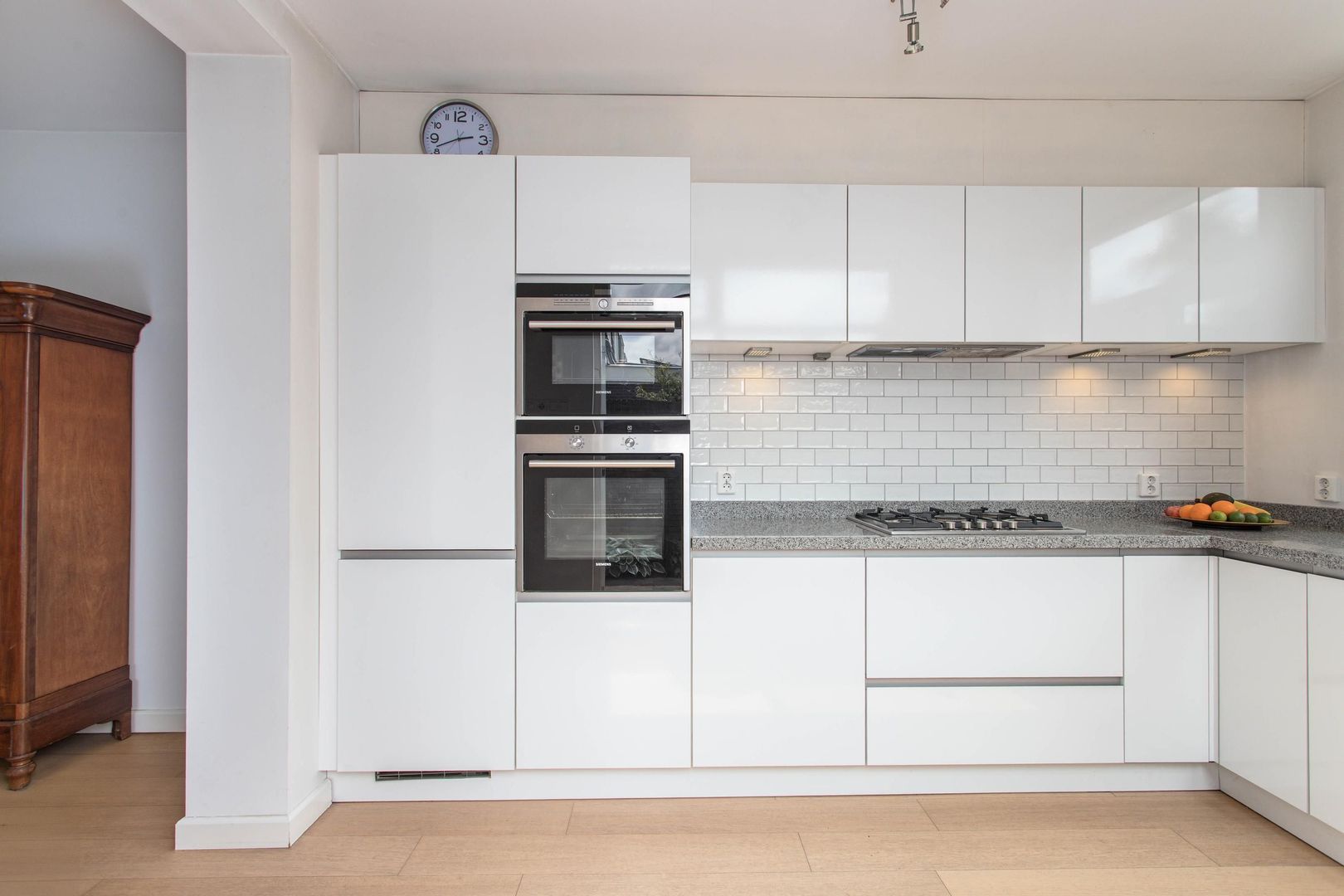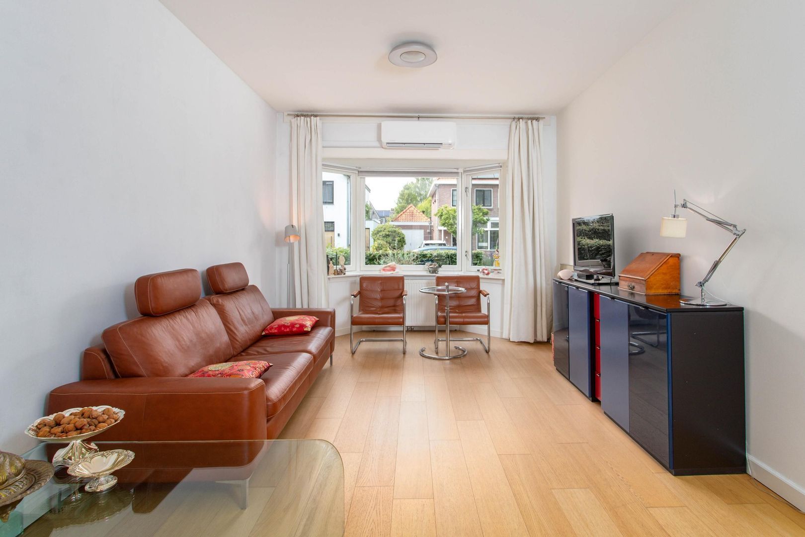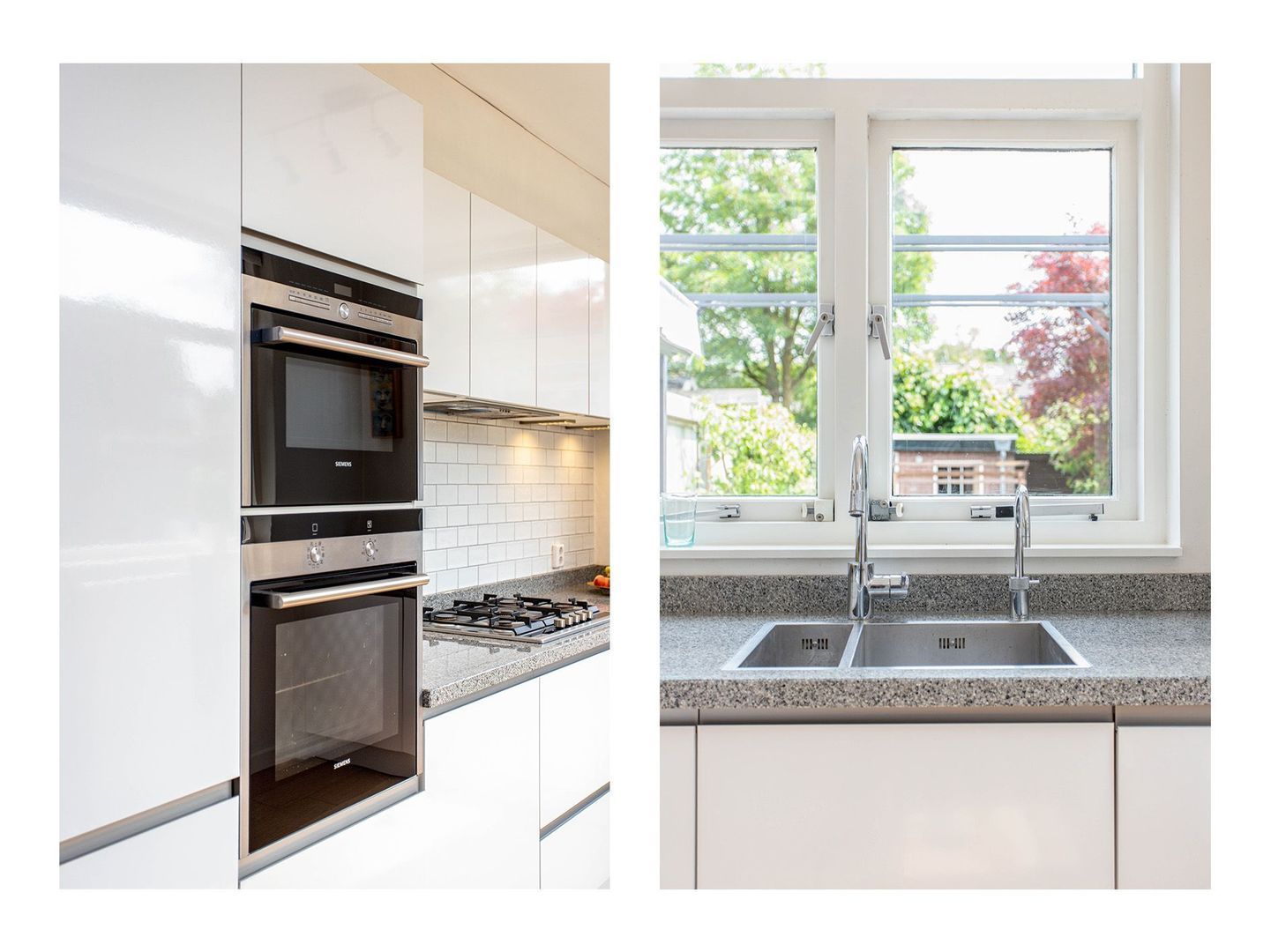 Via de fraai aangelegde voortuin bereik je de karakteristieke voordeur die toegang biedt tot de hal. Hier bevinden zich de kelderkast met de meterkast. Separaat toilet. Vanuit de hal heb je toegang tot de woonkamer en de trapopgang. De woonkamer is heerlijk ruim, met een gezellige erker aan de voorzijde waar het zitgedeelte zich bevindt. Aangrenzend vind je de eetkamer, die eveneens royaal is. Vanuit de eetkamer is de keuken te bereiken. De keuken is uitgevoerd in een frisse, voornamelijk witte kleurstelling met een grijs composiet keukenblad en baadt in het licht dankzij de vele ramen. Je vindt er diverse inbouwapparaten: oven, magnetron, gaskookplaat, Quooker-kraan, koelkast, vriezer, vaatwasser en afzuigkap. Tevens is er een split airco aanwezig voor verwarmen- en koelen.
