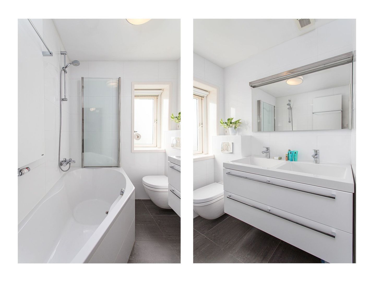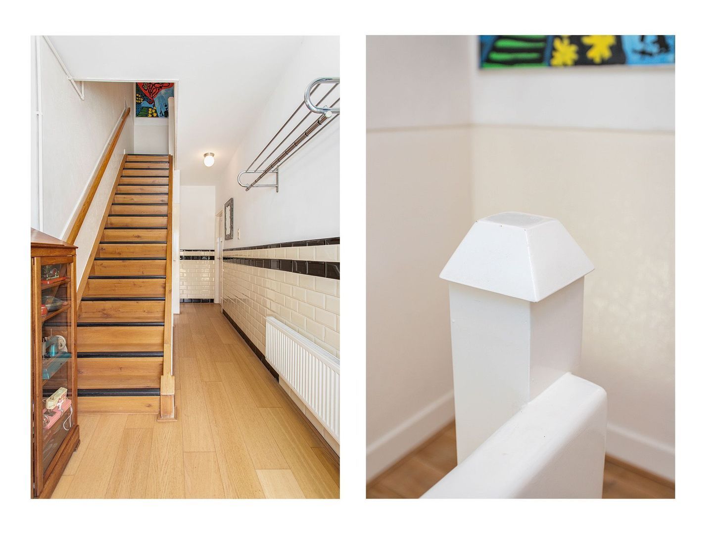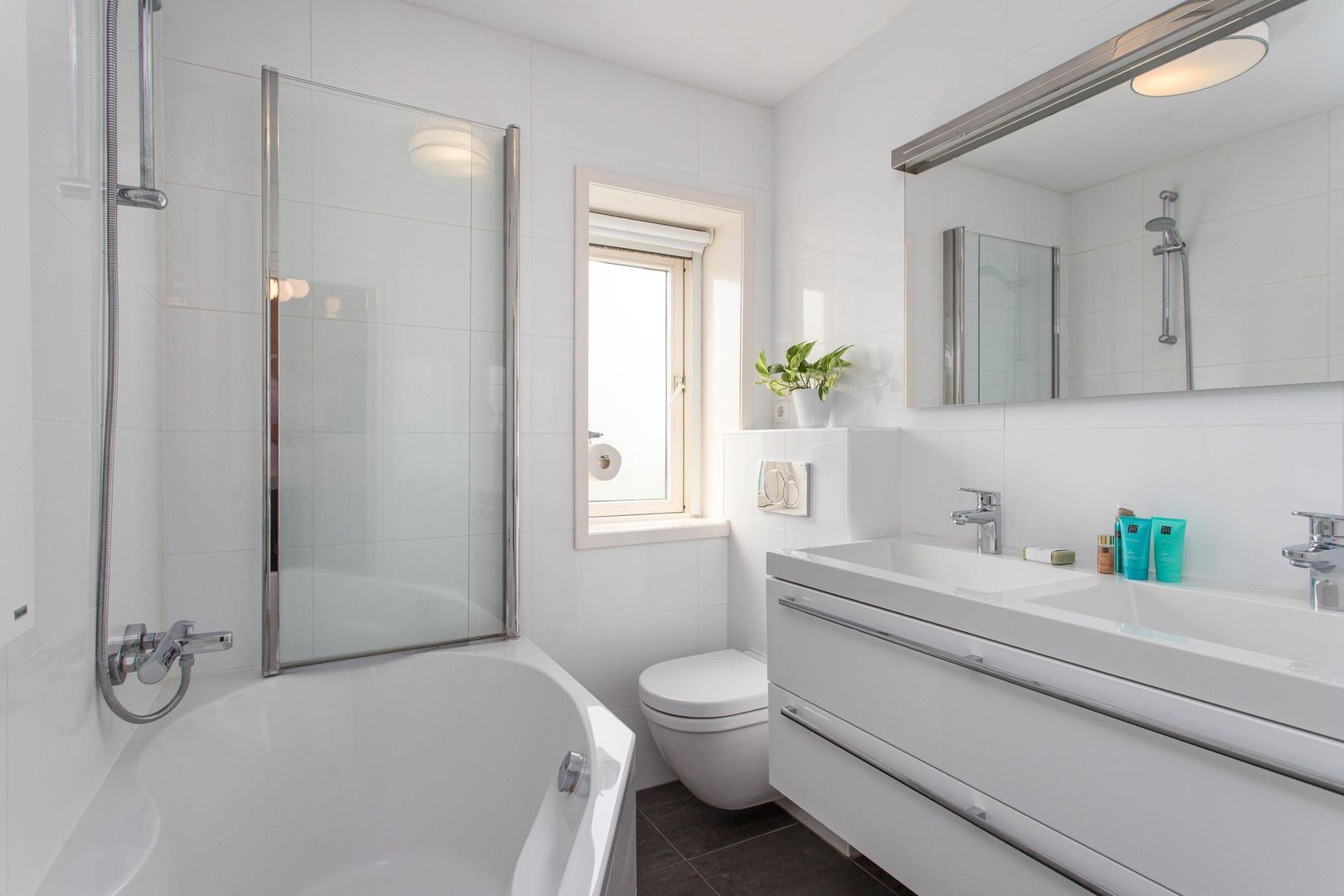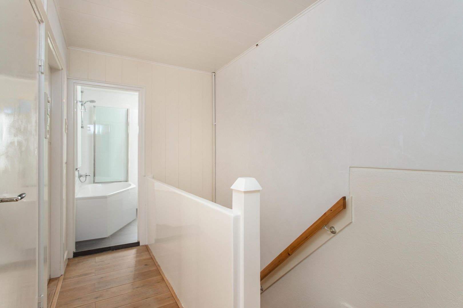 De overloop biedt toegang tot de drie slaapkamers, de badkamer en de trapopgang. De hoofdslaapkamer bevindt zich aan de achterzijde van de woning en biedt een heerlijk uitzicht op de achtertuin. Deze kamer beschikt ook over een praktische trapkast. De andere grote slaapkamer bevindt zich aan de voorzijde van de woning en is bijna even groot en heeft een kastnis onder de trap. Daarnaast is er op deze verdieping nog een kleinere slaapkamer, waar momenteel de witgoedinstallaties zijn geplaatst. De badkamer is erg netjes en van alle gemakken voorzien, zoals een ligbad met douchegedeelte, een toilet en een dubbele wastafel met meubel en spiegel.