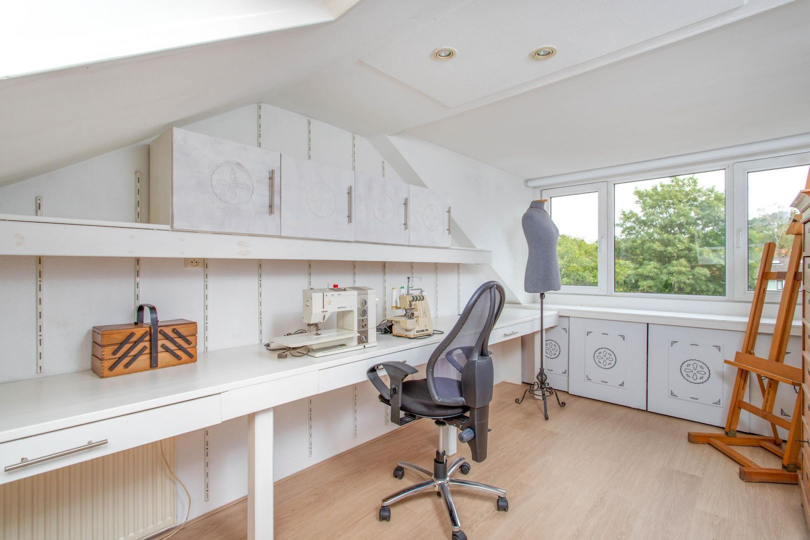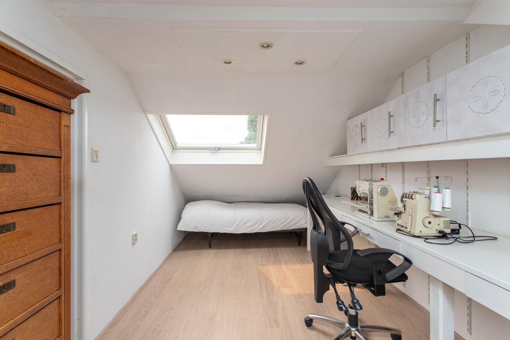 Via de trap tussen de twee slaapkamers bereik je de tweede verdieping van de woning. Deze verdieping bestaat uit een ruime overloop, een slaapkamer en bergruimte achter de knieschotten. Dankzij de dakkapel is de slaapkamer bijna volledig stahoogte. De kamer is ook zeer geschikt als werk- of hobbykamer.