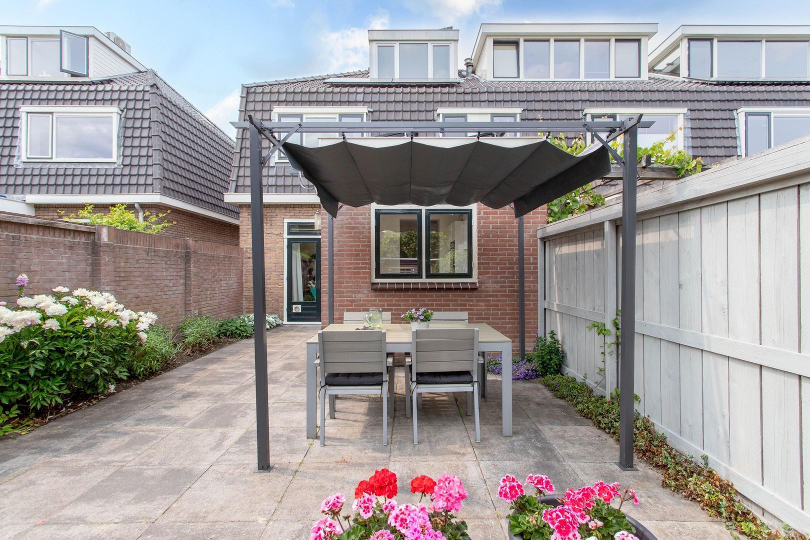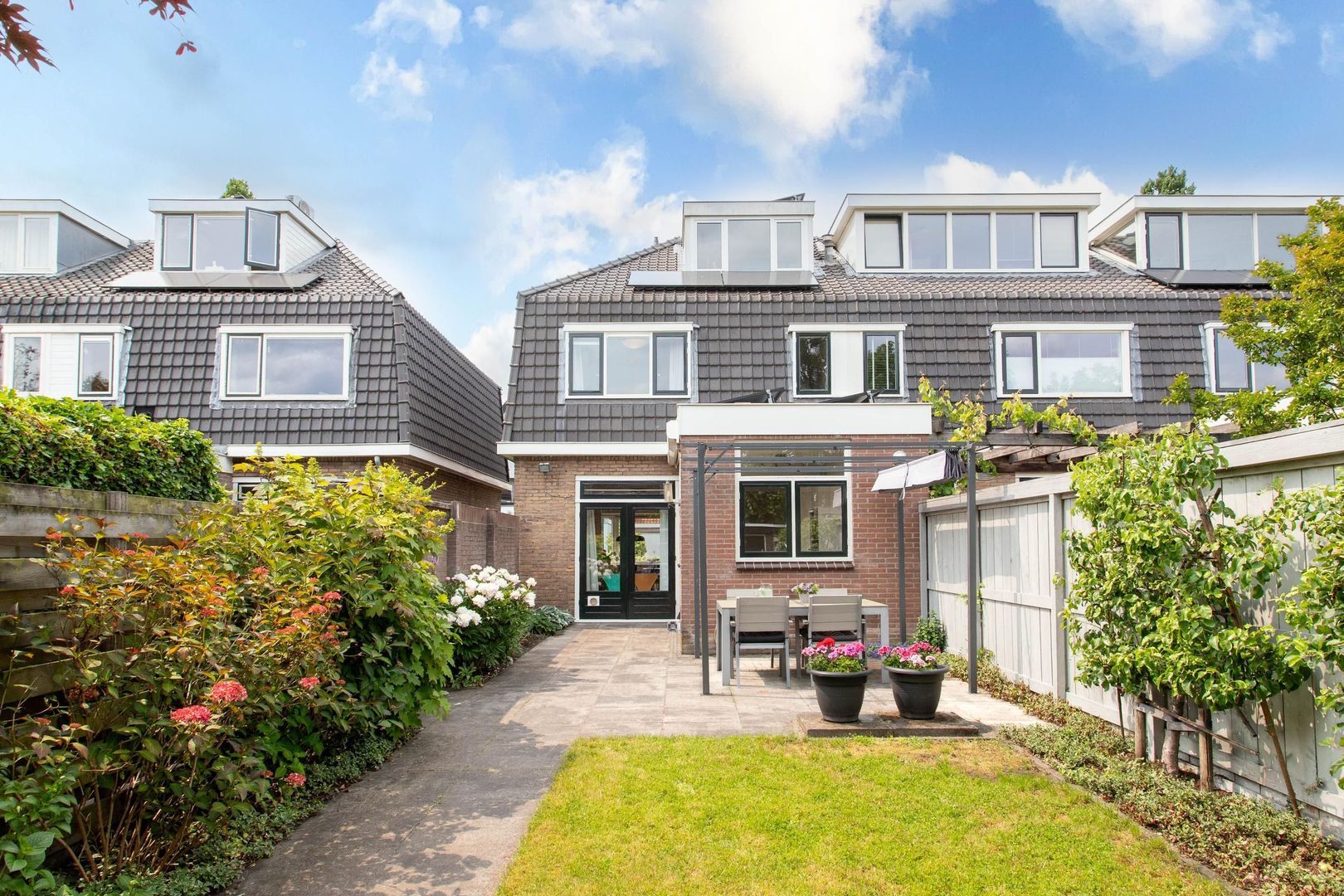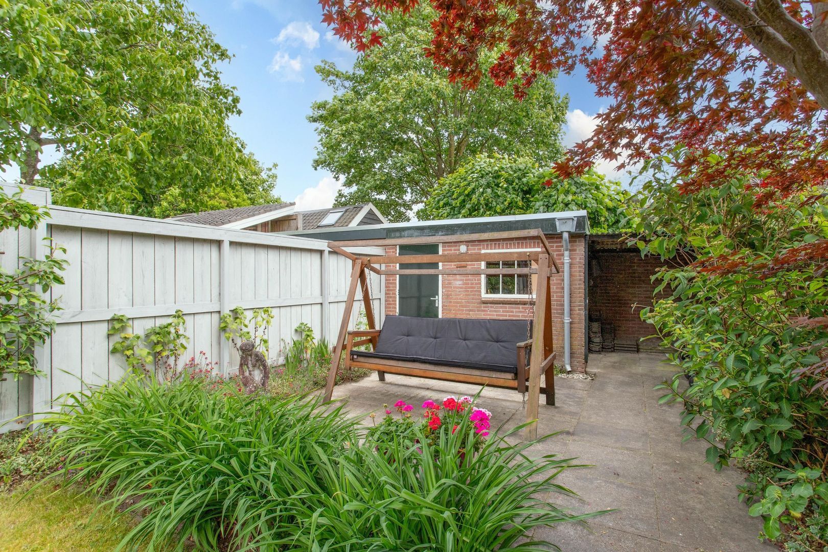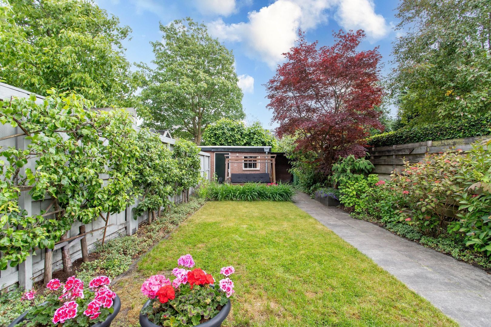 Zowel via de keuken als via de openslaande deuren in de eetkamer is de achtertuin bereikbaar. De achtertuin is zeer verzorgd en loopt diep door naar achteren, waar zich een berging en overkapping bevinden. Halverwege de tuin is de uitgang naar de naastgelegen poort. Er is meer dan genoeg ruimte om te zitten en te relaxen en je kunt genieten van de verschillende leifruitbomen.