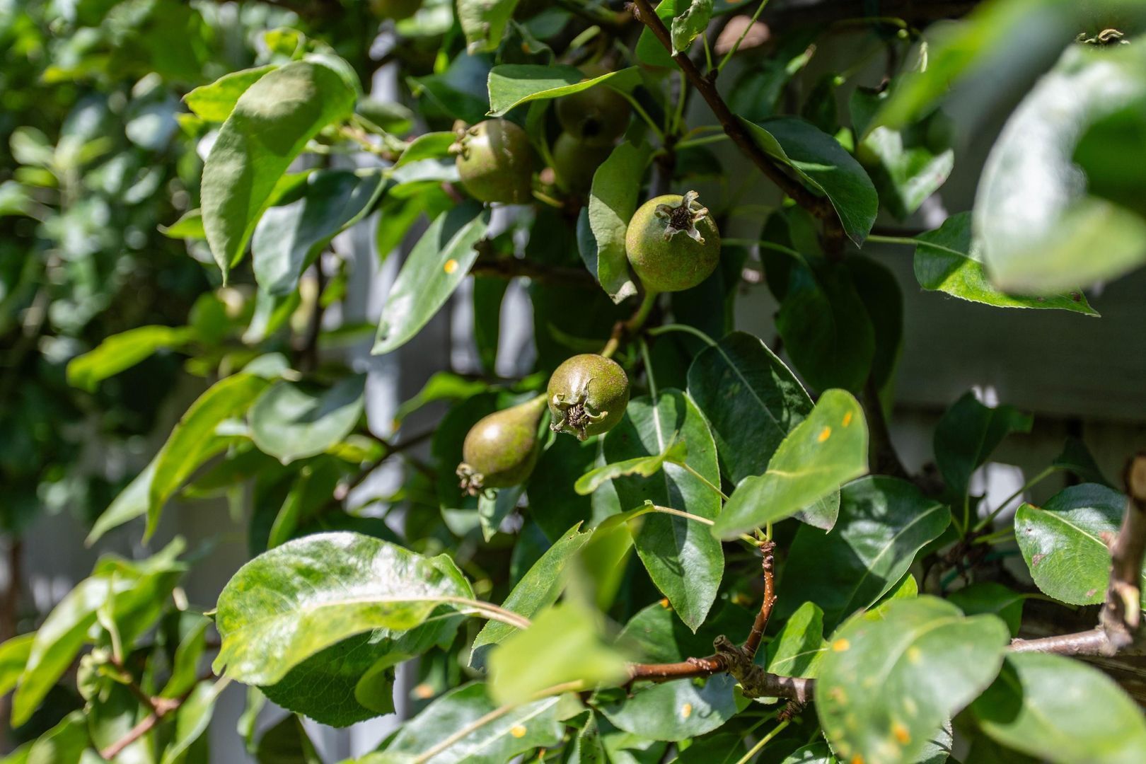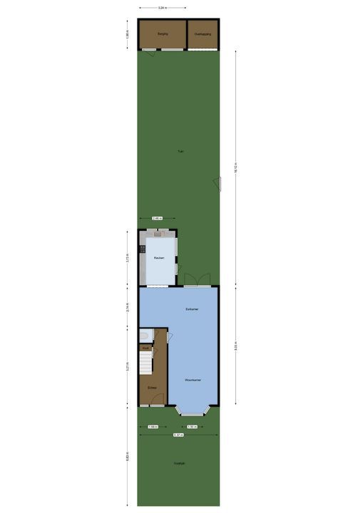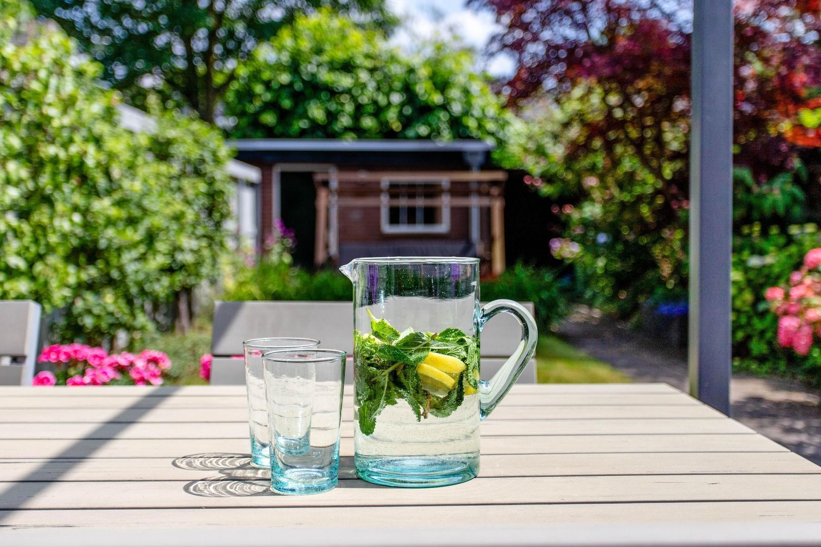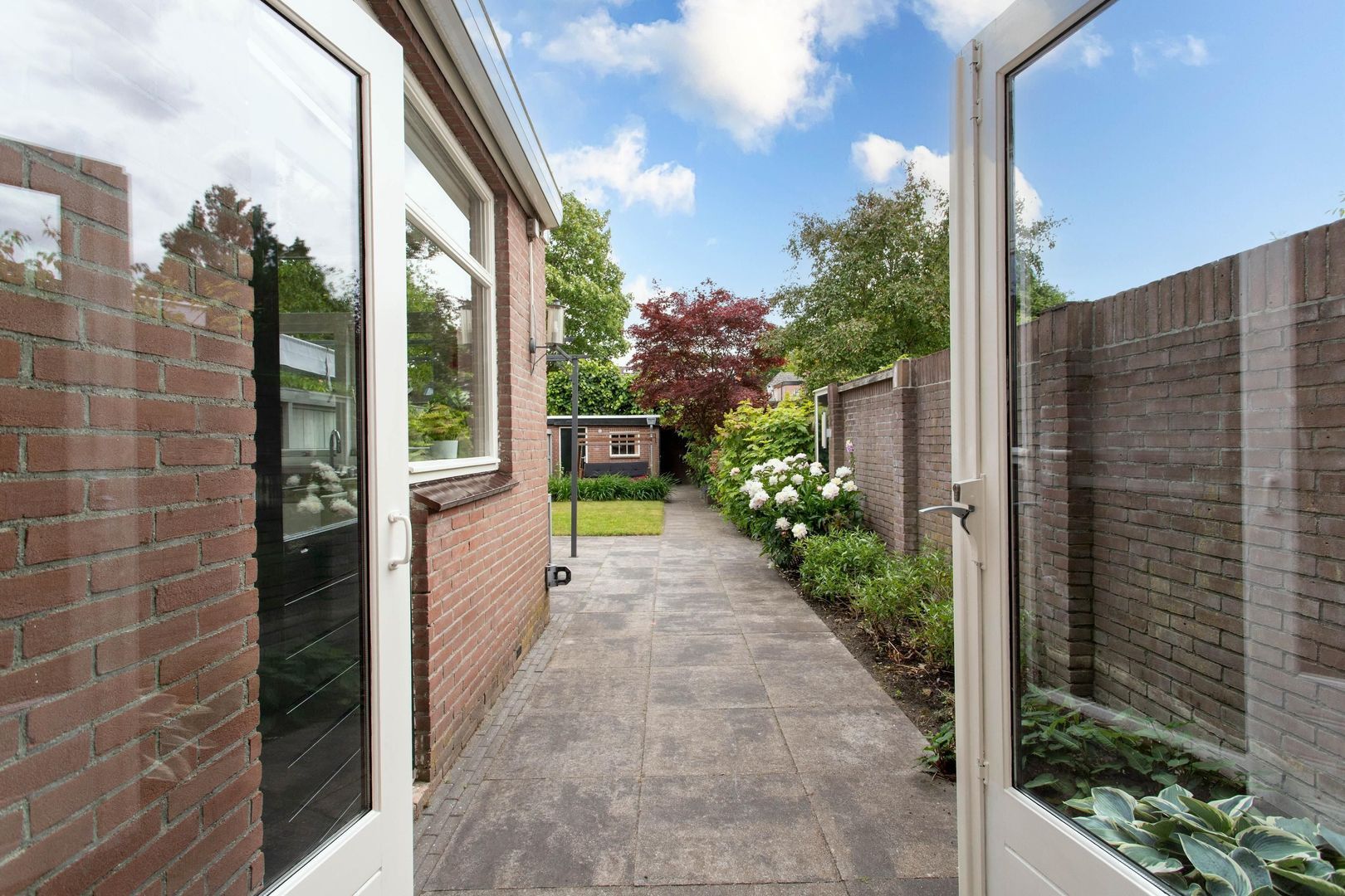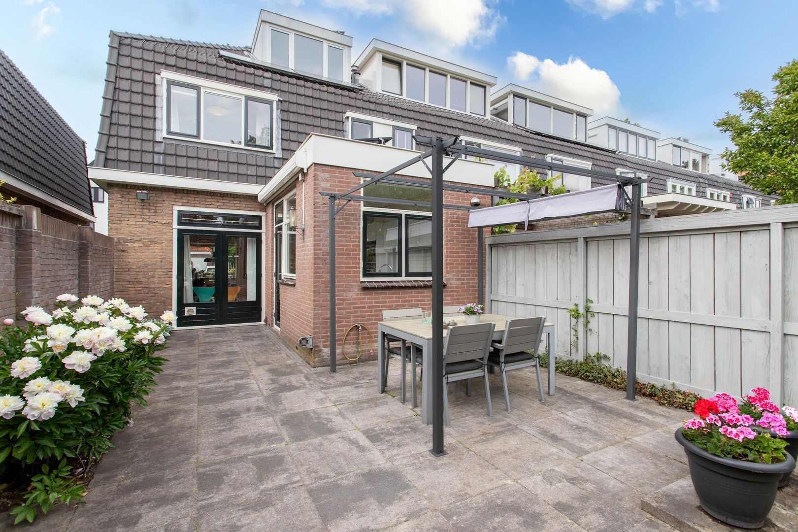 Zowel via de keuken als via de openslaande deuren in de eetkamer is de achtertuin bereikbaar. De achtertuin is zeer verzorgd en loopt diep door naar achteren, waar zich een berging en overkapping bevinden. Halverwege de tuin is de uitgang naar de naastgelegen poort. Er is meer dan genoeg ruimte om te zitten en te relaxen en je kunt genieten van de verschillende leifruitbomen.
