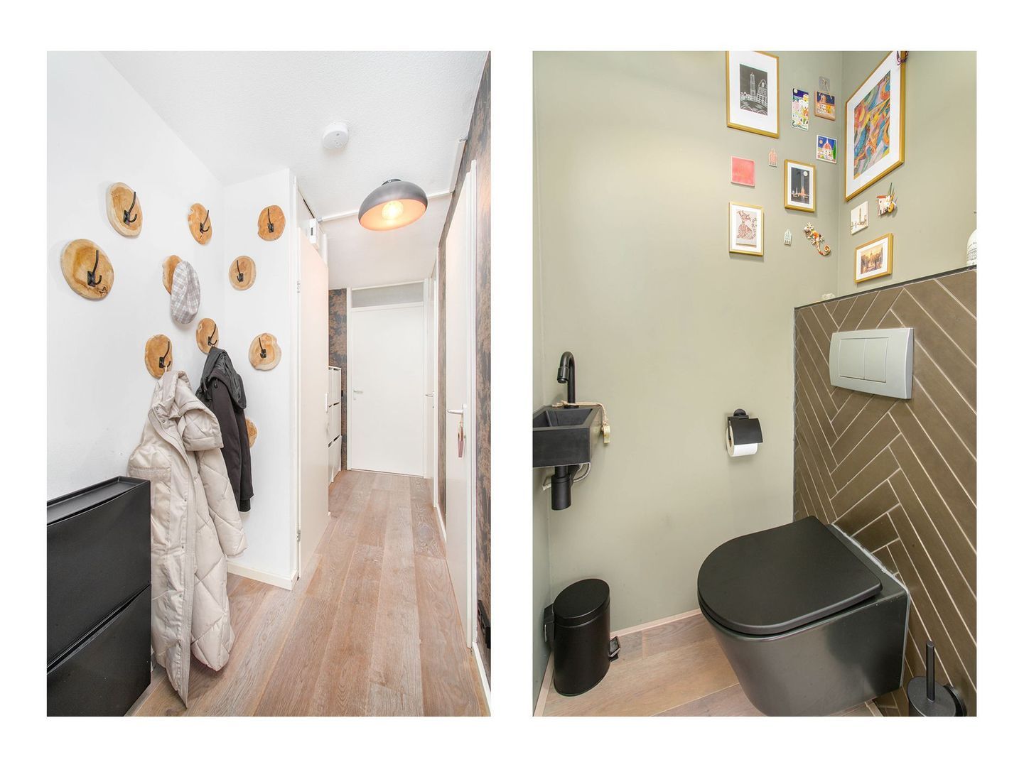 Entree tot de woning. Hal met meterkast, ruime trapkast met wasmachineaansluiting en toiletruimte met hangend toilet, fonteintje en ventilatie. Vanuit de hal kom je in de ruime eetkamer met hoge raampartijen. Aan de linkerzijde bevindt zich de zeer ruime keuken, uitgerust met luxe apparatuur, waaronder een combi-oven, afzuigkap, 5-pits gaskookplaat, vaatwasmachine, koel-vriescombinatie en Quooker. Vanuit de eetkamer heb je tevens toegang tot de achtertuin via dubbele openslaande deuren. De hal, eetkamer en keuken zijn voorzien van een houten lamelparketvloer.