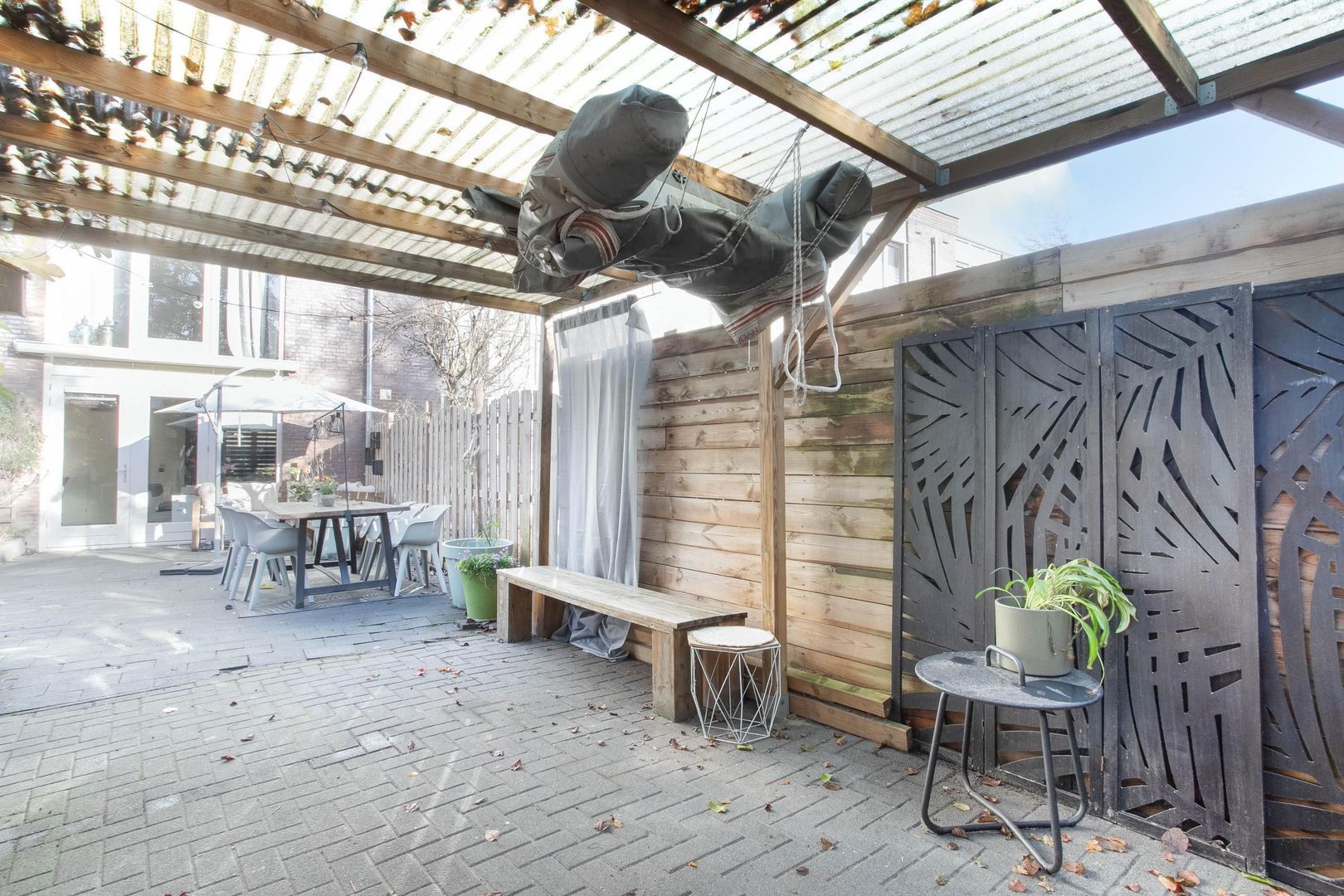 Ruime, zonnige achtertuin op het zuiden met overkapping, achterom en vrijstaande houten berging.