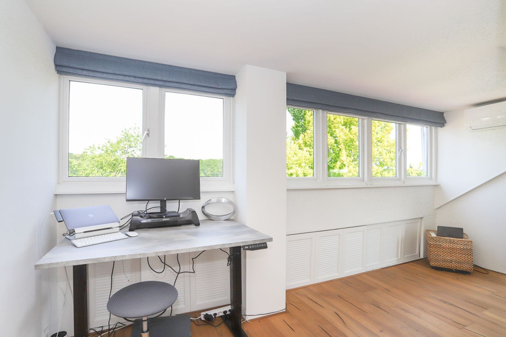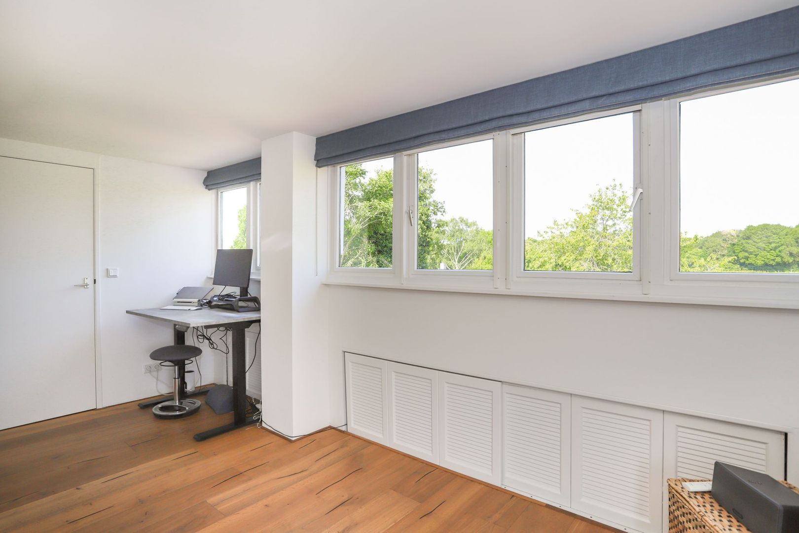 Tweede verdieping: Overloop. Hier is de derde slaapkamer gelegen die eventueel ook gebruikt kan worden als werkplek of hobbyruimte. De kamer is voorzien van een dakkapel over de gehele breedte en veel bergruimte achter de knieschotten. Ook hier is op de gehele tweede verdieping een nieuwe parketvloer gelegd (2022).