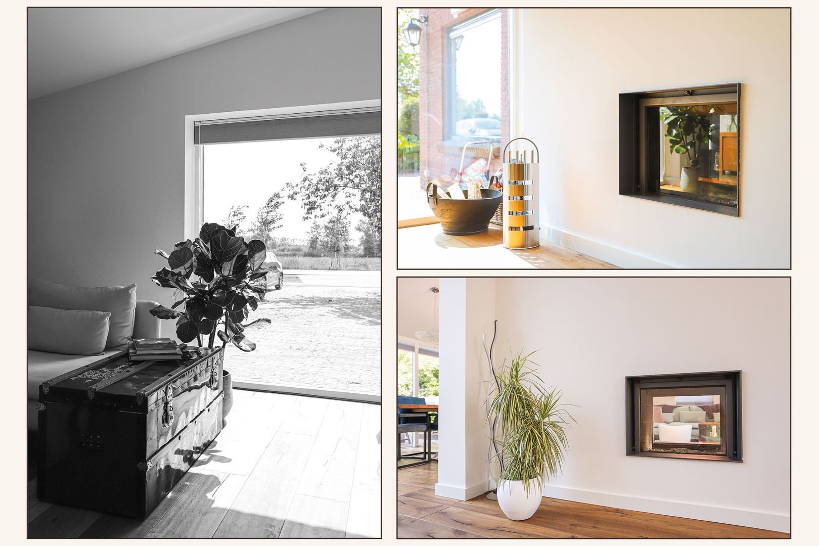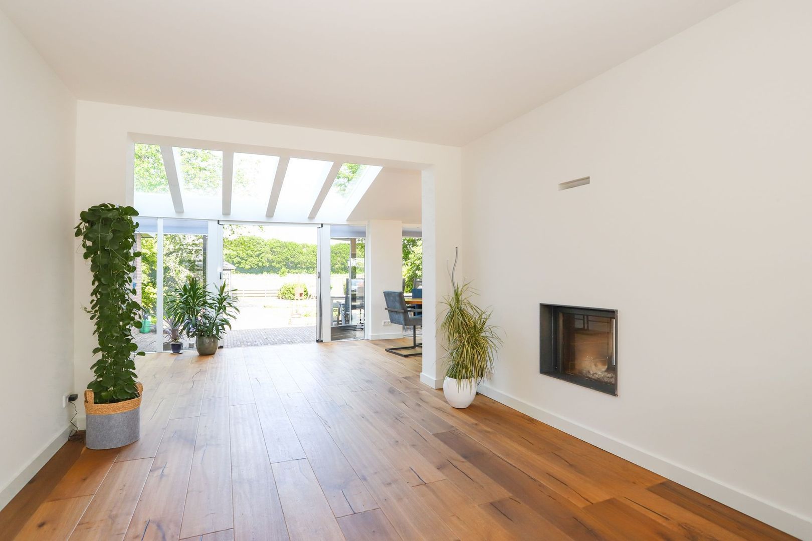 Begane grond: Entree met toilet en trap naar de kelder en de eerste verdieping. De woon- en eetkamer met open woonkeuken zijn zeer ruim van formaat en goed onderhouden. Op de gehele begane grond ligt een nieuwe parketvloer en de wanden en plafonds zijn strak afgewerkt. Door de vele raampartijen zijn alle ruimtes hier fijn licht! Wanneer je de woonkamer binnen komt tref je de eerste zithoek aan met uitzicht op de voortuin en de weilanden. In de tussenmuur naar de tweede zithoek is de openhaard gesitueerd, welke glas heeft aan twee zijden, waardoor deze ook zichtbaar is vanuit de tweede zithoek. Wanneer je doorloopt kom je in de open woonkeuken uit. Deze is voorzien van een moderne keuken met veel bergruimte en inbouwapparatuur zoals een inductiekookplaat, afzuigkap, oven, combi-oven/magnetron, koelvriescombinaties, vaatwasser, Quooker en een klimaatkast.
