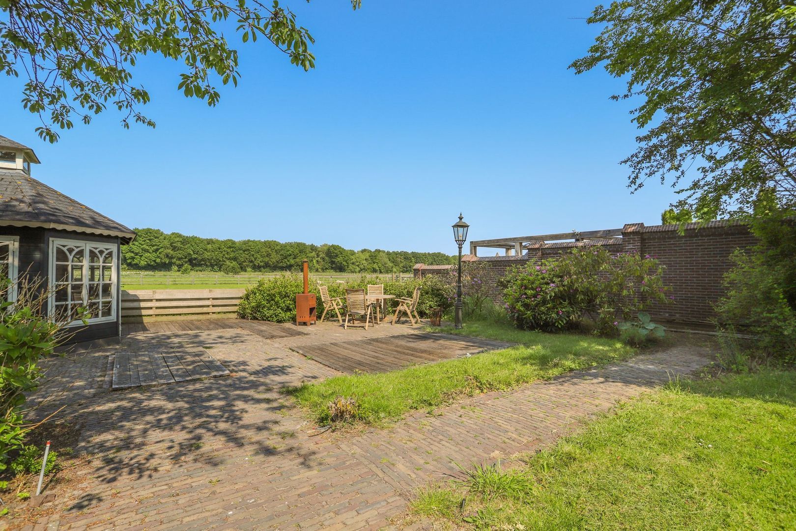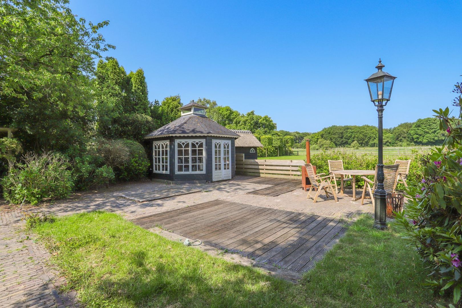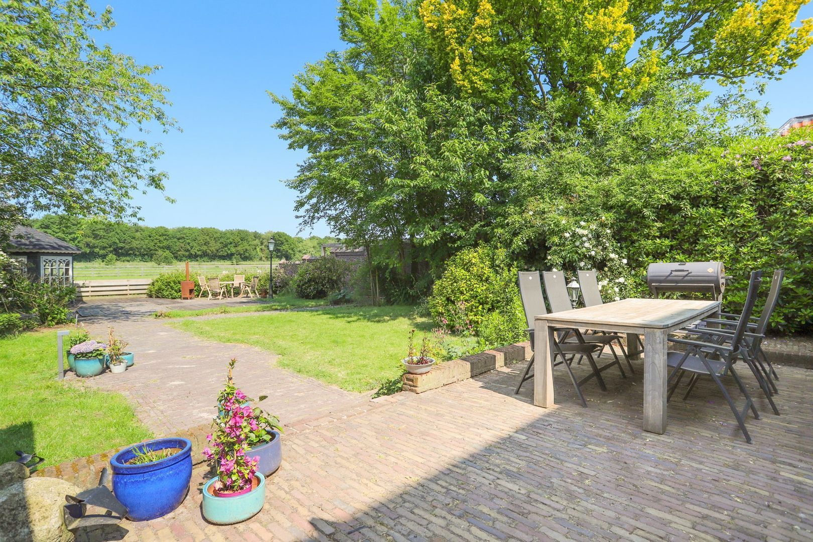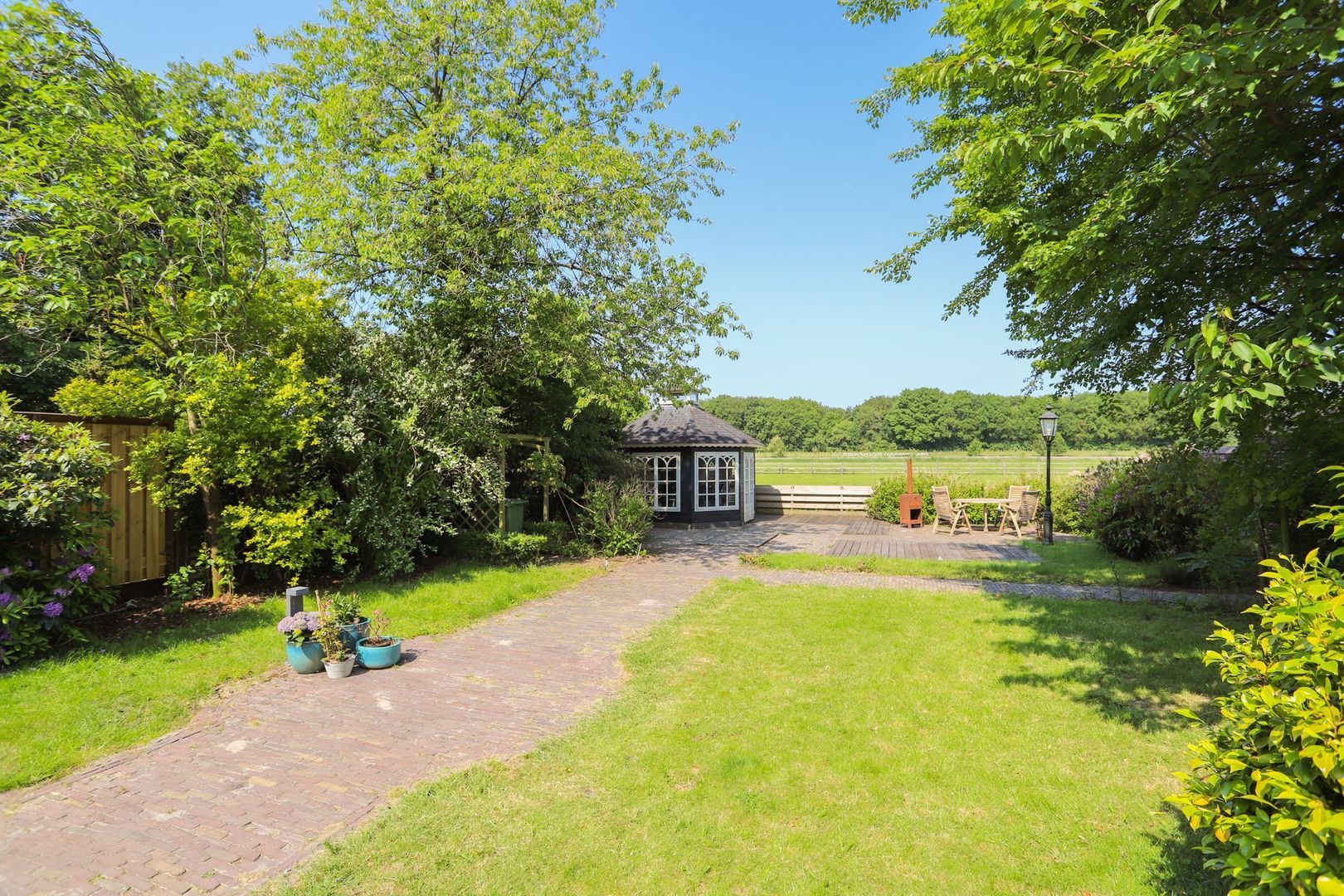 De achtertuin: Deze is voorzien van verschillende bestrating, terrassen, grasvelden, plantenborders en bomen. Door de diverse terrassen kun je altijd in de zon óf in de schaduw genieten van het weidse uitzicht! Achterin de tuin is tevens een knus tuinhuisje aanwezig met vrij uitzicht op de weilanden. De schuur is zowel vanuit de voortuin als de achtertuin bereikbaar.