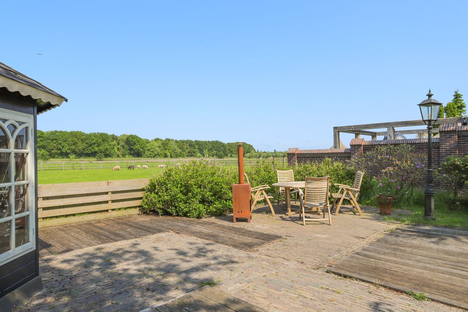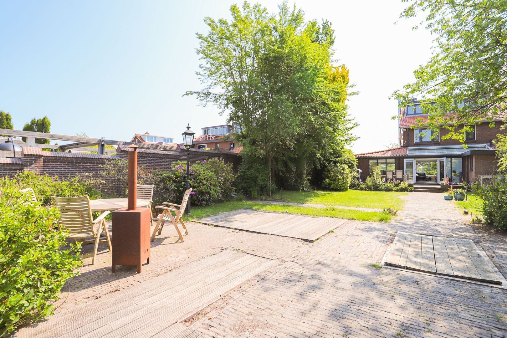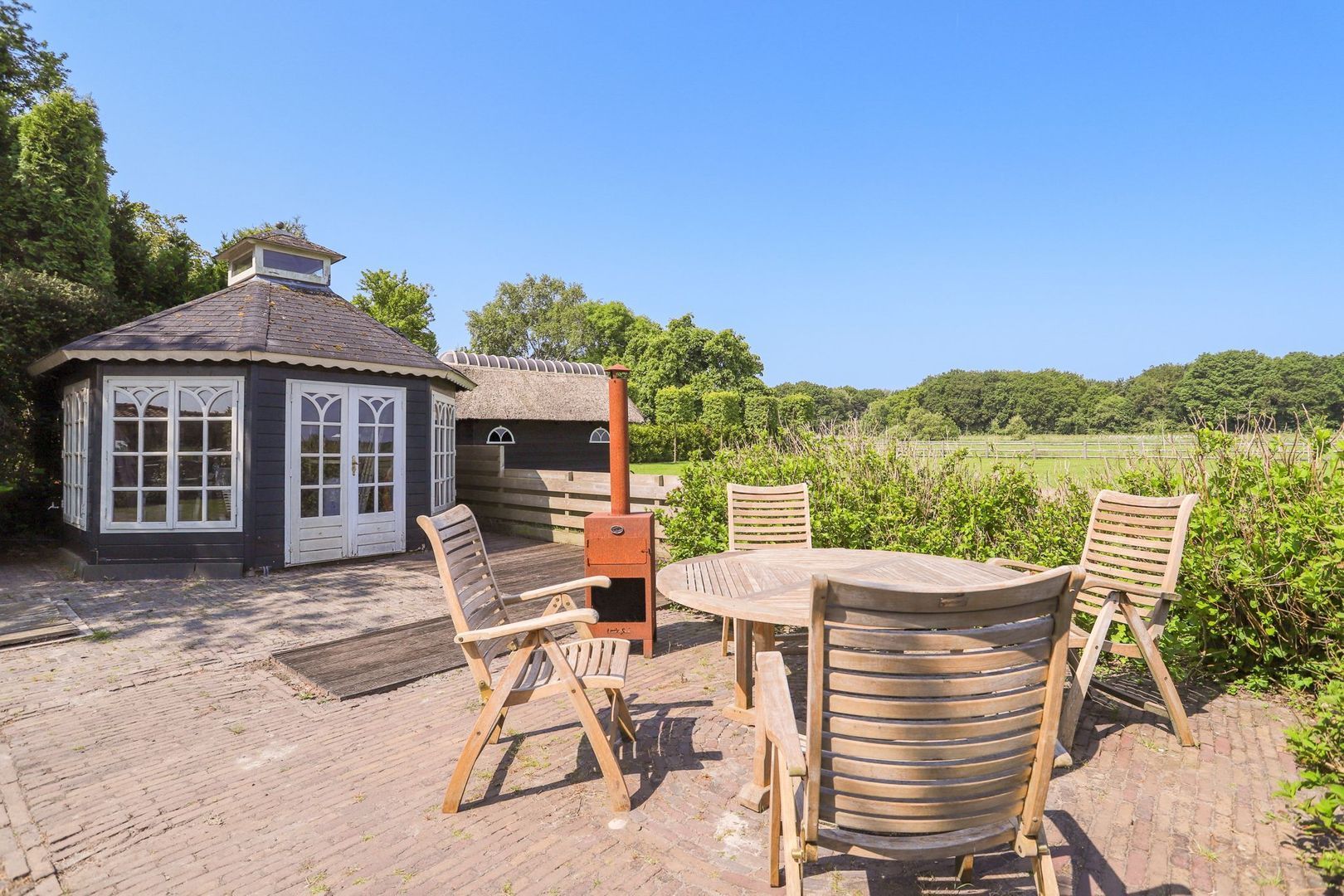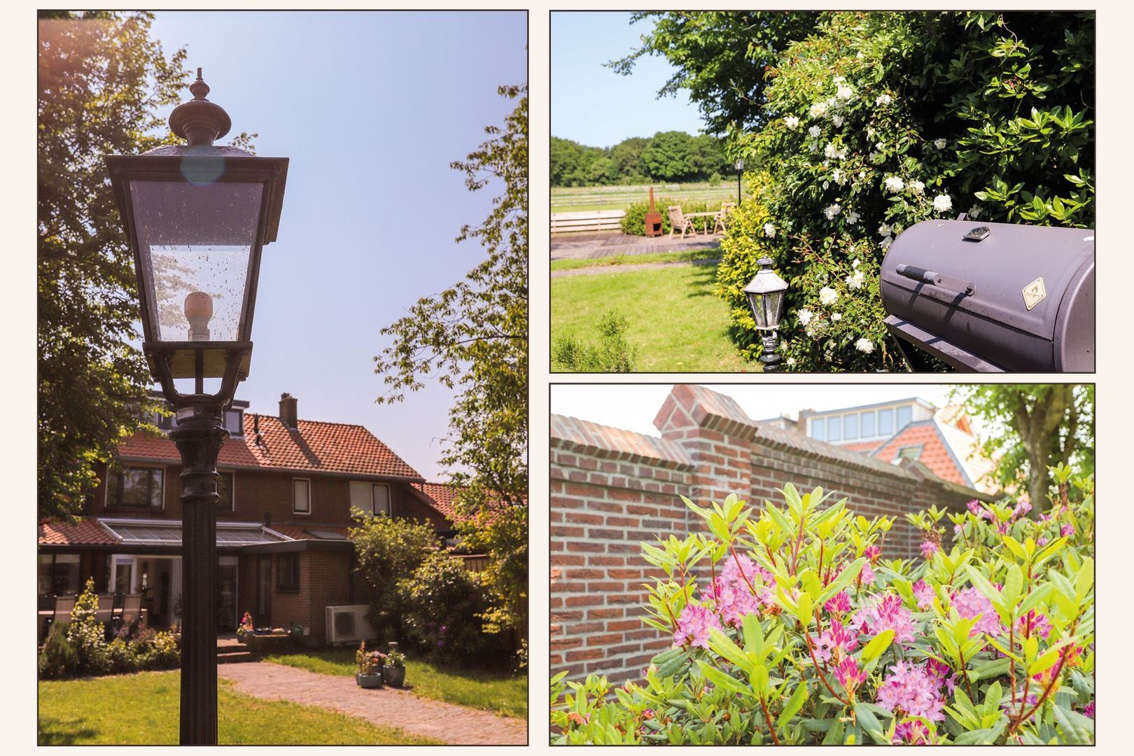 De achtertuin: Deze is voorzien van verschillende bestrating, terrassen, grasvelden, plantenborders en bomen. Door de diverse terrassen kun je altijd in de zon óf in de schaduw genieten van het weidse uitzicht! Achterin de tuin is tevens een knus tuinhuisje aanwezig met vrij uitzicht op de weilanden. De schuur is zowel vanuit de voortuin als de achtertuin bereikbaar.