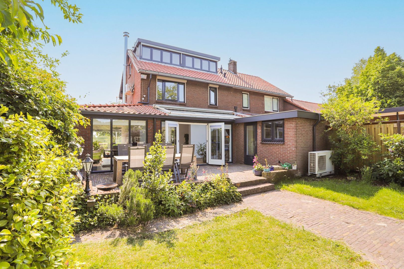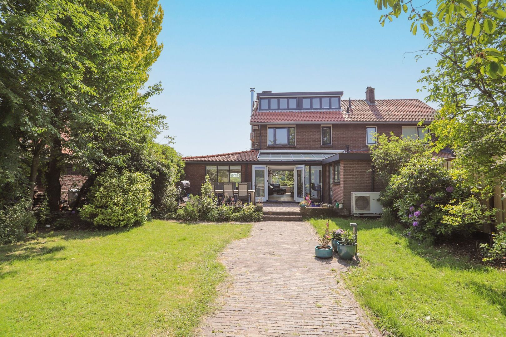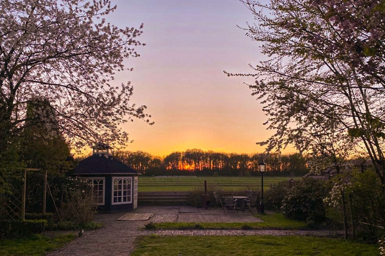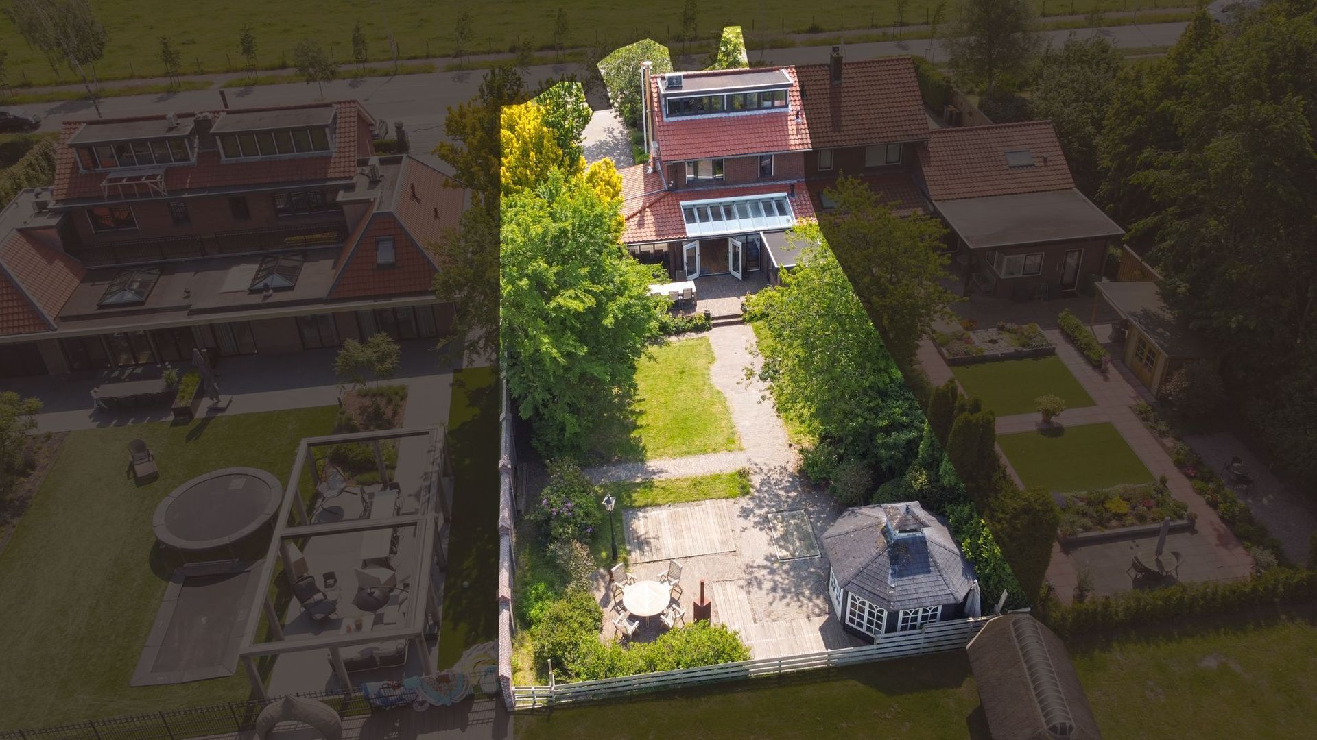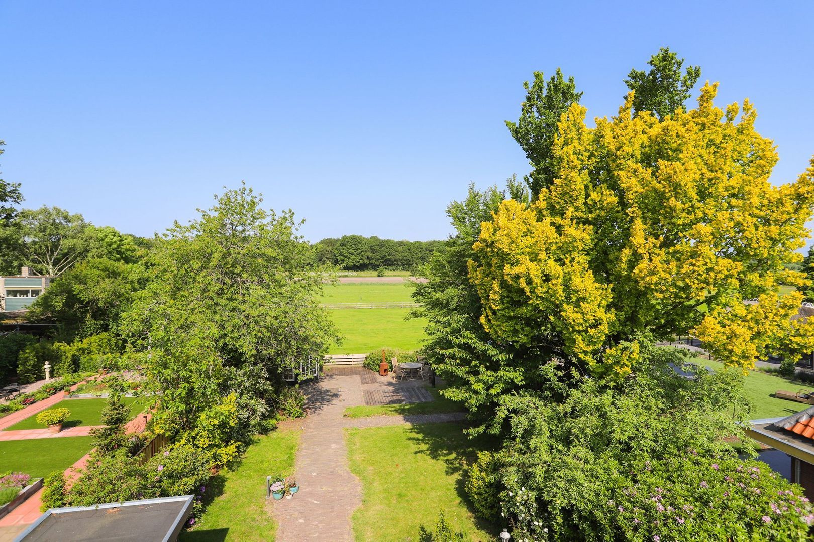 De achtertuin: Deze is voorzien van verschillende bestrating, terrassen, grasvelden, plantenborders en bomen. Door de diverse terrassen kun je altijd in de zon óf in de schaduw genieten van het weidse uitzicht! Achterin de tuin is tevens een knus tuinhuisje aanwezig met vrij uitzicht op de weilanden. De schuur is zowel vanuit de voortuin als de achtertuin bereikbaar.