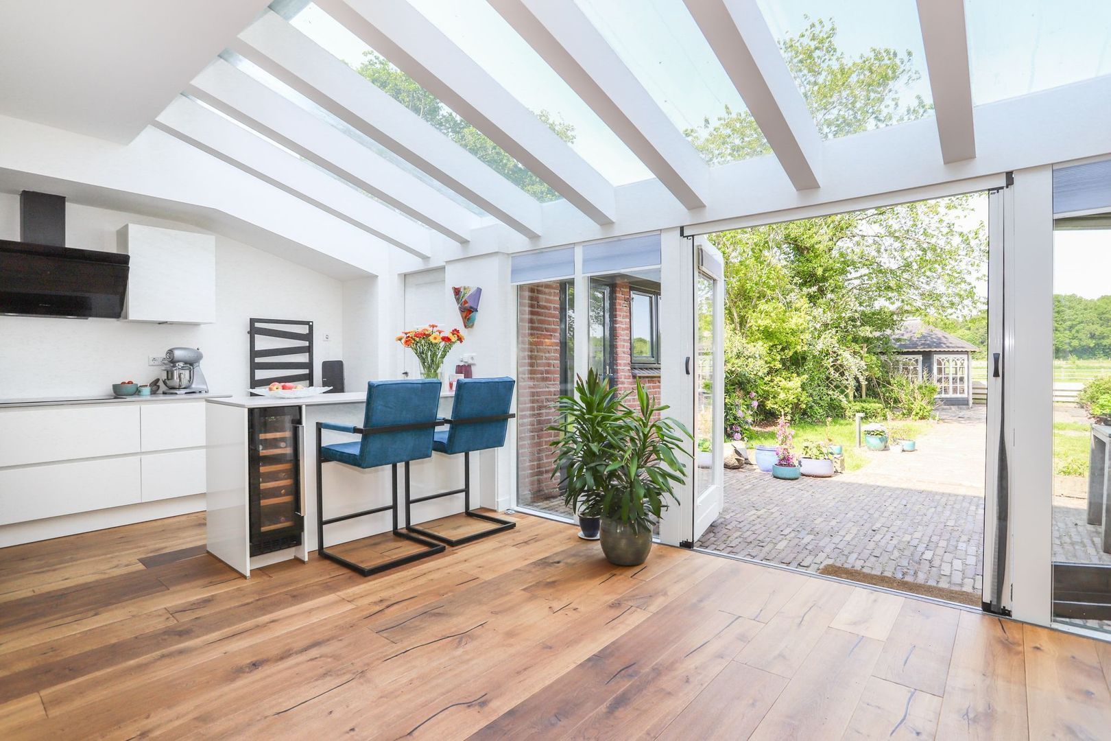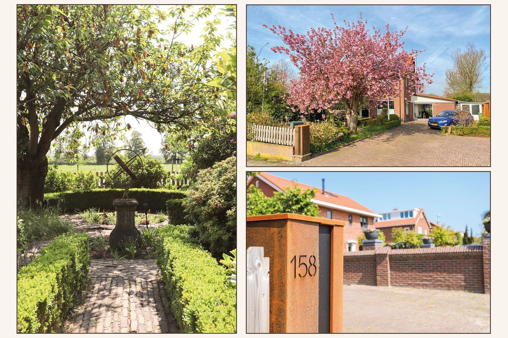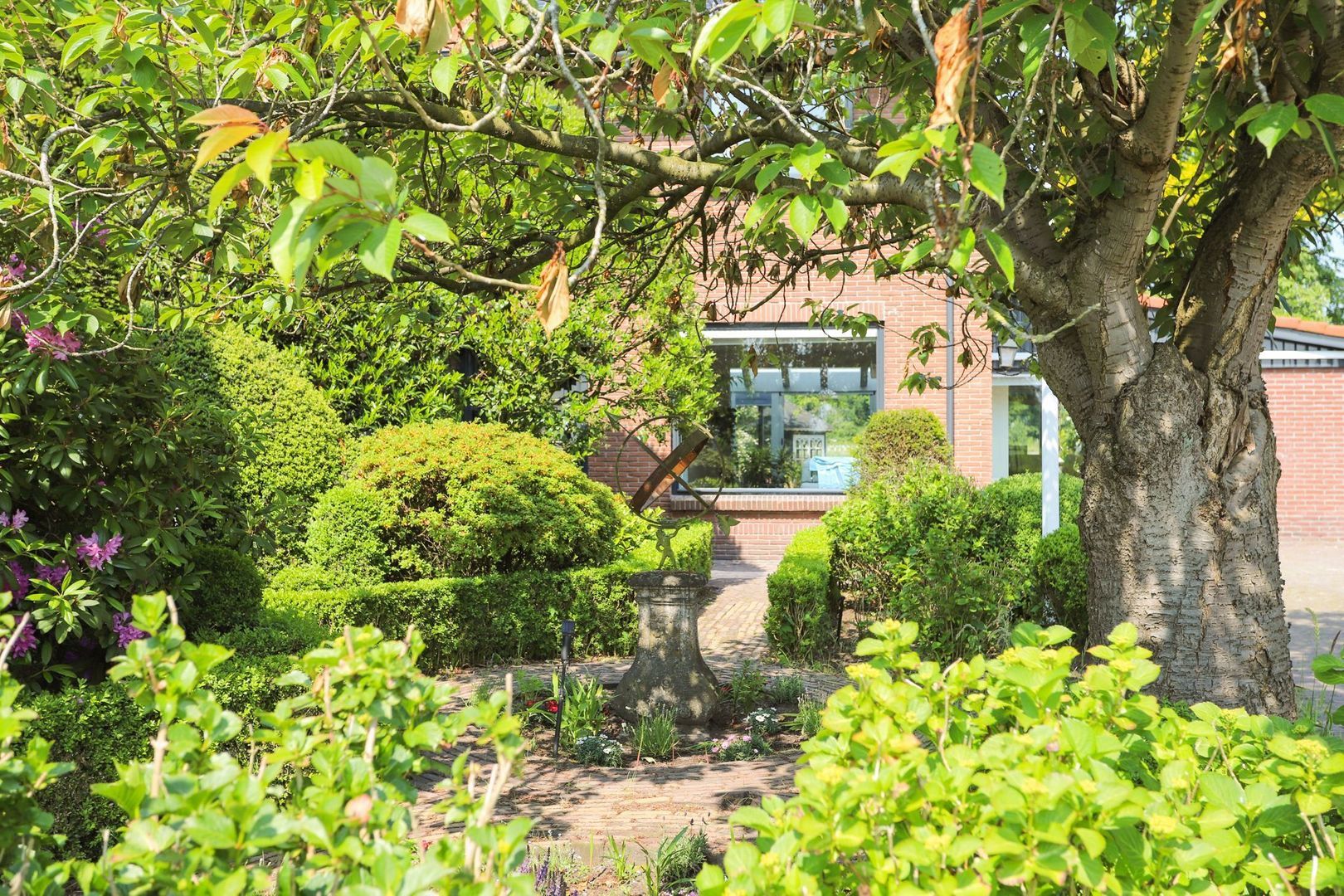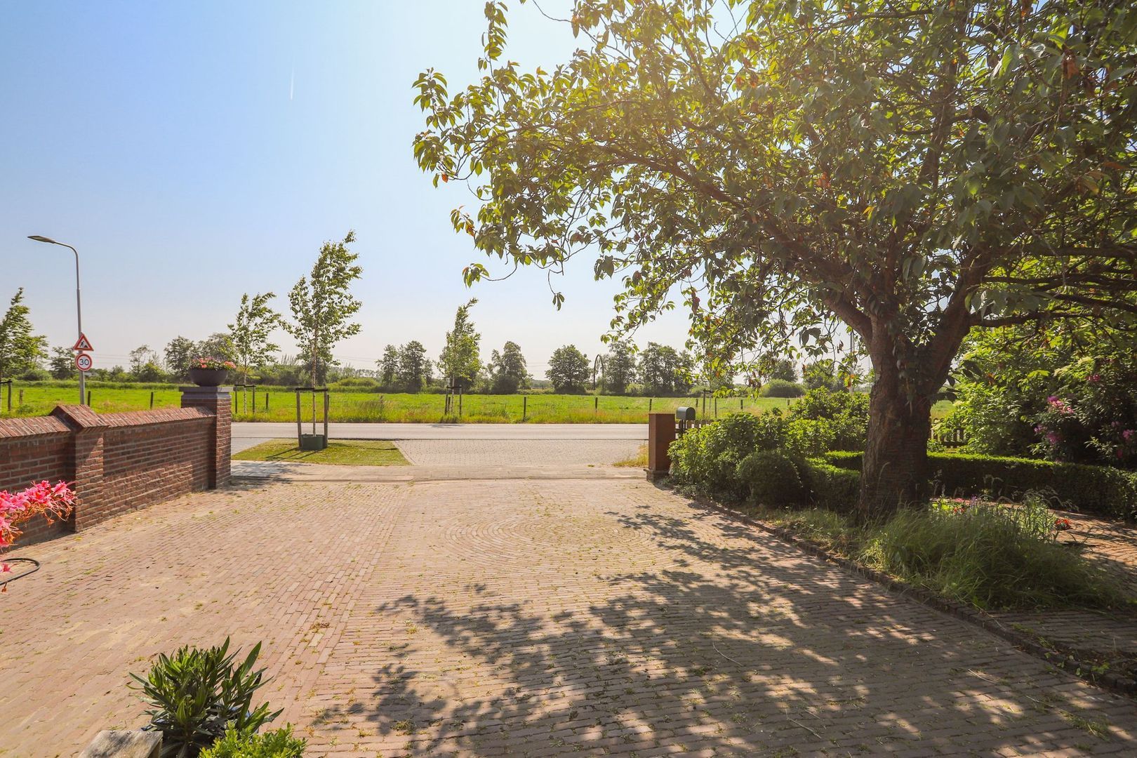 De achtertuin: Deze is voorzien van verschillende bestrating, terrassen, grasvelden, plantenborders en bomen. Door de diverse terrassen kun je altijd in de zon óf in de schaduw genieten van het weidse uitzicht! Achterin de tuin is tevens een knus tuinhuisje aanwezig met vrij uitzicht op de weilanden. De schuur is zowel vanuit de voortuin als de achtertuin bereikbaar.