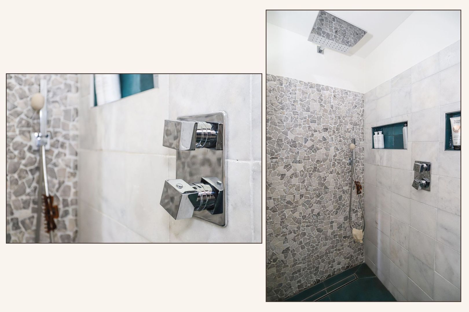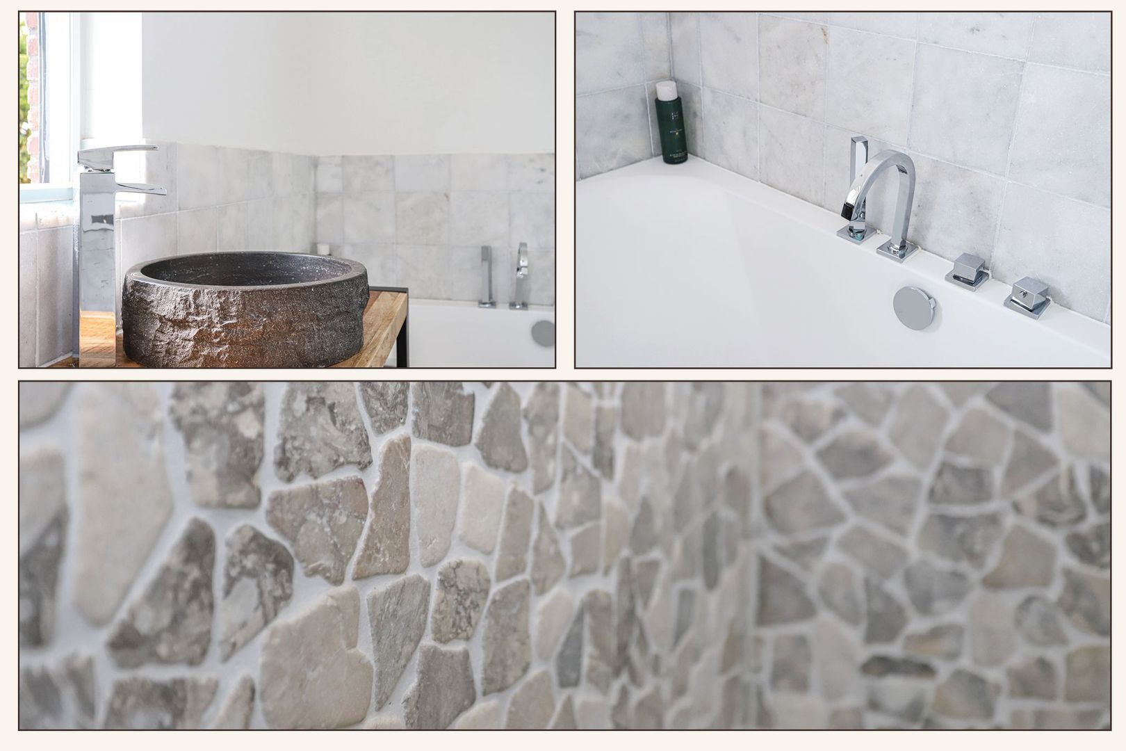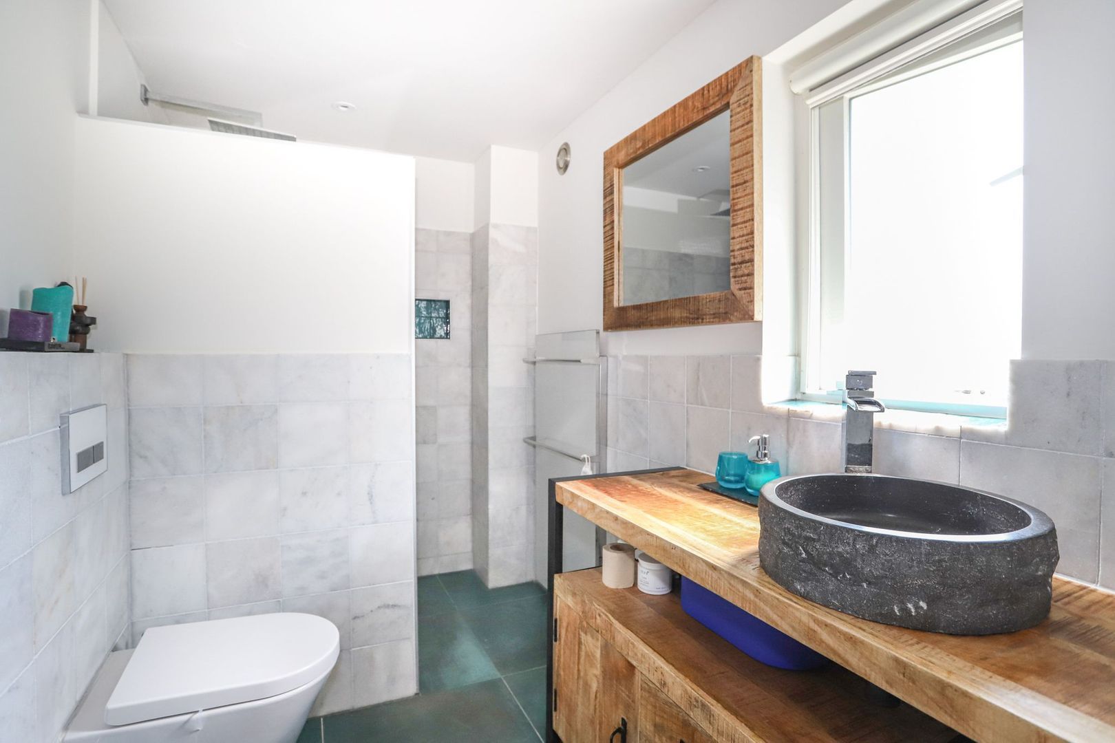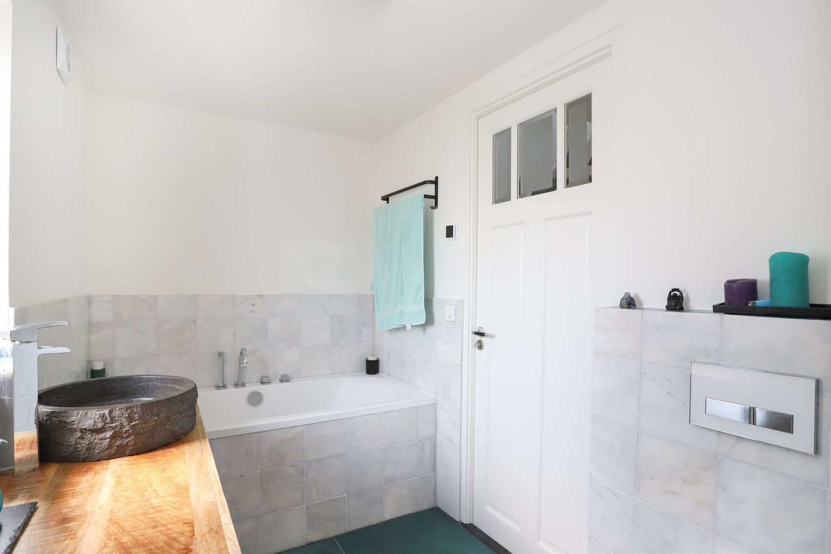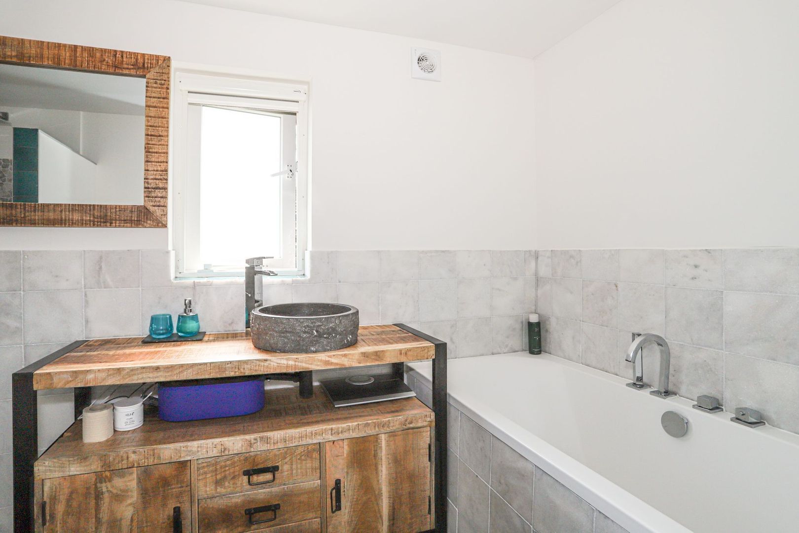 De moderne badkamer is uitgevoerd met net tegelwerk en is voorzien van een ligbad, toilet, inloopdouche en een wastafel met meubel.