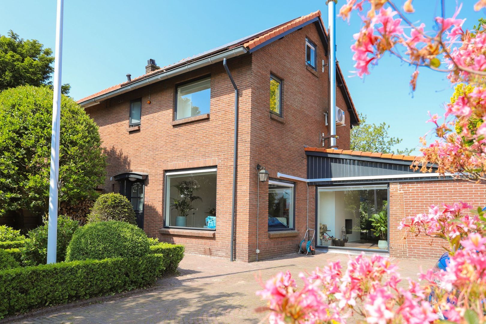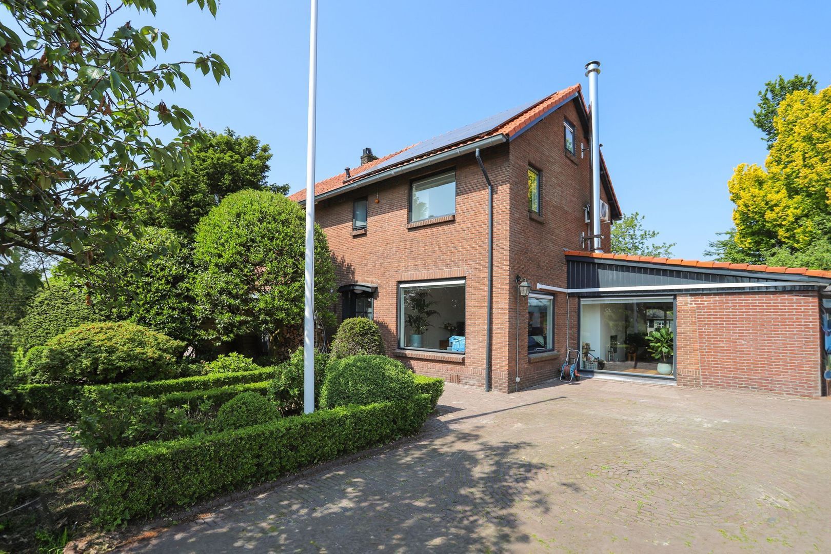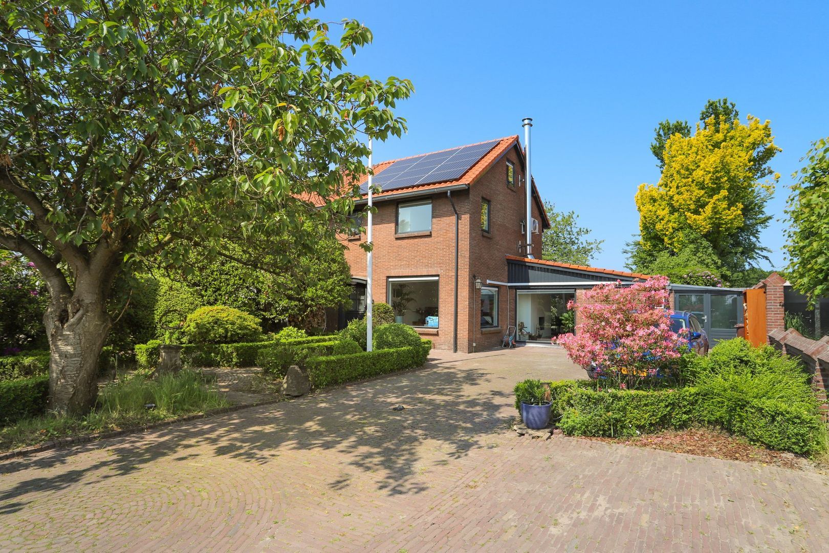 Voortuin: Op de ruime eigen oprit is er veel ruimte om je eigen auto's en fietsen te parkeren. Er is een laadpaal geplaatst voor een elektrische auto. Daarnaast is het een groene tuin met verschillende plantenborders en bomen. De voortuin is gelegen op het oosten.