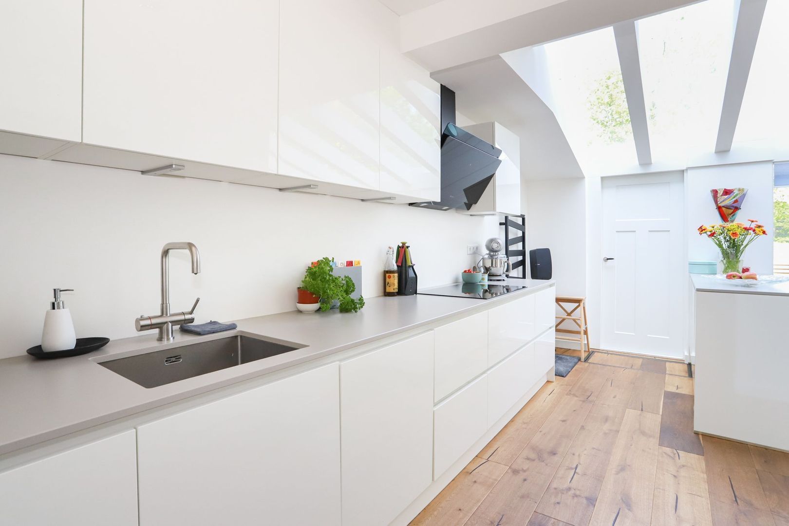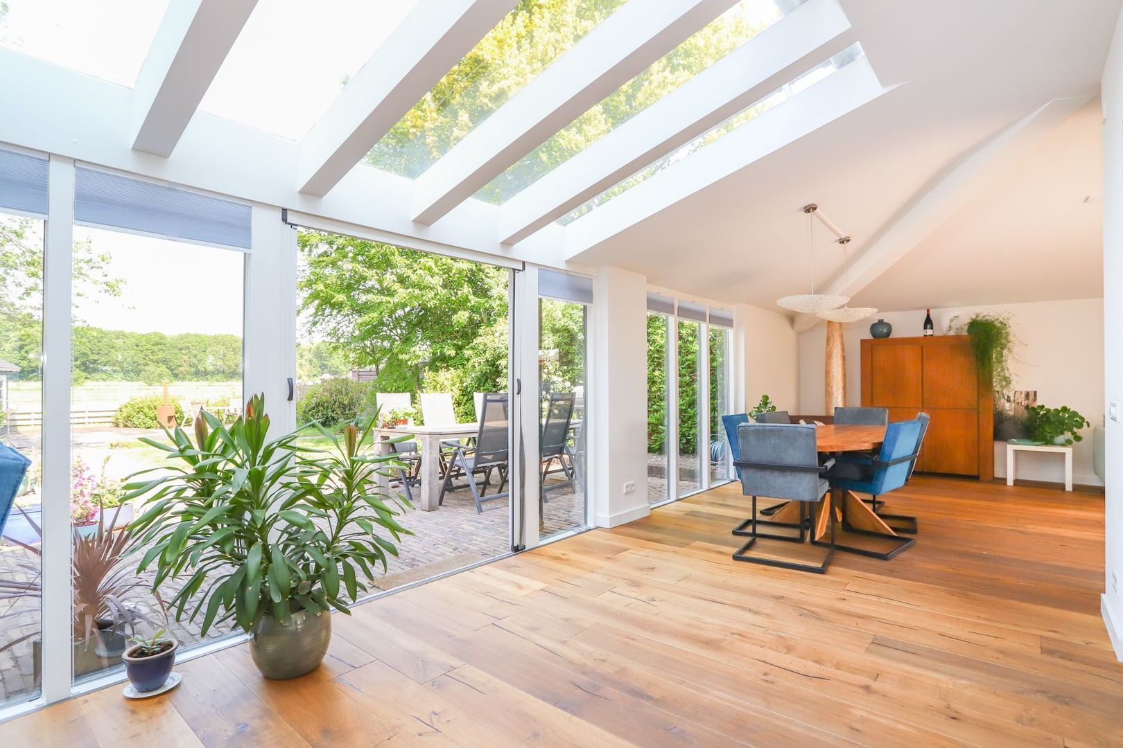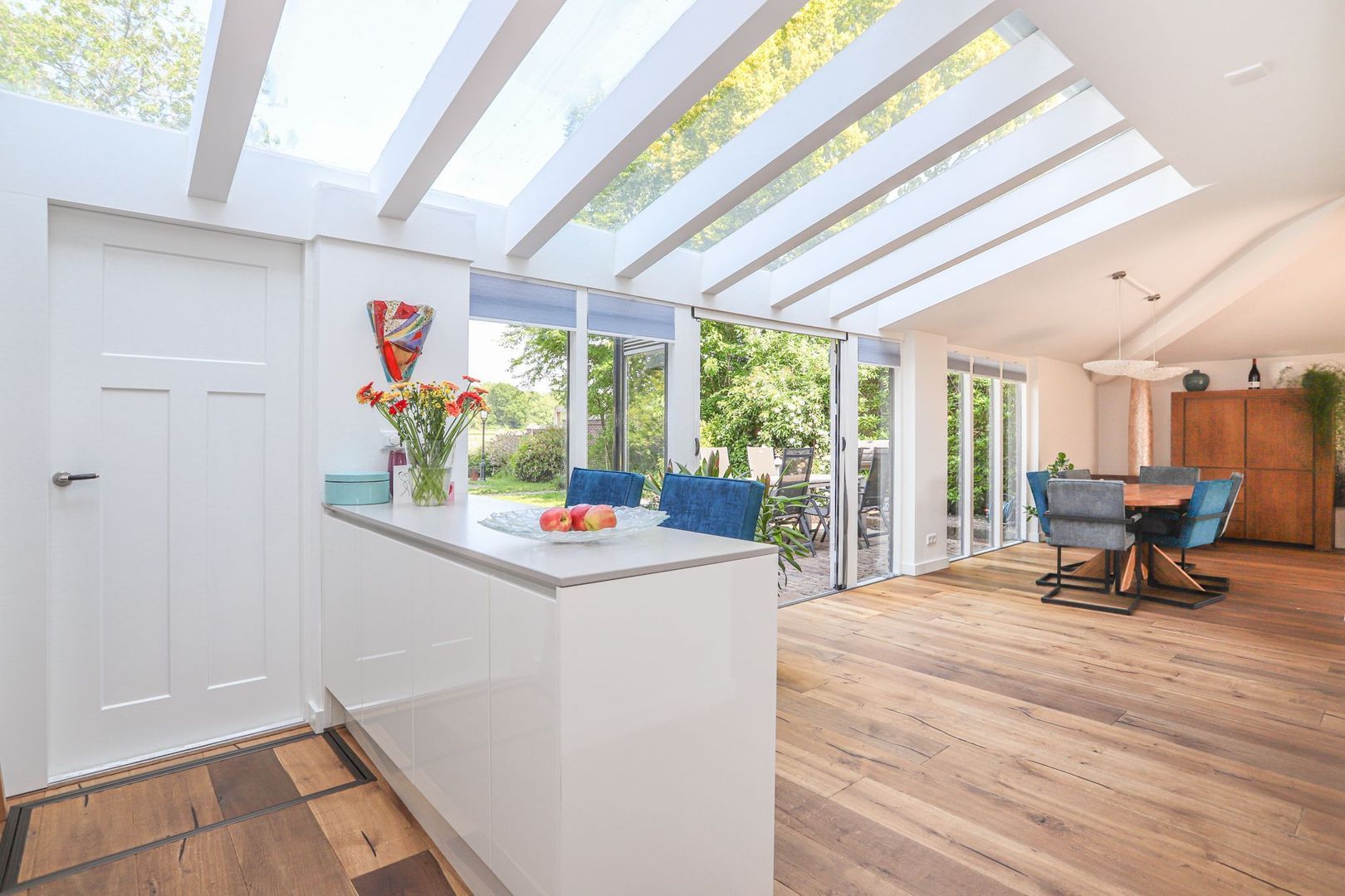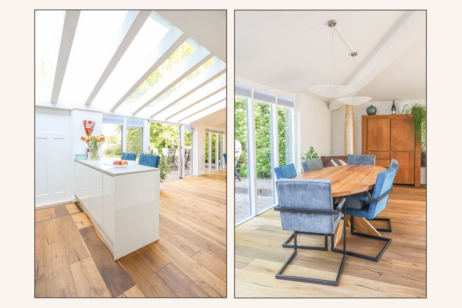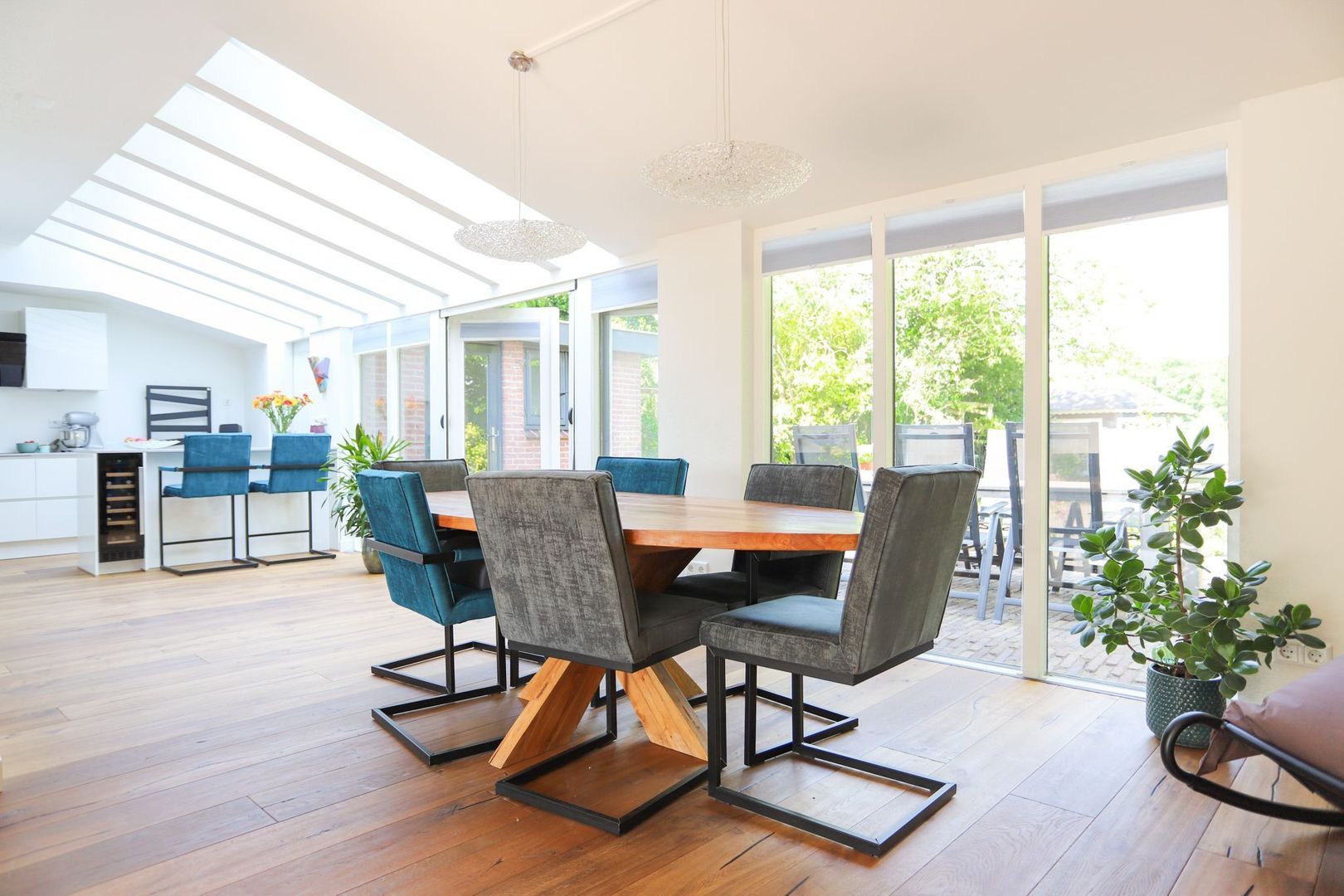 De eetkamer, voorzien van een prettige lichtstraat, verbindt de keuken, eerste en tweede zithoek. In de eetkamer is er voldoende ruimte voor een grote eettafel voor het hele gezin en/of visite! De tweede zithoek is ook heerlijk licht door de grote raampartij! Via de openslaande deuren is de royale achtertuin, gelegen op het westen, toegankelijk.