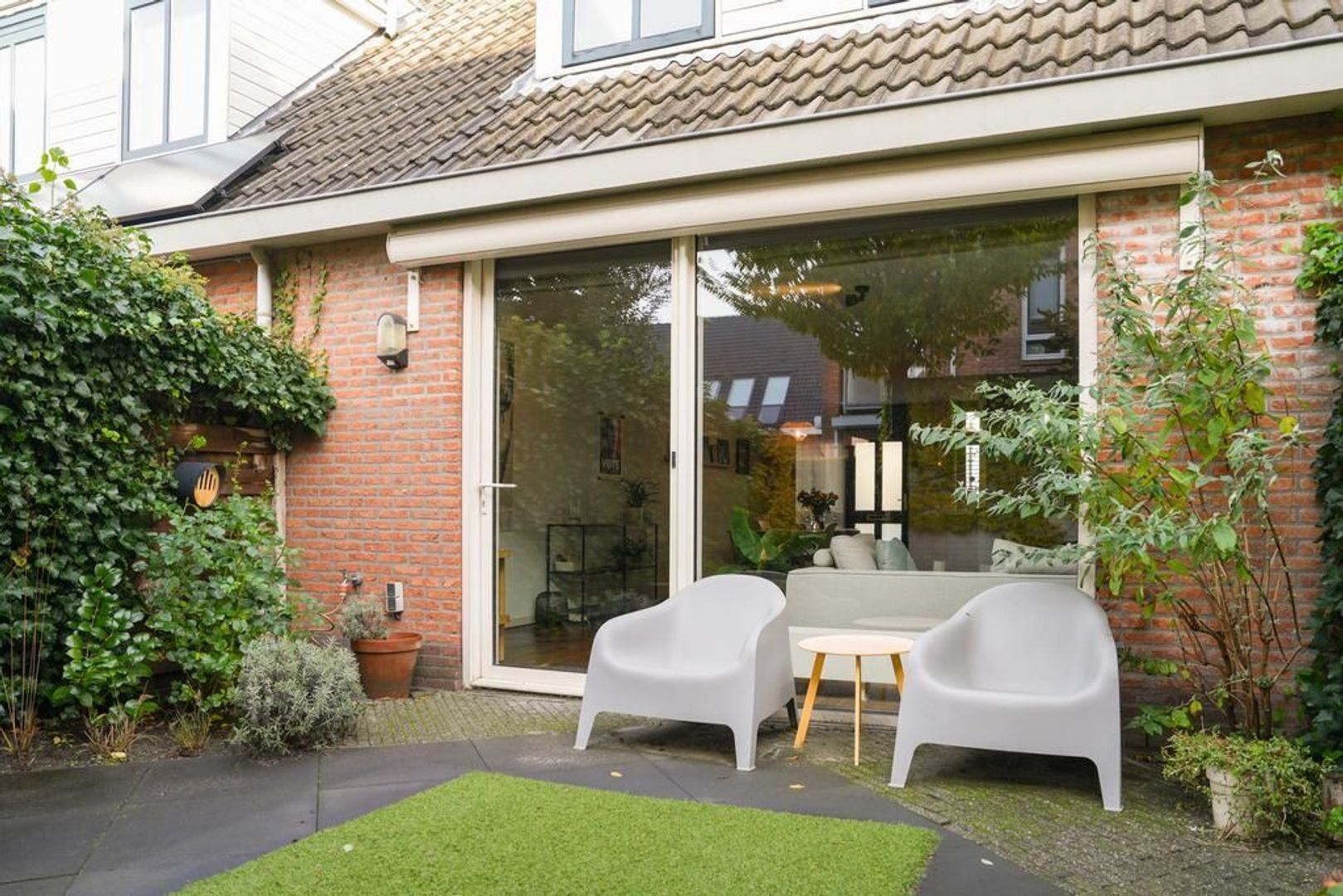 De achtertuin is gelegen op het zonnige zuiden en beschikt over bestrating, kunstgrasmat en een stenen berging. Via de achterom is de eigen parkeerplaats op afgesloten terrein bereikbaar. Een tweede parkeerplaats behoort tot de mogelijkheden.