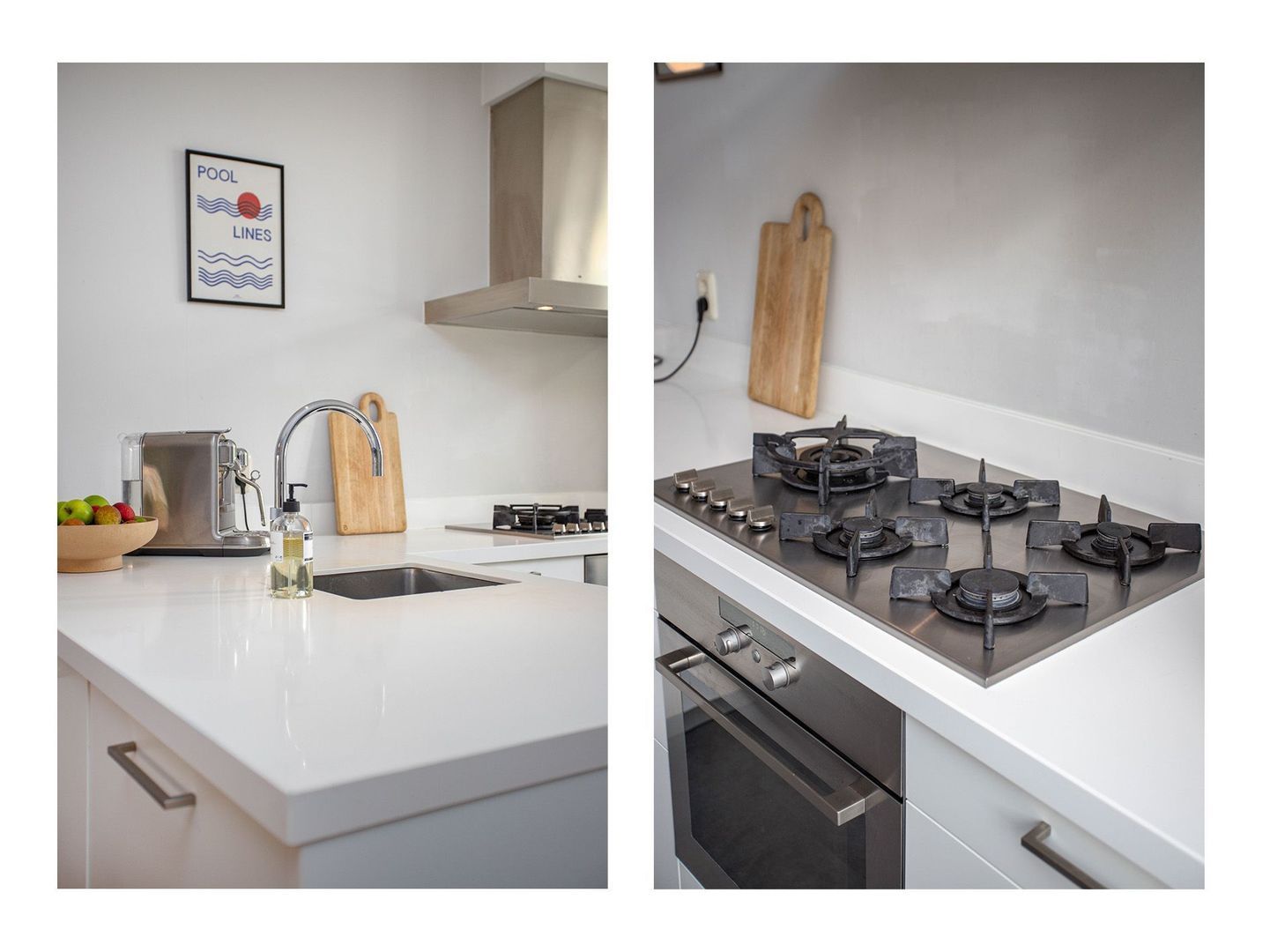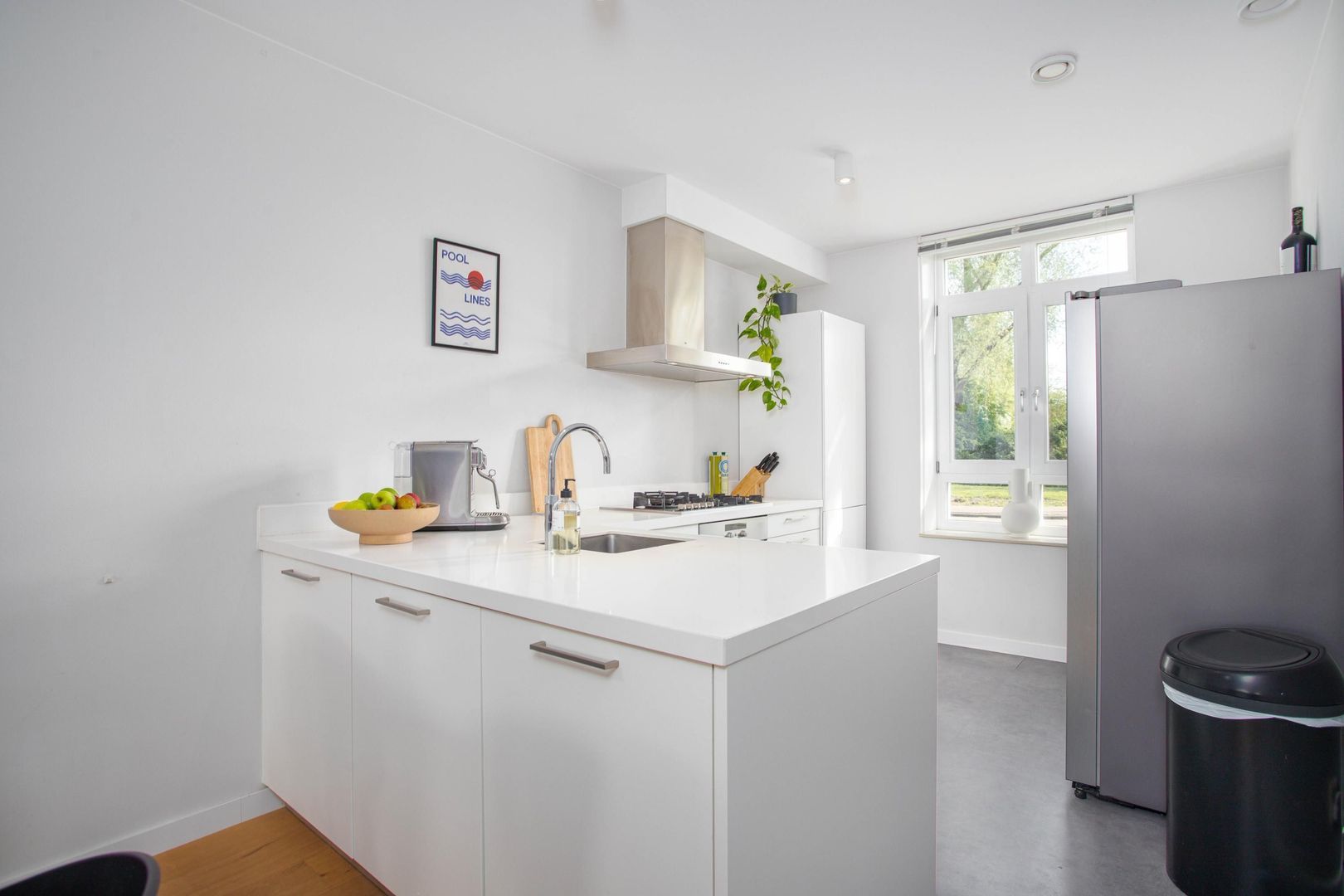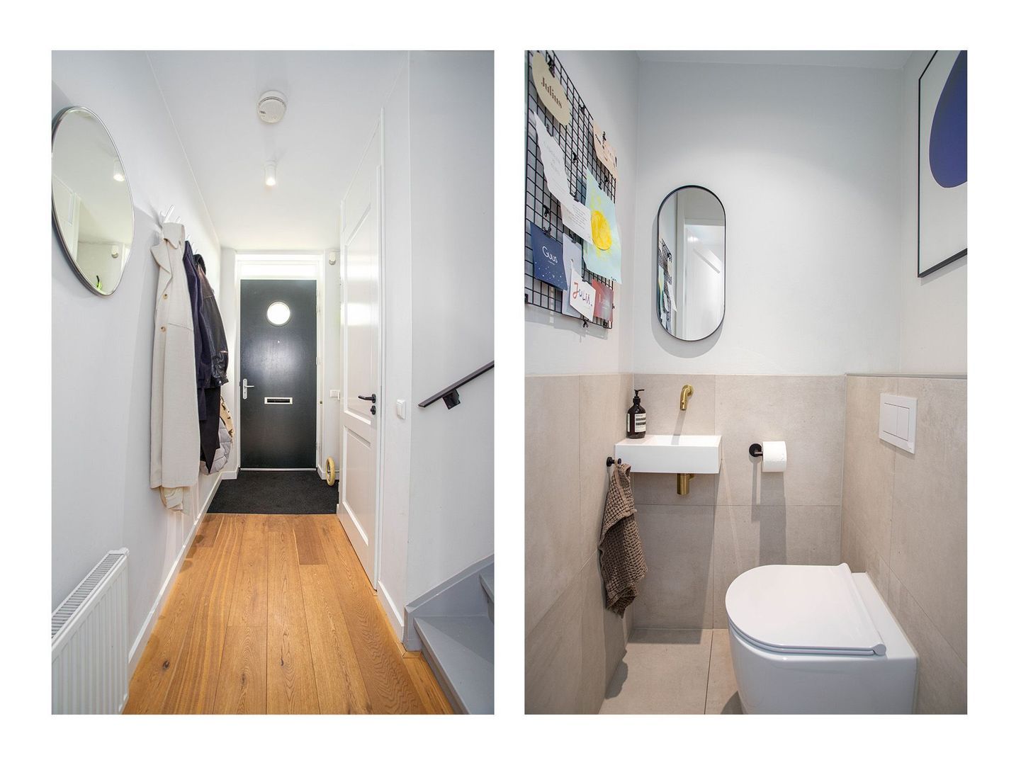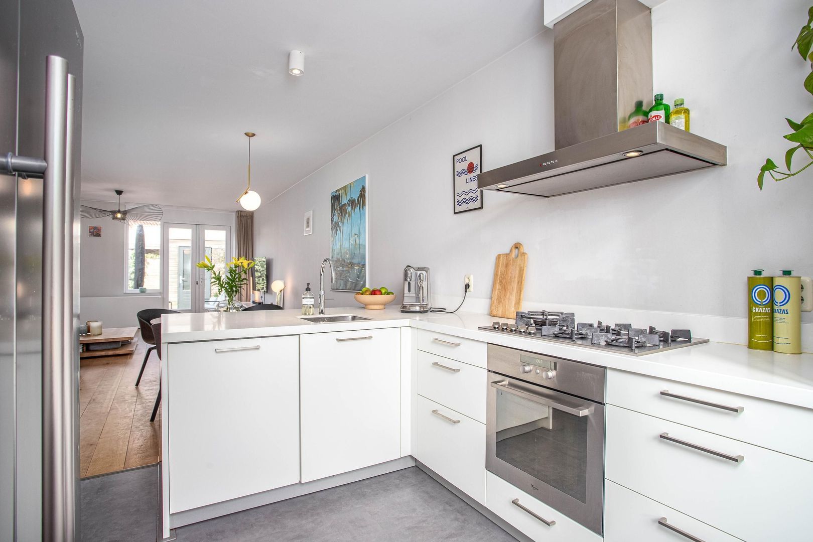 Begane grond: entree, hal met toilet, meterkast en trap naar 1e verdieping. Bij binnenkomst in de woonkamer krijg je direct een gevoel van licht en ruimte. Met een totale diepte van bijna 11 meter is hier volop leefruimte voor een gezin. De woonkamer is aan de achterzijde uitgebouwd, heeft openslaande deuren naar de tuin en een extra deur. De royale keuken bevindt zich aan de voorzijde. De keuken is uitgevoerd in hoogglans wit en voorzien van 5-pits gaskookplaat, heteluchtoven, afzuigkap, vaatwasser en koelkast. In de woonkamer en hal ligt een fraaie eiken vloer; in de keuken ligt een pvc-vloer.
